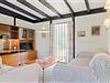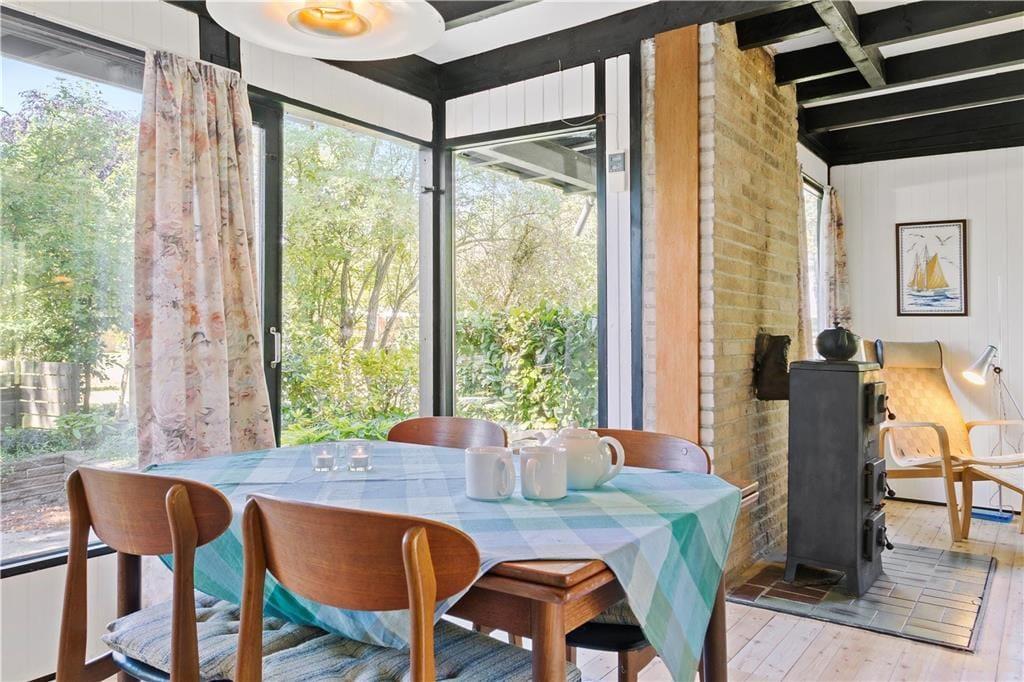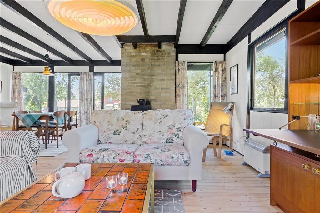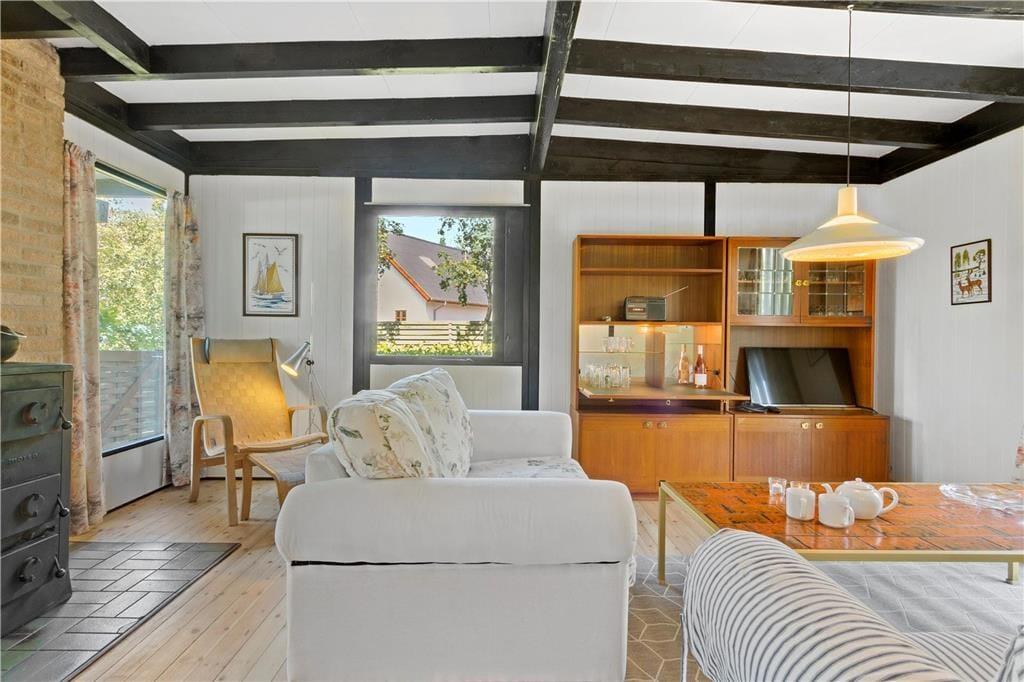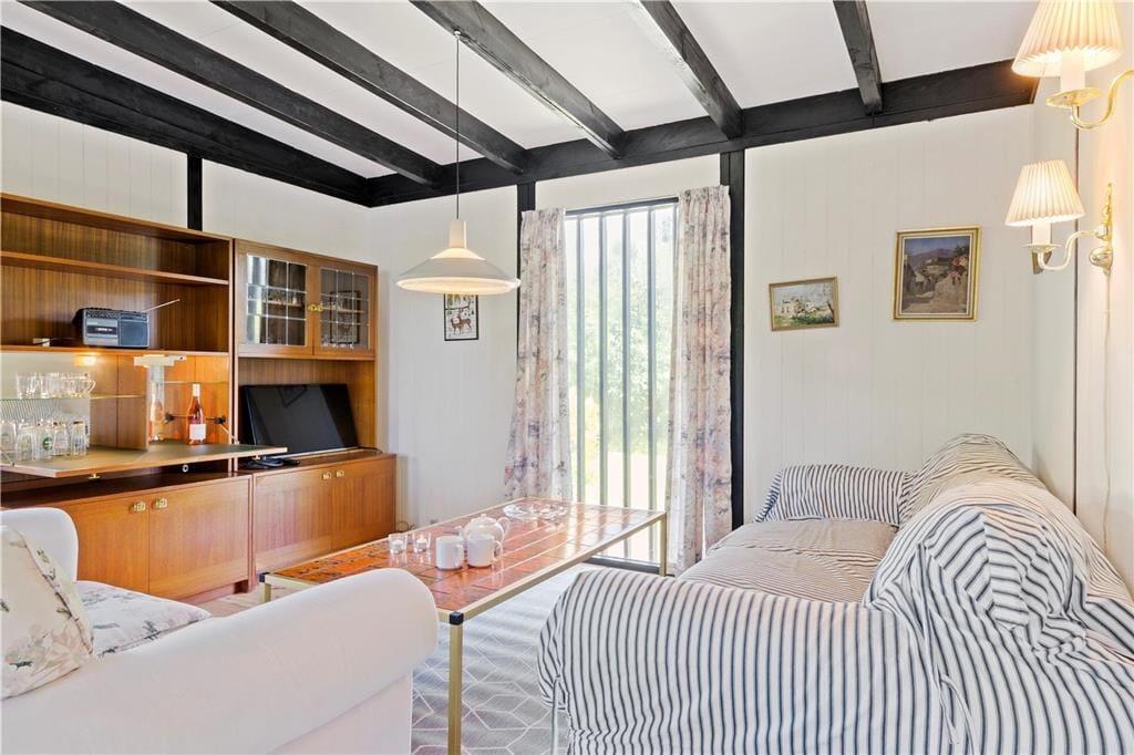 I stuen er der kakkelovn, sofaarrangement og spiseplads. TV kun med danske kanaler.