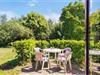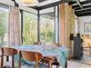 Fra køkken og spiseafdeling udgang til terrasser med træhavemøbler.