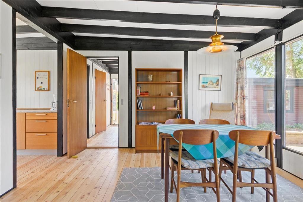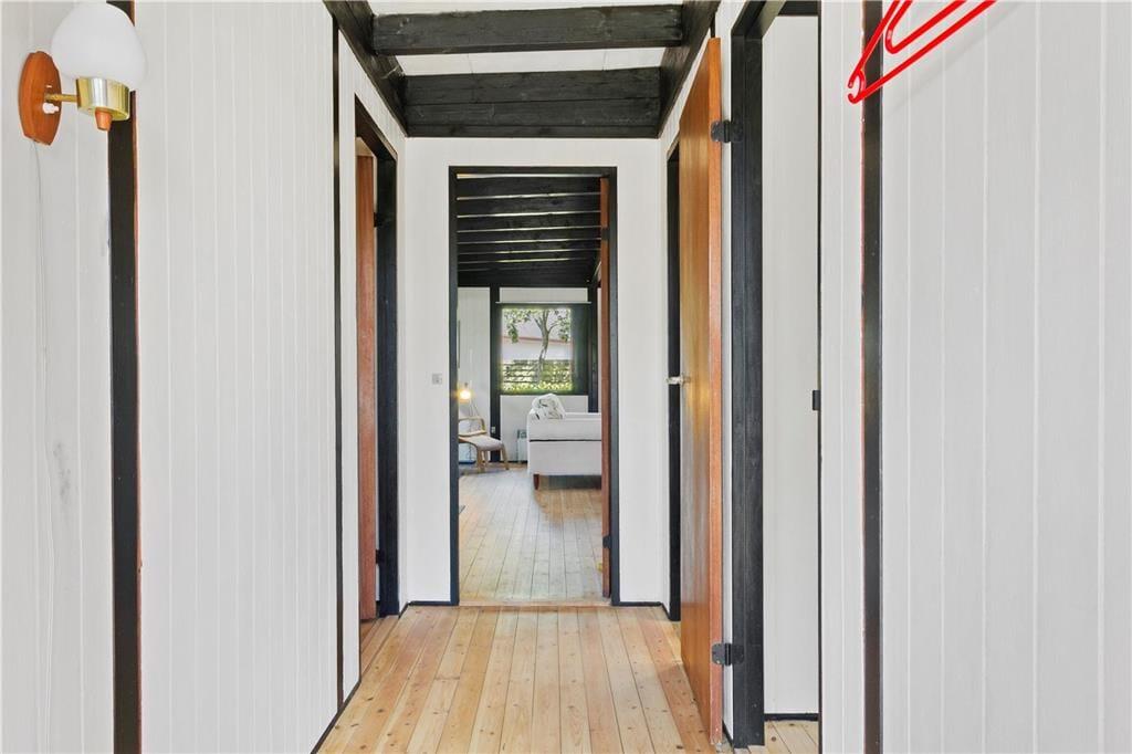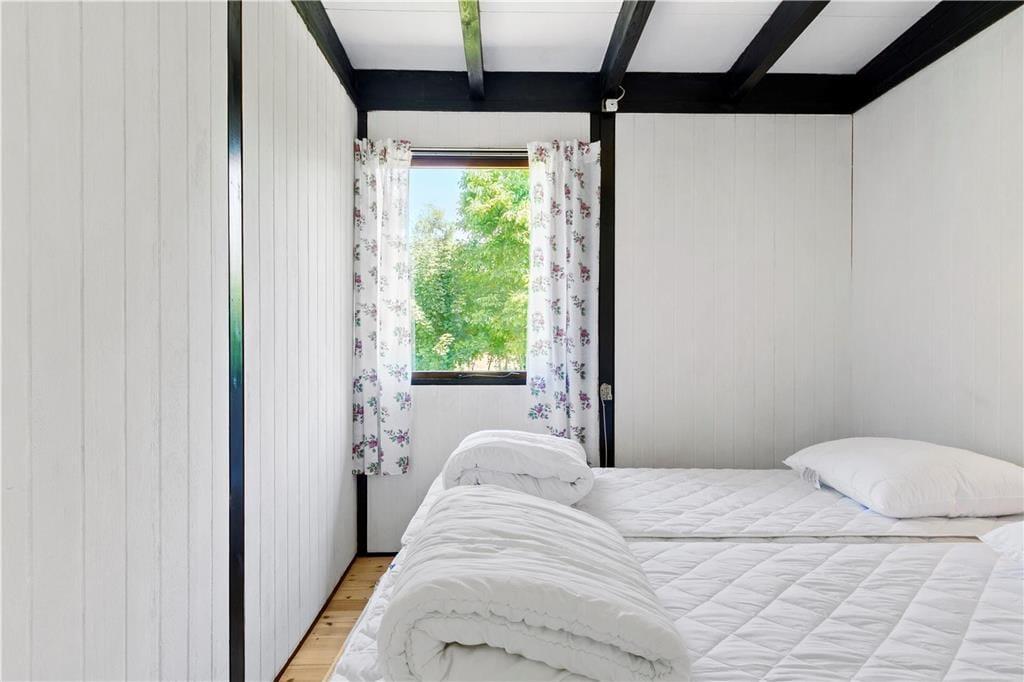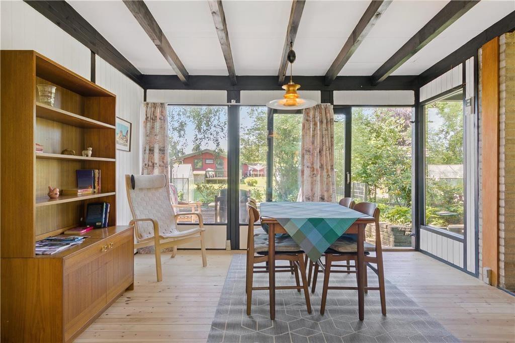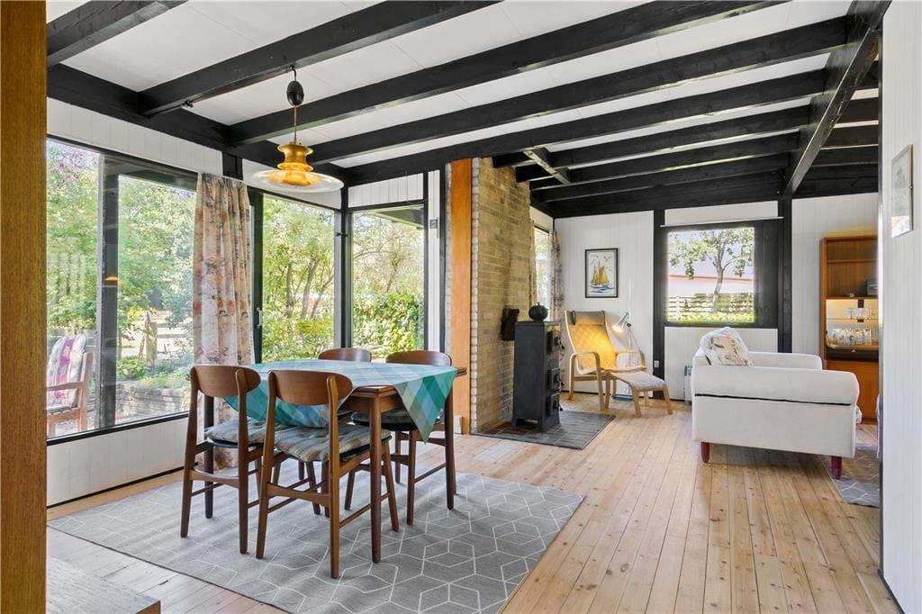 Huset er med hvidmalede vægge og lakerede gulve over det hele.