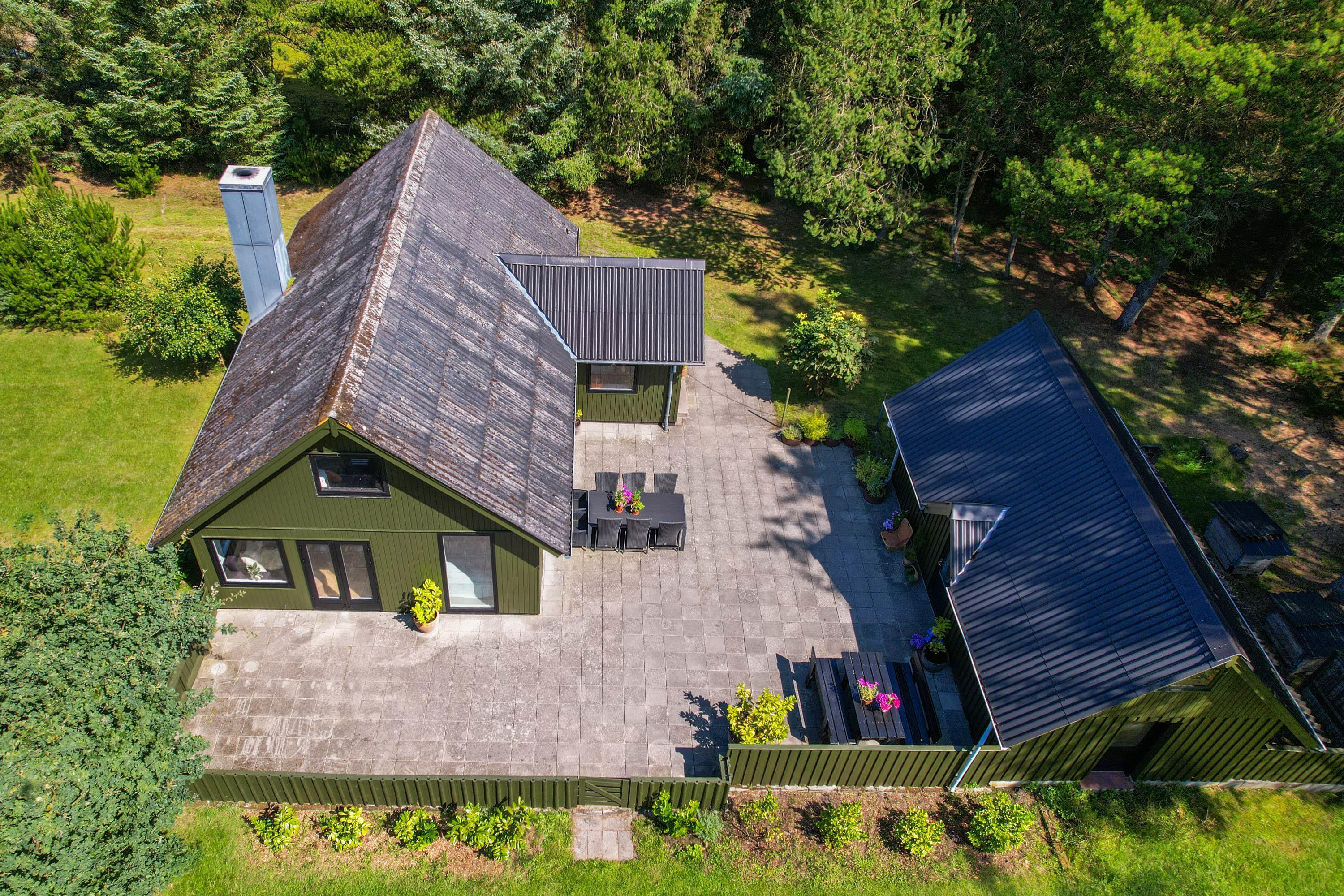 På den delvist afskærmede terrasse kan I sidde og nyde fuglesangen til morgenkaffen, og måske kigger skovens dyr forbi ( egern eller kronhjort ). Når sulten melder sig, kan der tændes op for gasgrillen og et lækkert måltid står hurtigt klar. Den store 2500 m2 grund er indhegnet så både børn og hunde kan løbe frit omkring.