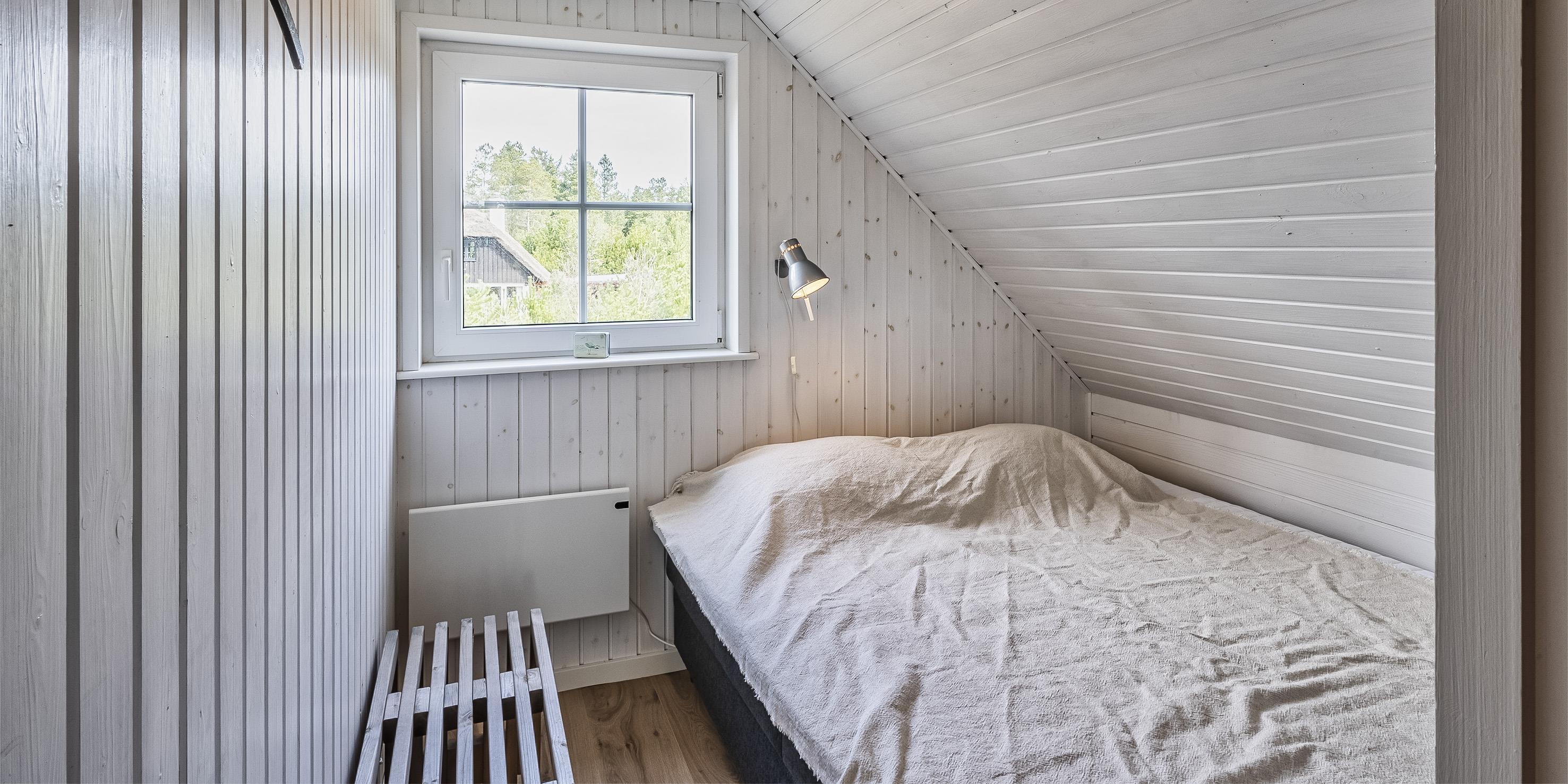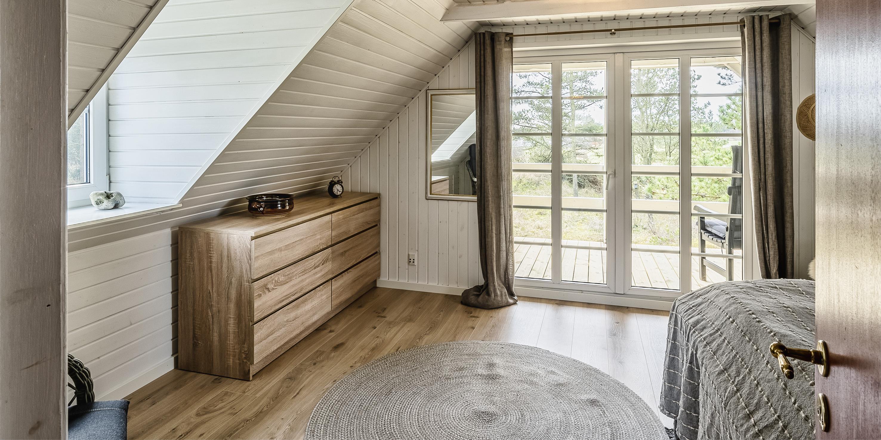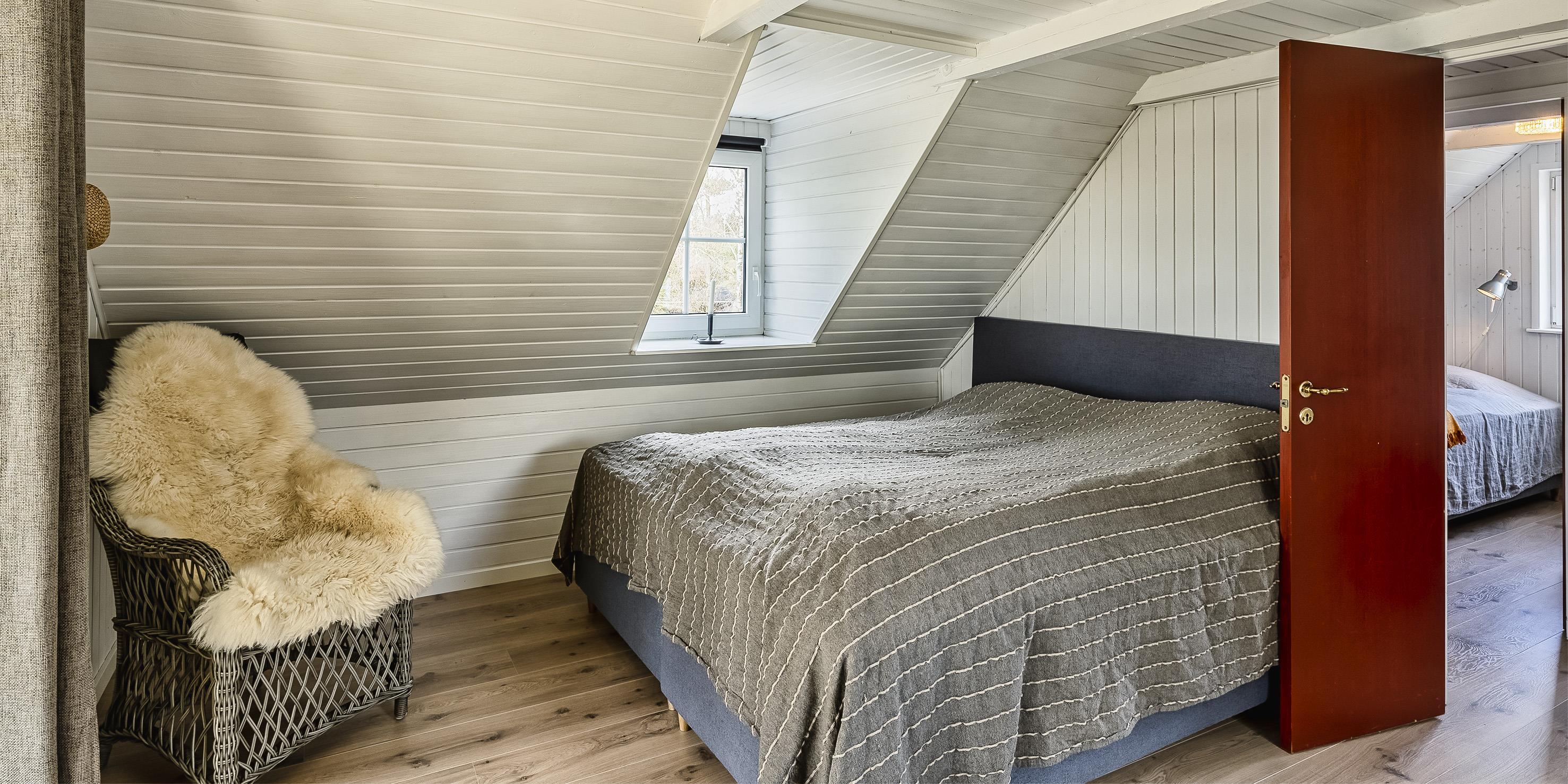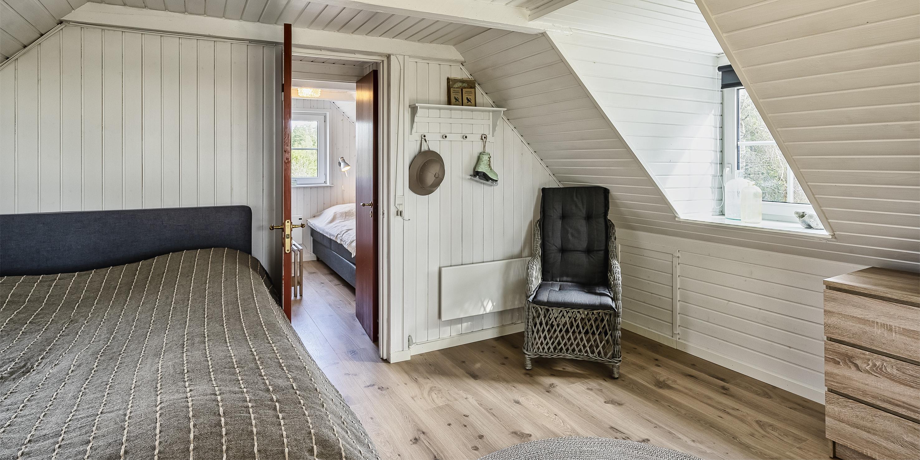 Husets første sal råder over 3 gode soveværelser: DS + DS + DS, hvoraf 2 er med hver en ¾ dobbeltseng (140x200) og et soveværelse med én dobbeltseng (180 x 200). På første sal er der en balkon mod syd med hav kig over Ho bugt.