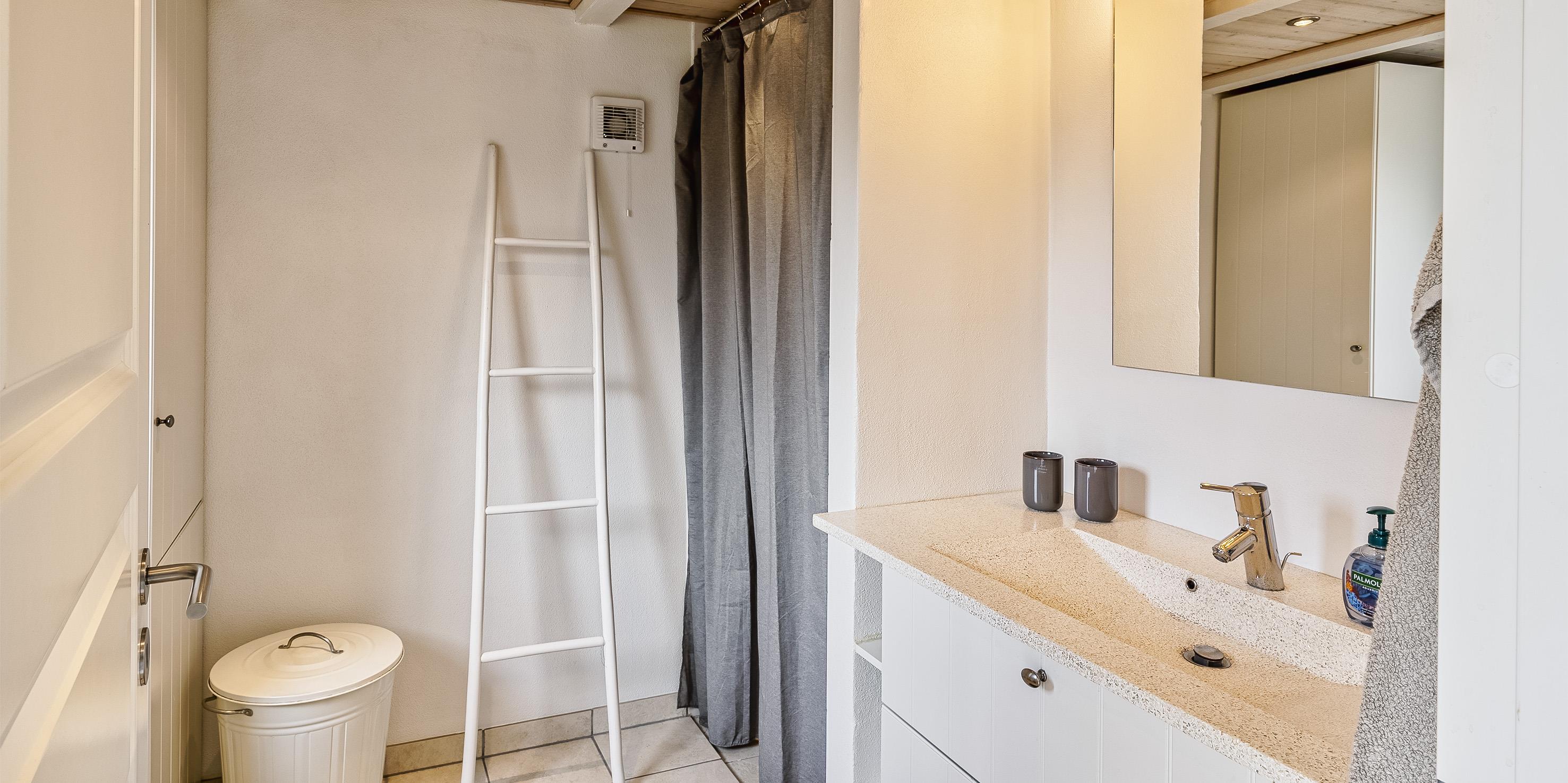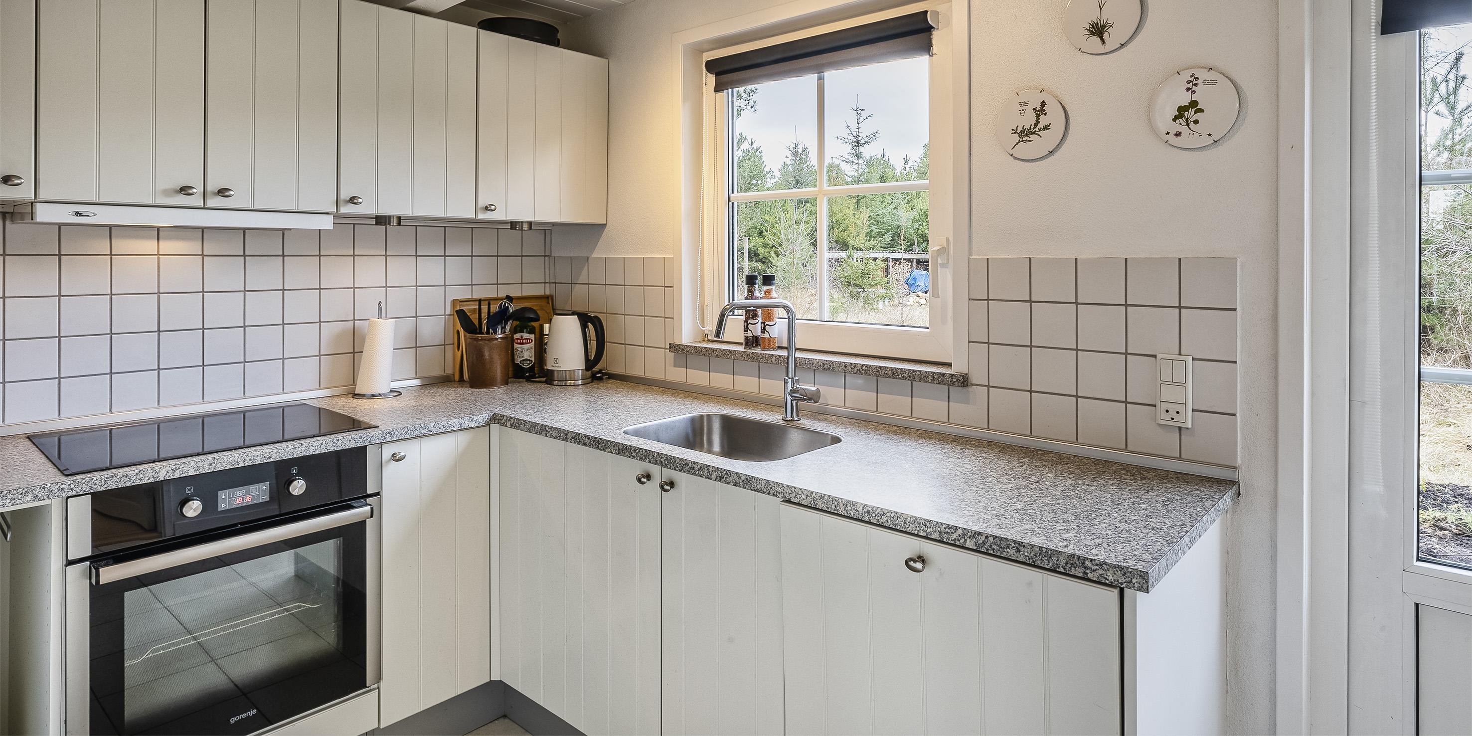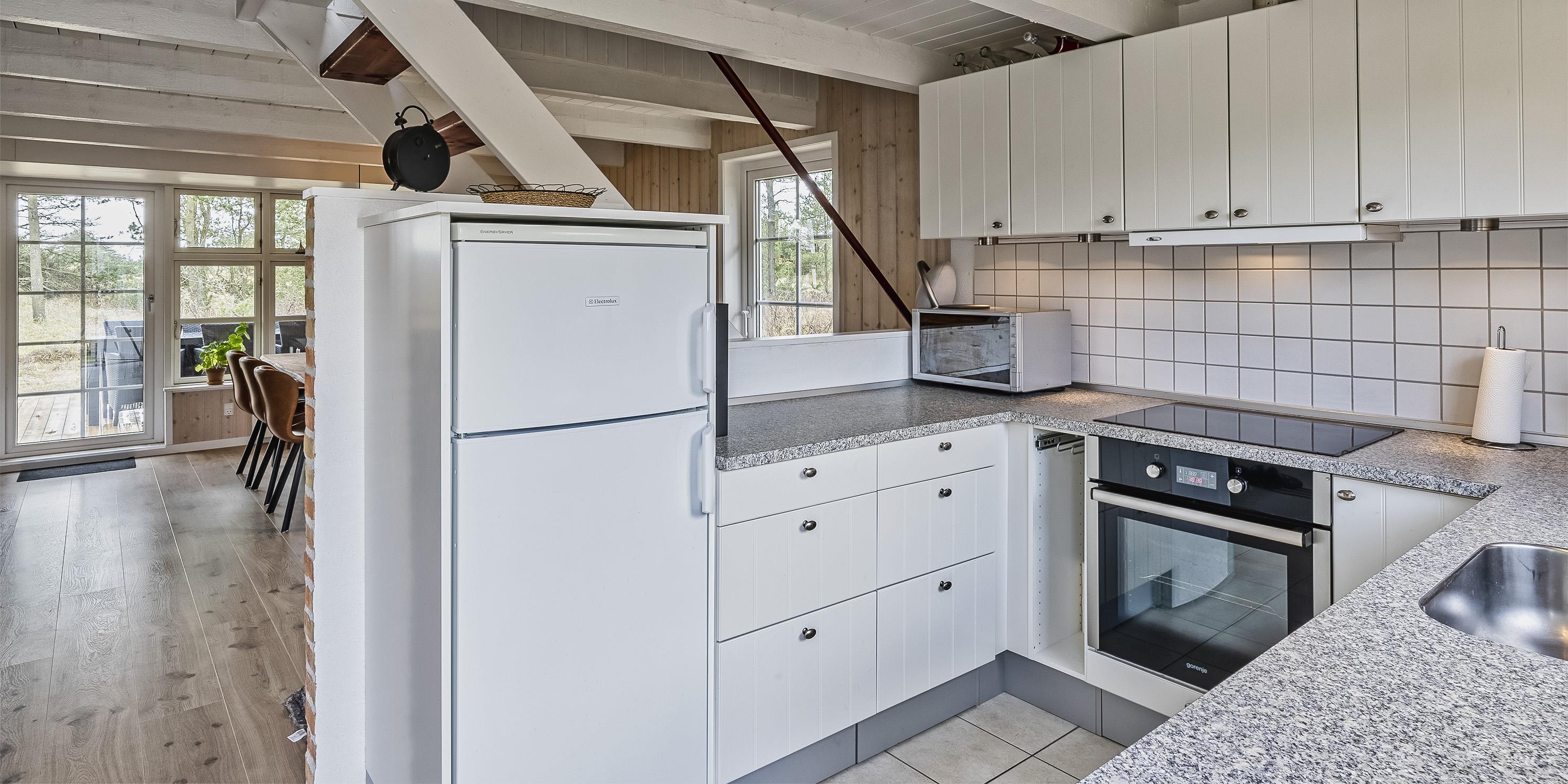Huset indeholder i stueplan: indgang igennem køkkenet. Køkken med mikroovn, opvaskemaskine, komfur, køle-/frysekombination og gulvvarme. Badeværelse med bruseniche, håndvask, toilet, gulvvarme og vaskemaskine. Fra køkkenet er adgang til stuen og spiseafdelingen samt terrasse mod vest og syd. Huset har et dejligt opholdshjørne med kig til brændeovnen. Trappe til første sal. Fjernsyn med danske som udenlandske kanaler og fibernet. Fra stuen er der to udgange til terrasserne mod vest og syd. Ny træterrasse samt overdækket terrasse, hvor sommeraftenerne kan nydes.