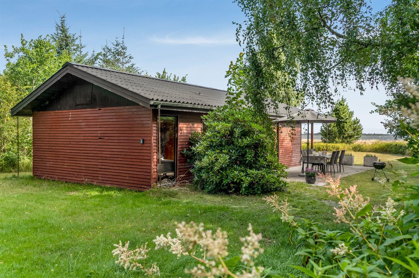 Helt usædvanligt velbeliggende sommerhus kun 75 m fra Limfjorden i rolige og naturskønne omgivelser, hvor der fra stue og overdækket terrasse er panoramaudsigt over vandet.