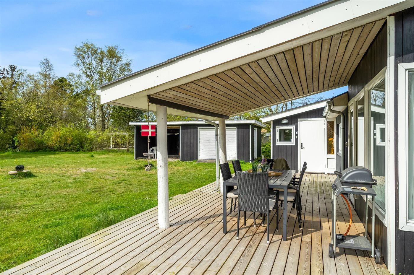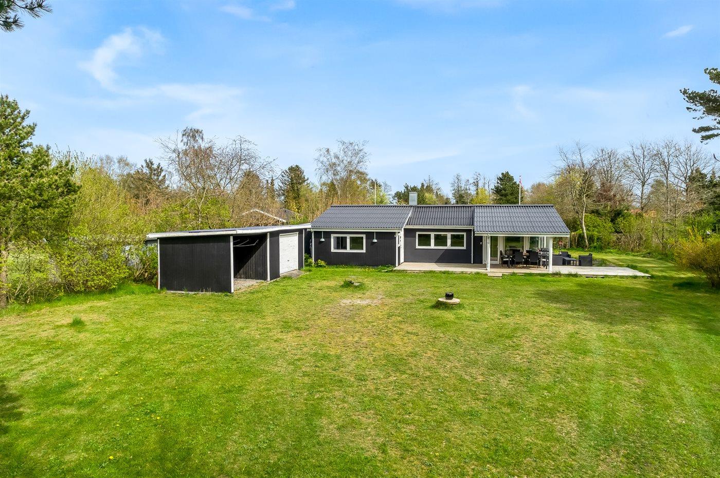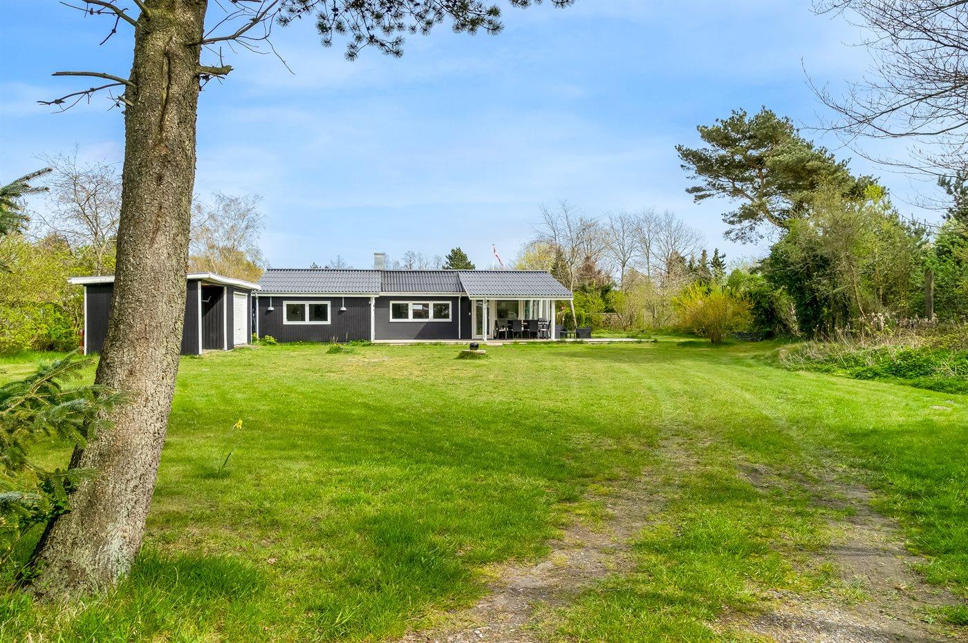 Ferieboligen er beliggende på en 1664 m² stor havegrund. Der er 350 m til fjorden. Nærmeste forretning er beliggende i en afstand af 2000 m. Der er en golfbane i en afstand af 10000 m. Desuden er der 10 m² overdækket terrasse. Til ferieboligen hører åbent terrasseareal. Grill til rådighed. Der er installeret stik til opladning af elbil. Type 2 stik. Med 11 kW ladeeffekt.