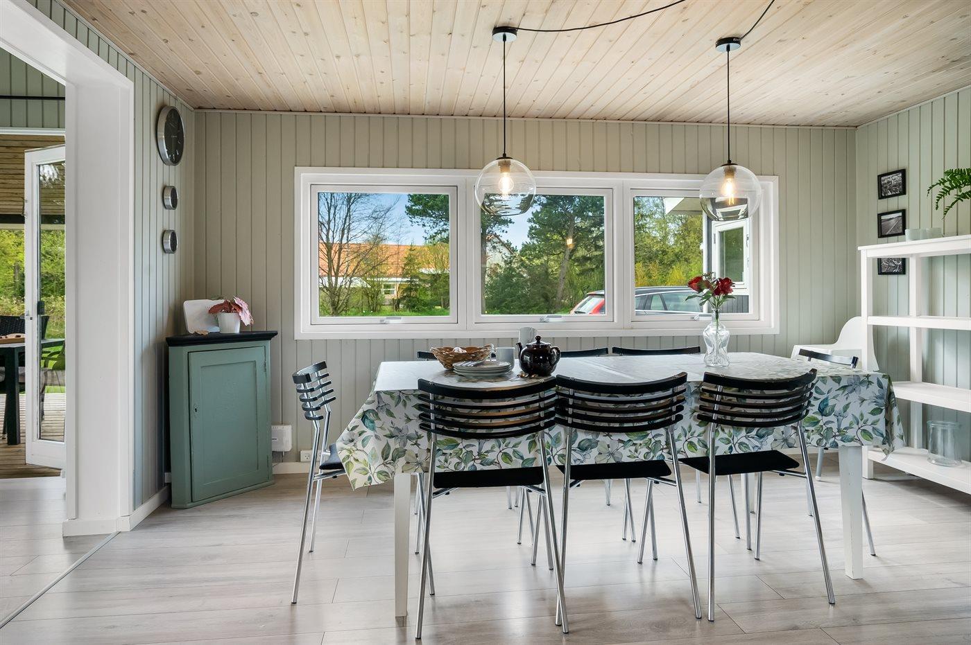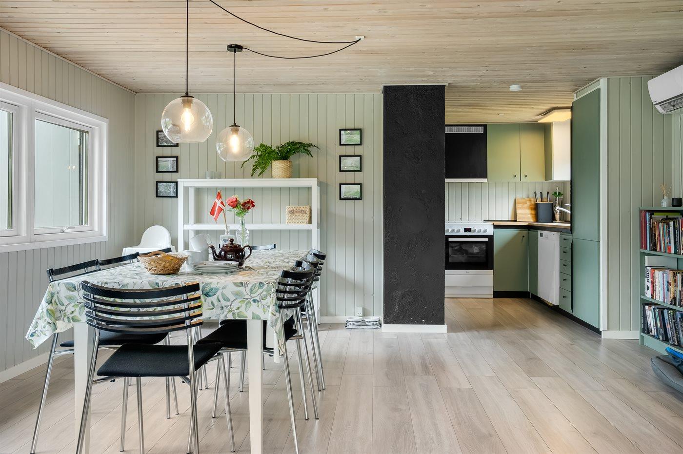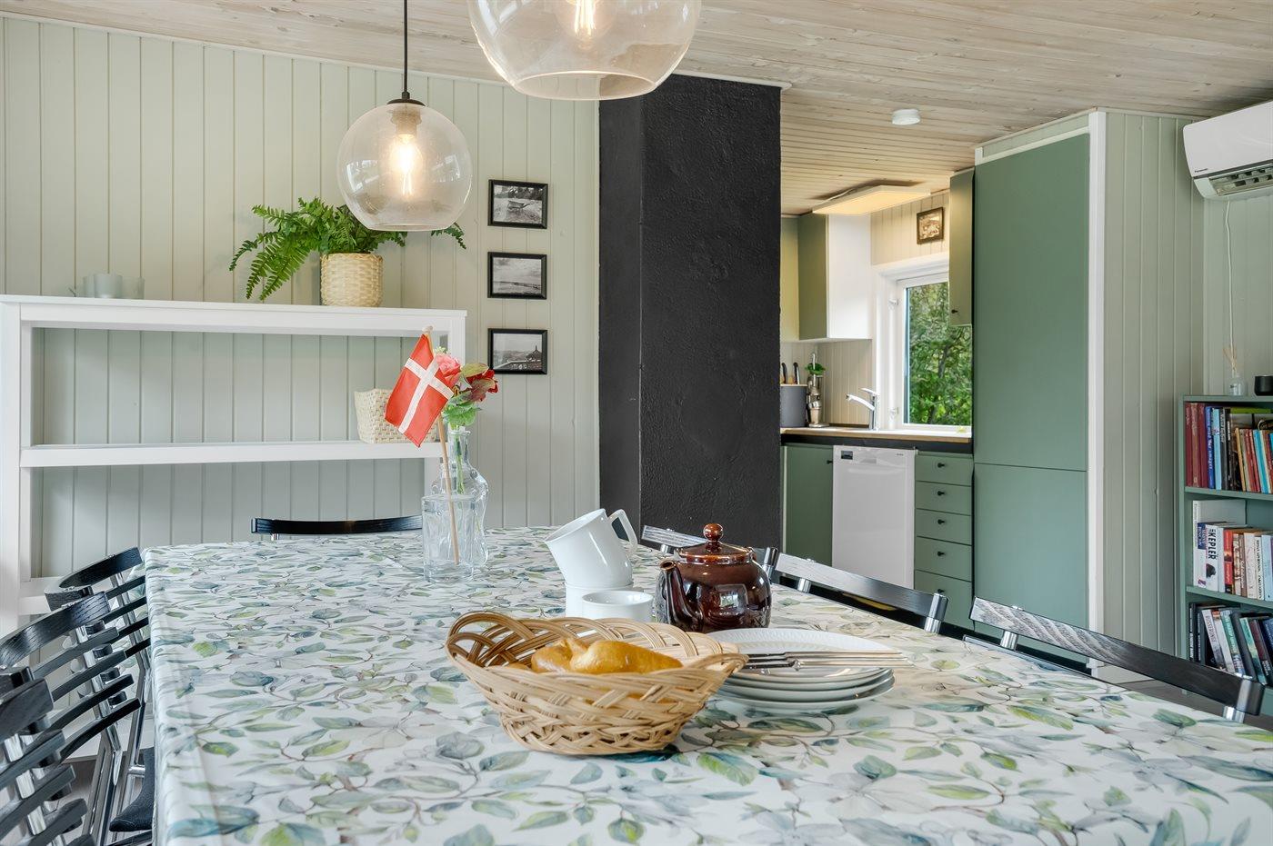Køkkenet er udstyret med 1 køleskab. Der er 4 keramiske kogeplader, varmluftovn samt opvaskemaskine.
