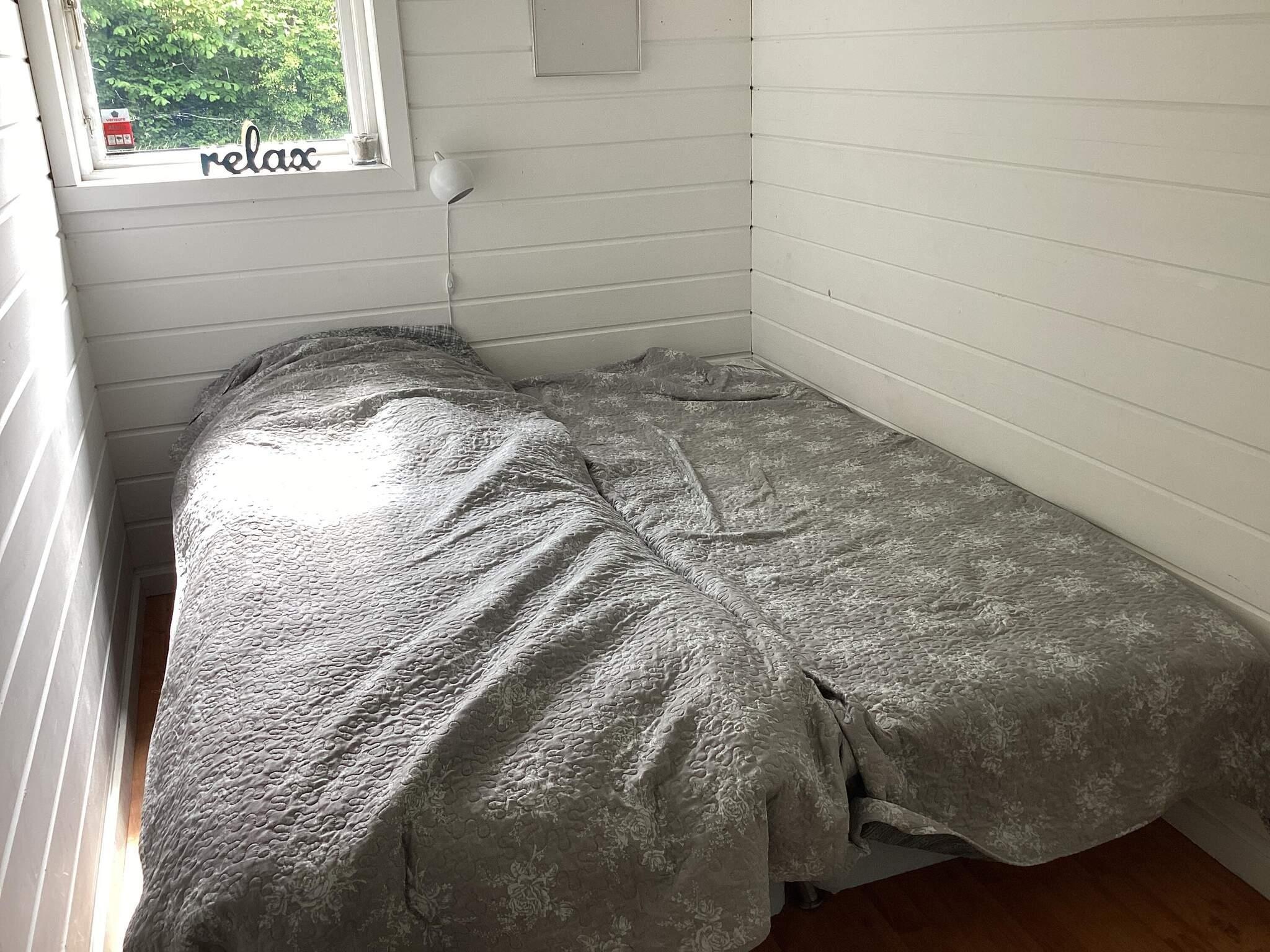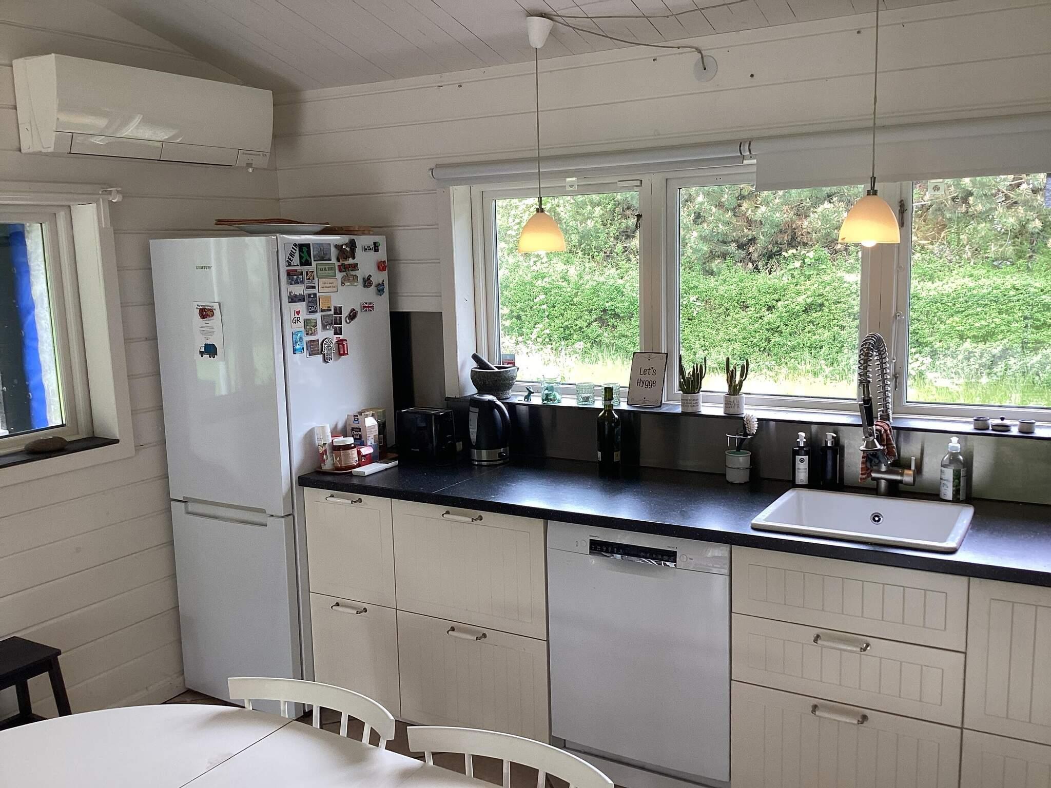 Indenfor finder I tre soveværelser: ét med dobbeltseng, ét med to enkeltsenge og ét med en enkeltseng. Det åbne køkken er veludstyret med bl.a. gaskomfur, kaffemaskine, mikroovn, opvaskemaskine og fryser. I stuen er der både varmepumpe og brændeovn, tv med Chromecast og trådløst internet. Badeværelset har toilet, håndvask og bruseniche. Fra stuen er der udgang til terrassen og haven.