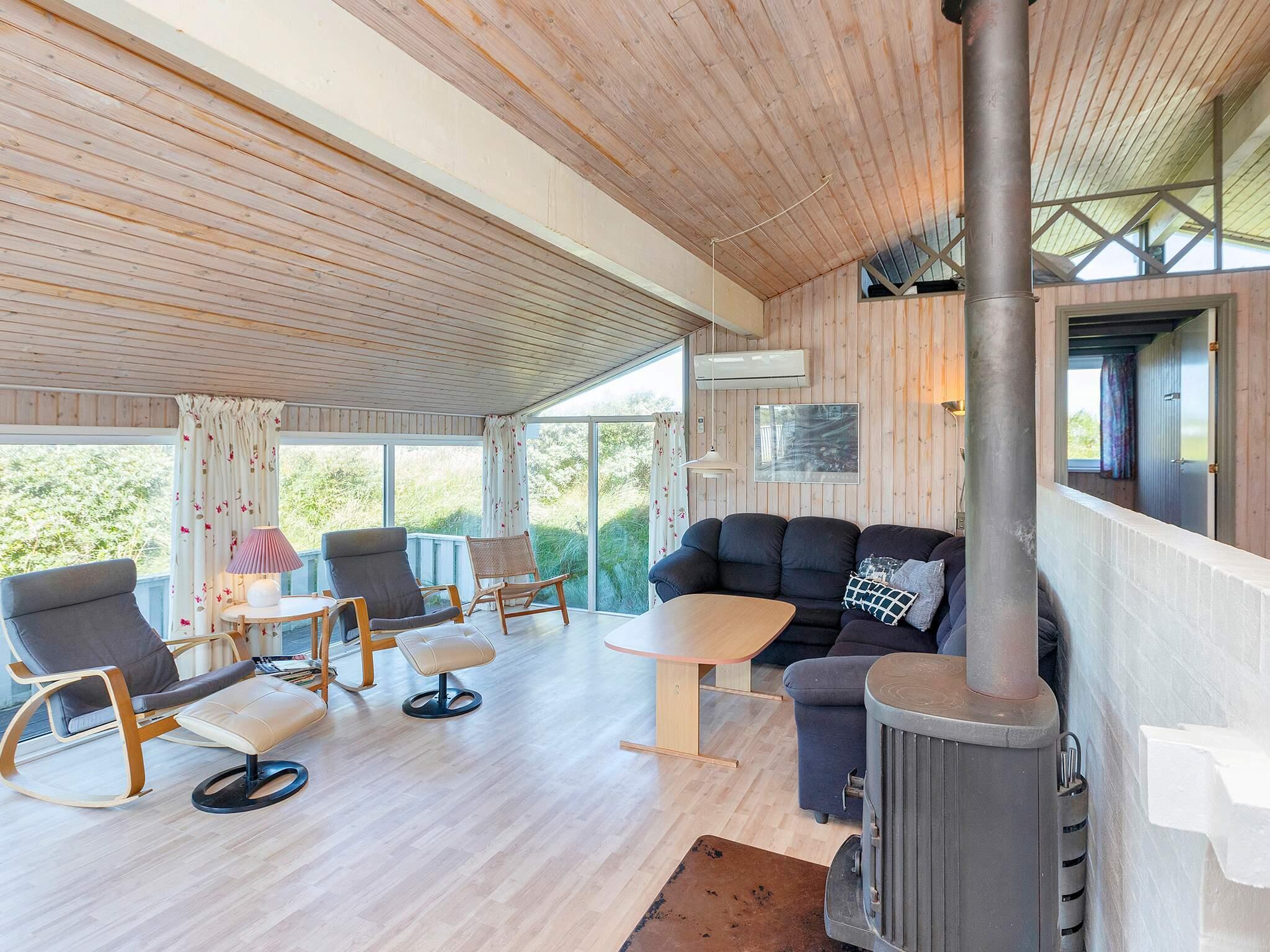 Huset er smagfuldt indrettet og har brændeovn. Stuen er sænket to trin i forhold til resten af huset. Her kan der slappes af med kabel-tv og radio. De store børn vil helt sikkert erobre hemsen, som netop deres soveplads. Udlejes ikke til ungdomsgrupper.
