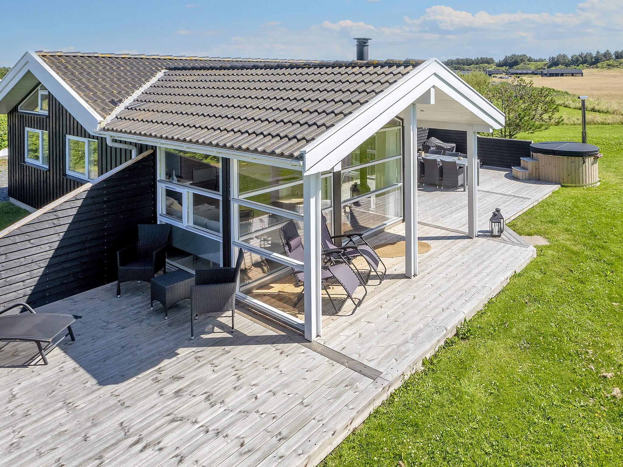 Velholdt sommerhus med spabad inde, og i 2024, ny og udvidet terrasse med tilhørende vildmarksbad beliggende ugenert i rolige, naturskønne omgivelser ca. 450 m fra hav og strand. Fra huset og vildmarksbadet er der skøn udsigt til Jyske Ås, ligesom områdets dyrevildt kan betragtes på tæt hold. Huset er opført i 2006 og indeholder stue i åben forbindelse med køkkenet, tre soveværelser og badeværelse med spabad. Der er gulvvarme i alle klinkegulve. Fra stue og grund er der lille havkig på en god dag. Møblementet er smagfuldt og moderne i kendt dansk sommerhusstil. Ejeren har med sikker hånd og sans for kvalitet indrettet rummene, således at ethvert ophold i huset er forbundet med velvære og afslapning. Samtidig er huset meget velholdt og udsmykningen afstemt efter indretningen. Der er både overdækket og åben terrasse mod øst, syd og vest. En del af terrassen er forsynet med halogenlys, hvilket giver ekstra gode muligheder for aftenhygge. Huset har en ny energibesparende luft-til-luft varmepumpe. Grunden er en plan naturgrund, som grænser op til storslået fredet naturareal omkranset af Jyske Ås. Til børnene er der opsat gynger og sandkasse. Under ophold på grunden kan I høre havets brusen. Udlejes ikke til ungdomsgrupper