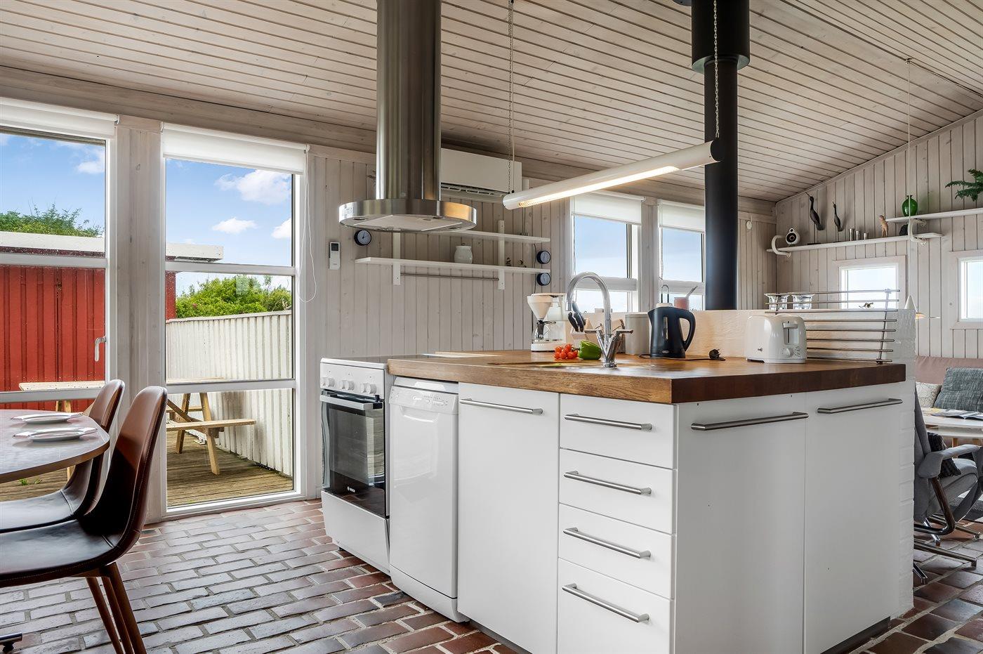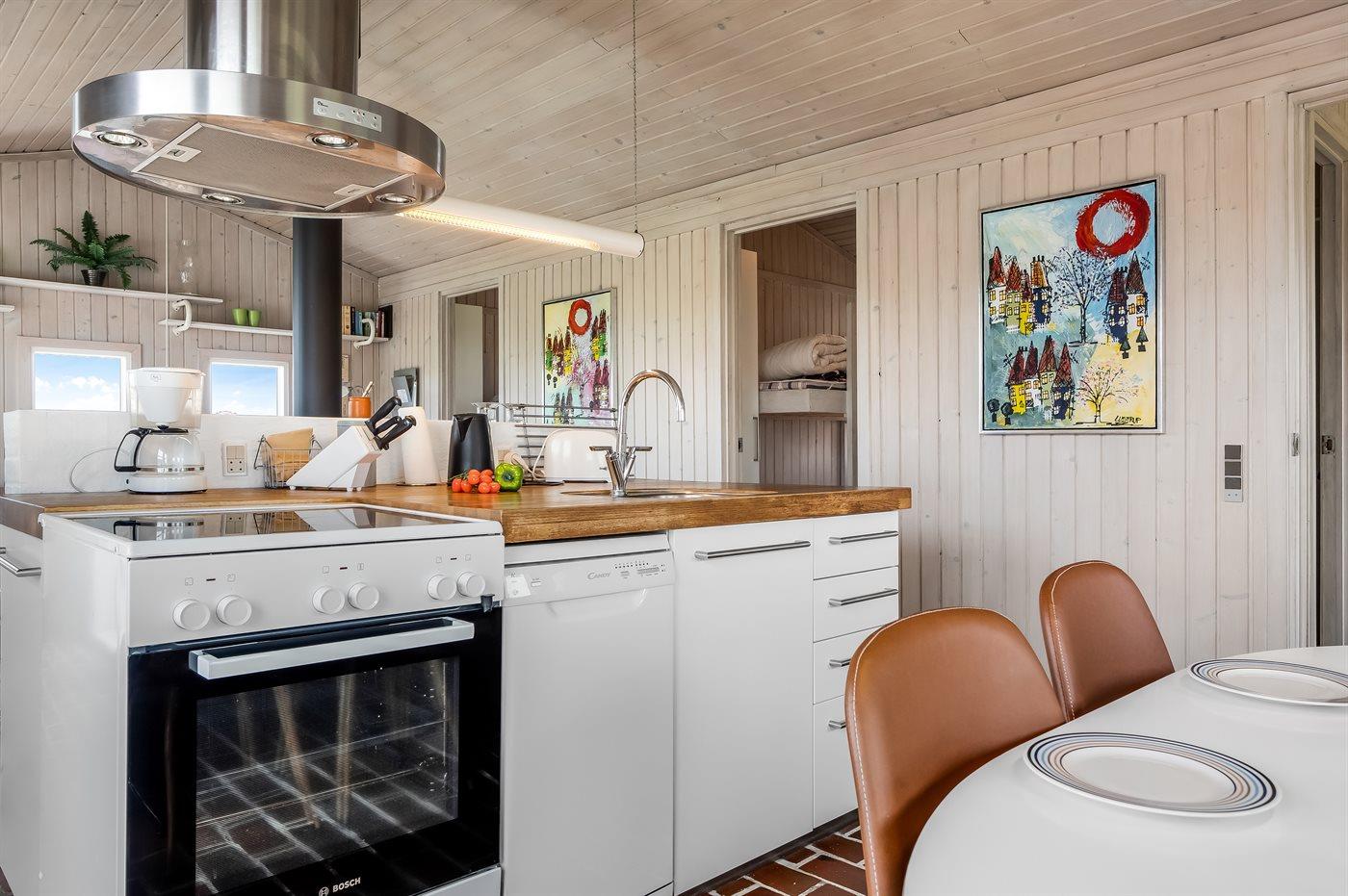 Køkkenet er udstyret med 1 køleskab. Der er 4 elkogeplader, bageovn, mikrobølgeovn samt opvaskemaskine.