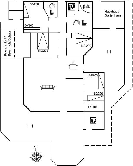 Der er i alt 4 soveværelser. Sovepladserne fordeler sig på: 4 sovepladser i dobbeltsenge. 3 sovepladser i enkeltsenge. 2 sovepladser i køjeseng.