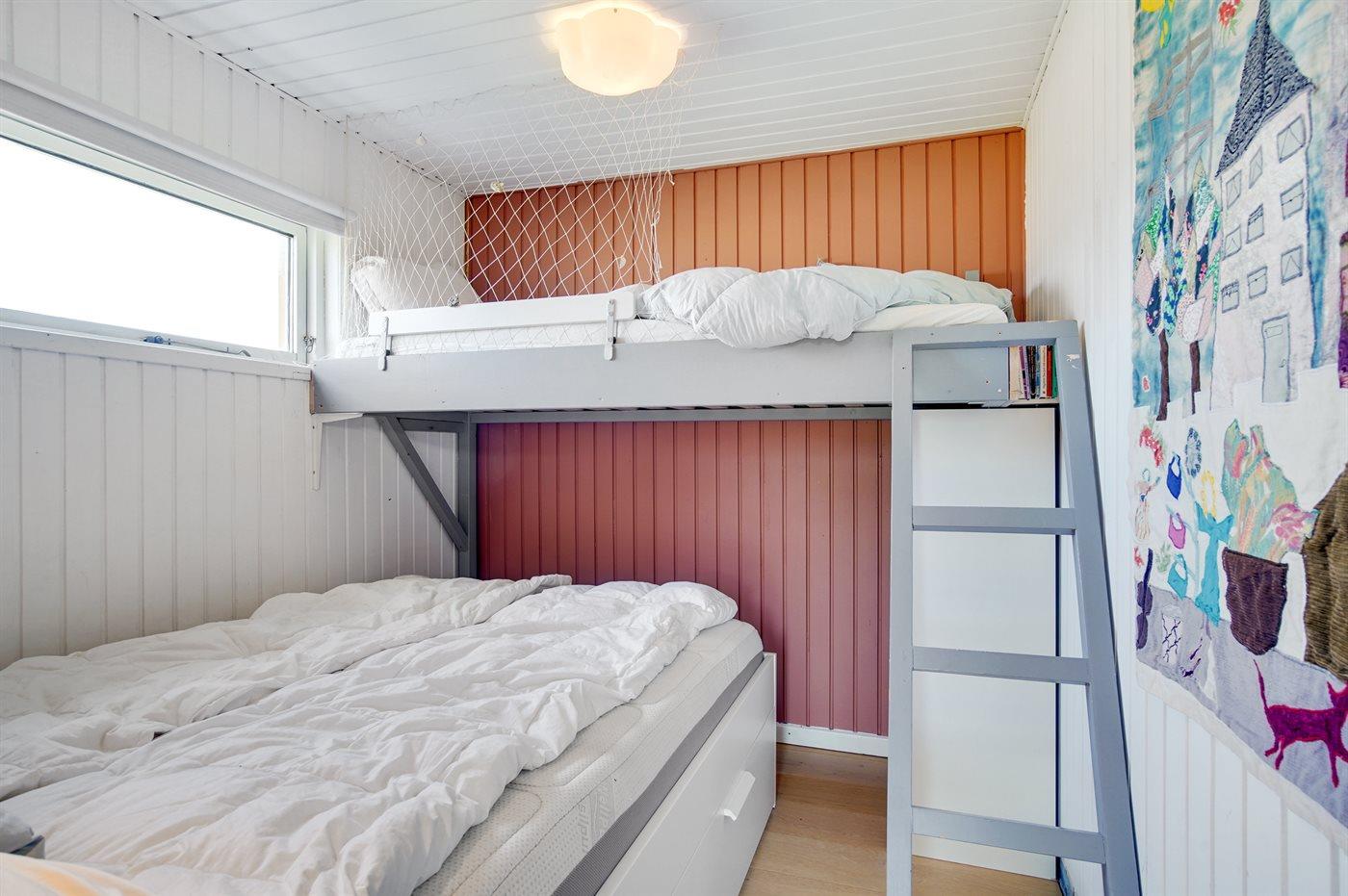 Der er i alt 2 soveværelser. Sovepladserne fordeler sig på: 4 sovepladser i dobbeltsenge.1 soveplads i køjeseng. Derudover er der 1 stk. barneseng.