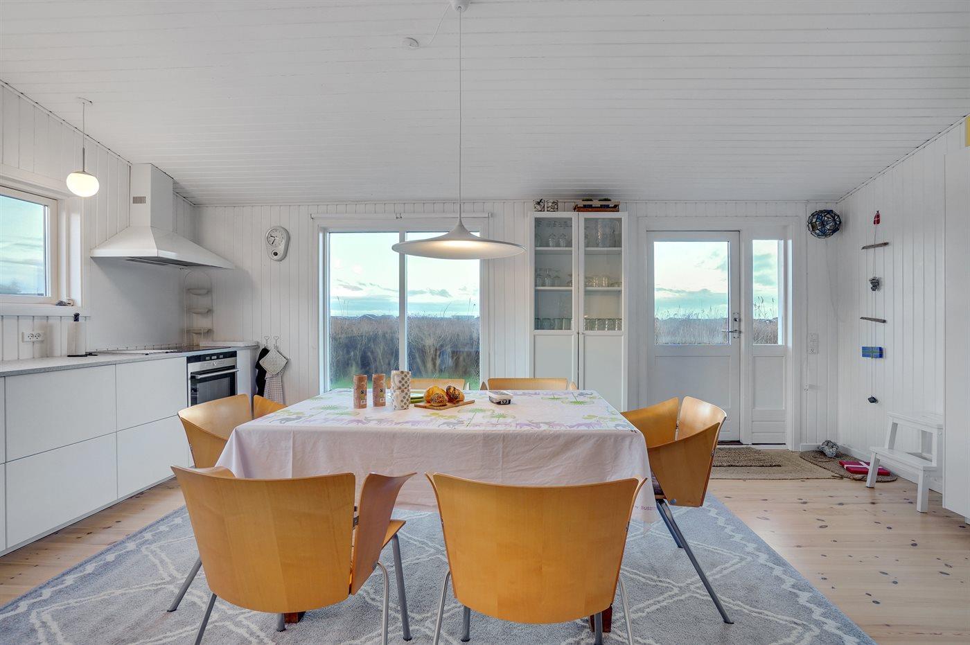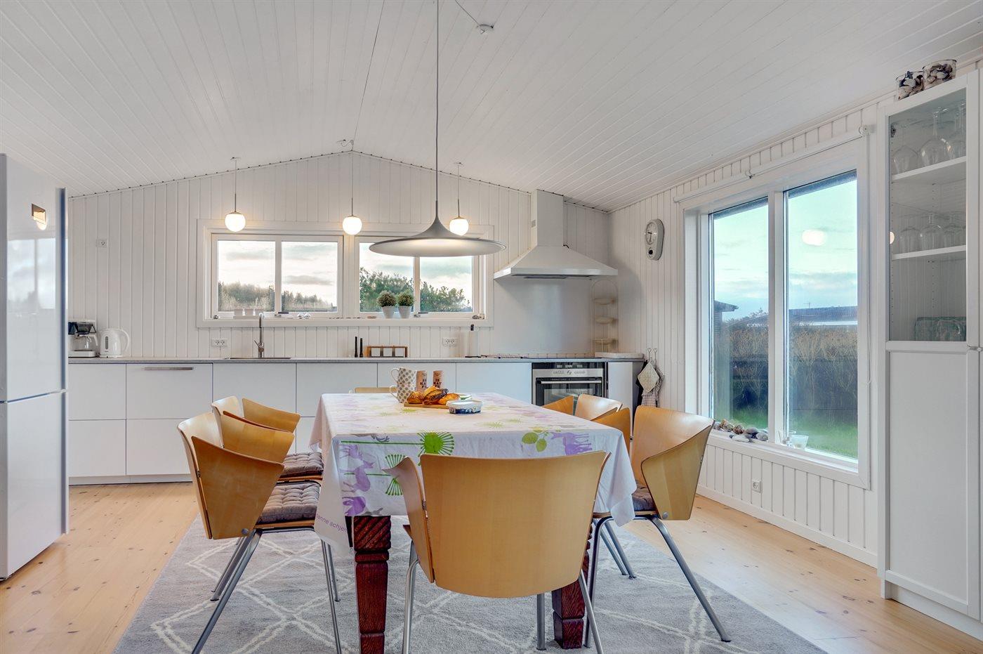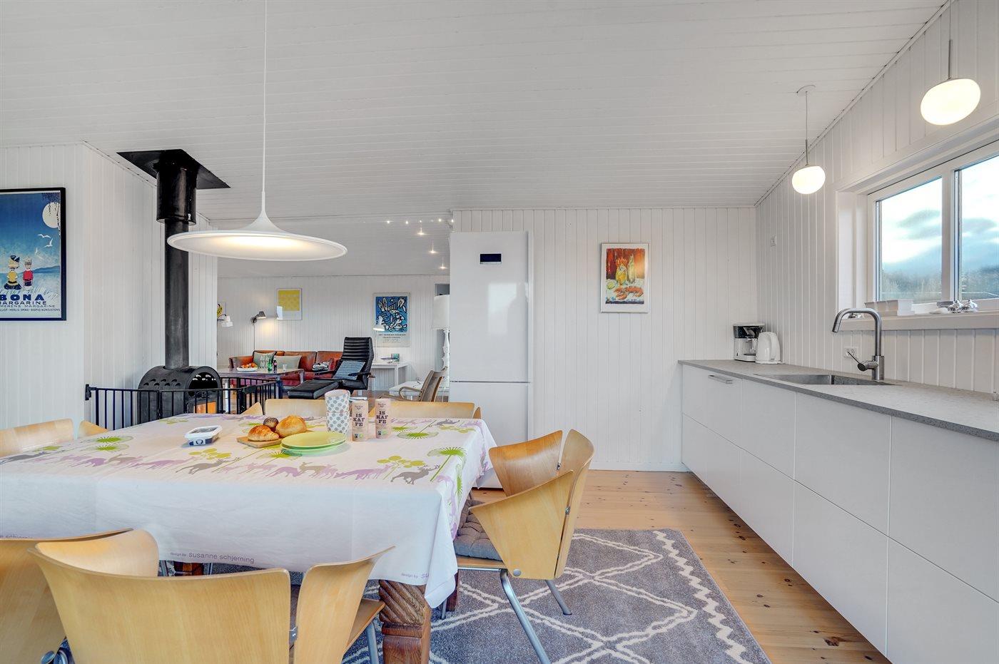 Køkkenet er udstyret med 1 køleskab. Der er 4 keramiske kogeplader, varmluftovn samt opvaskemaskine.