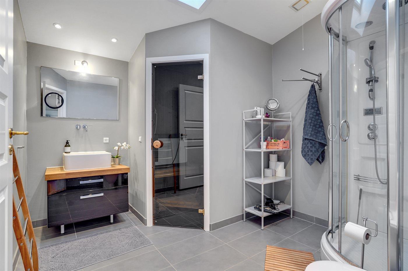 Der findes et stort badeværelse med gulvvarme, wellnesskabine med dampbad og indbygget radio samt et mindre badeværelse med bruseniche. Der findes toilet i begge badeværelser I saunaen er der mulighed for afslapning.