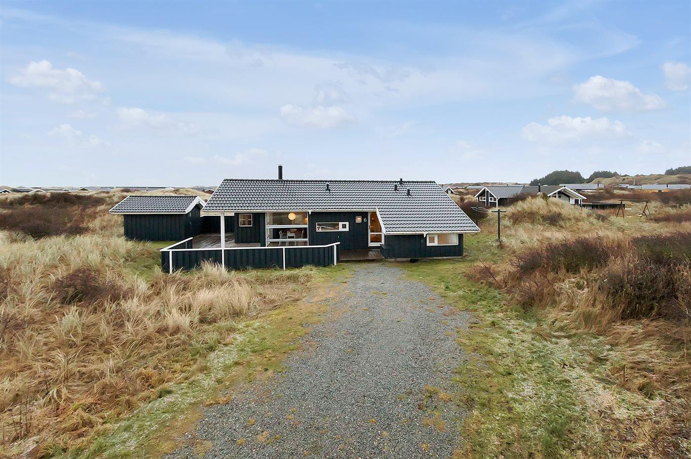 På en let kuperet grund nær stranden og Vesterhavet ligger dette indbydende og rummelige sommerhus i et roligt og naturskønt område med kig til havet fra såvel hus som grund. Huset er indrettet lyst og venligt med adgang til hems med 2 mulige sovepladser.