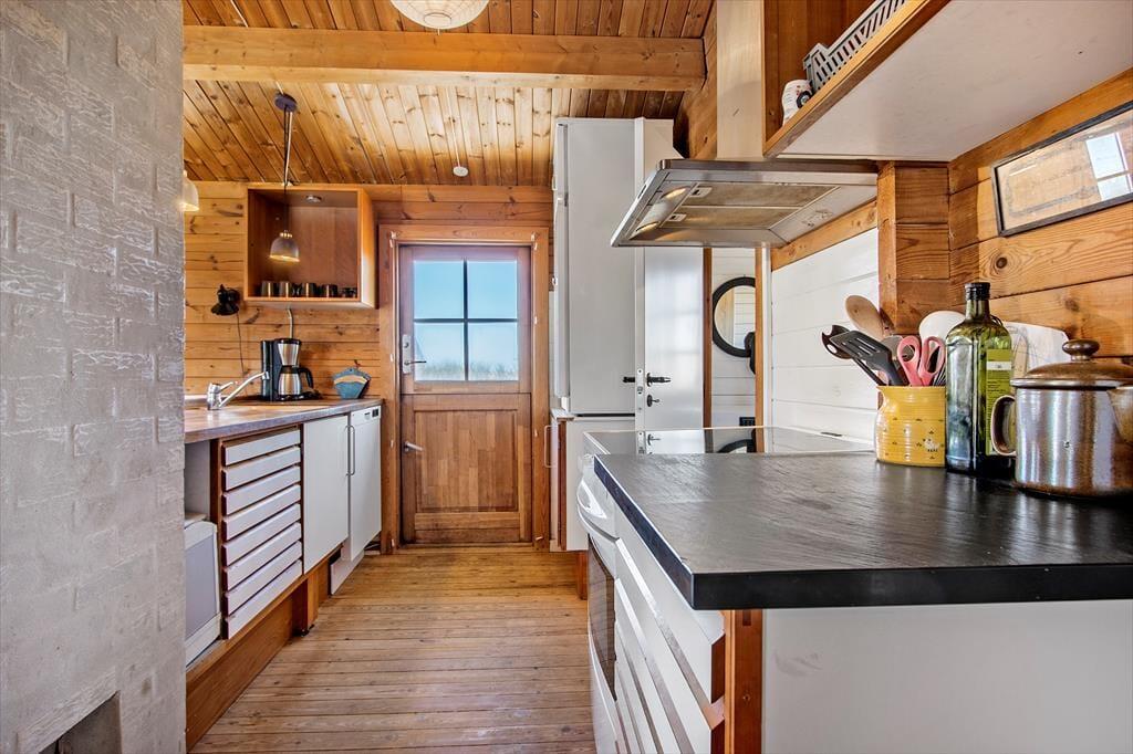 Inden døre i sommerhuset er der loft til kip og umalede trælister på væggene i flere rum, og sådan et rustikt look går godt i spænd med de naturskønne omgivelser. På velfungerende vis ligger stue og køkken i åben forbindelse, og her står der en brændeovn klar, hvis du får lyst til at skrue op for både temperaturen og hyggestemningen. I forlængelse af opholdsrummet ligger der en hvidmalet ”karnap”, og det et skønt sted at slå sig ned i en solstråle med en god bog – hvis ikke du i stedet lader tankerne vandre, mens du kigger ud på det kuperede klitlandskab. Sommerhusets hyggelige og hjemlige atmosfære kan også mærkes i de øvrige rum, der inkluderer tre gode soveværelser – hvoraf det ene har direkte adgang til en hems ved hjælp af en stige eller væghængte klatregreb.