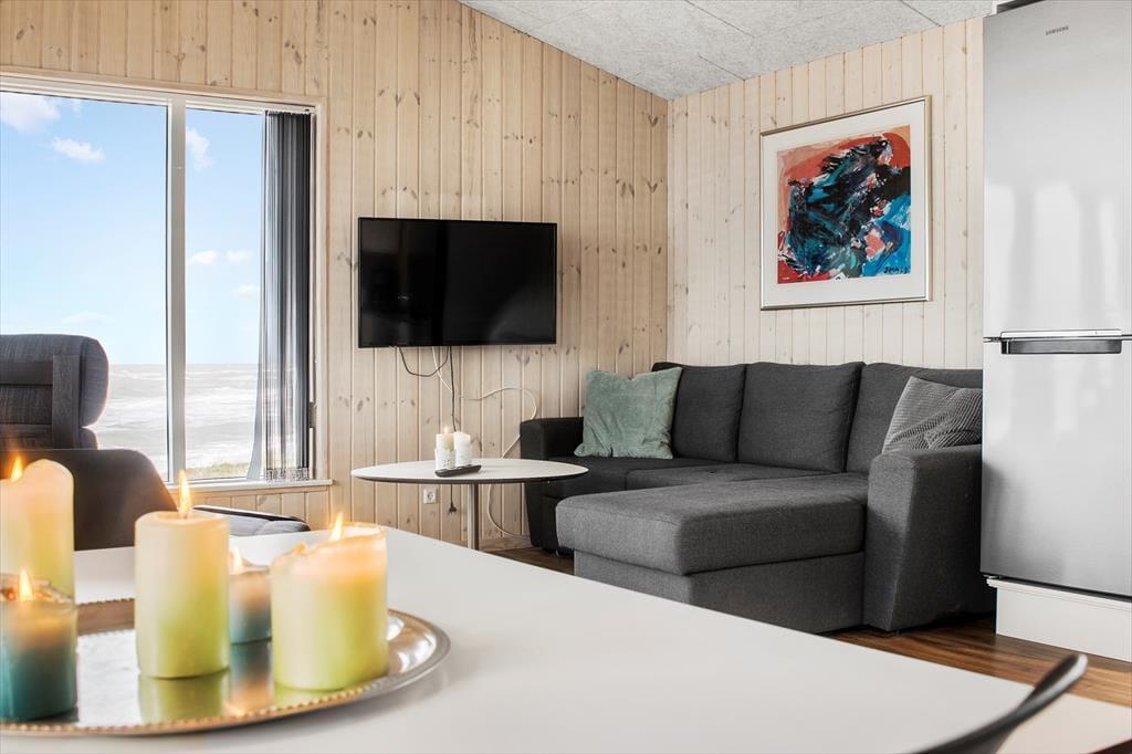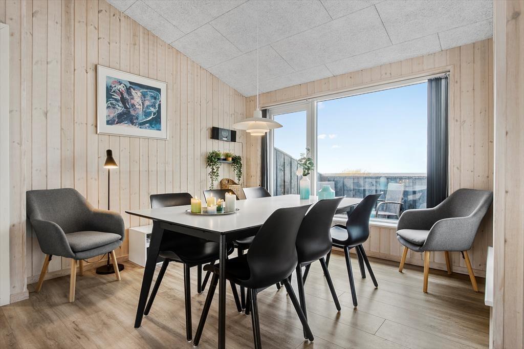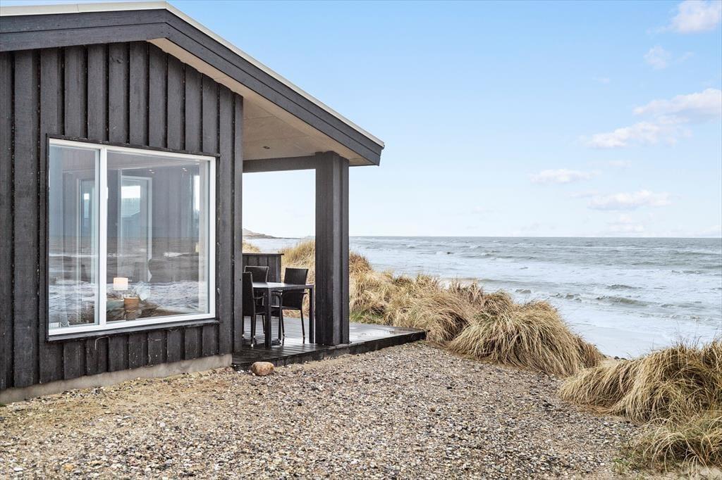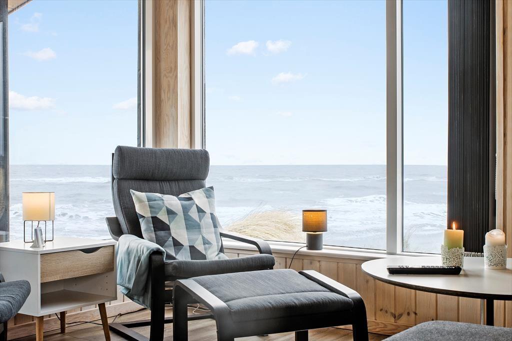 Indenfor venter en lys og indbydende bolig med moderne møbler, der matcher det skandinaviske ferieliv perfekt. Store vinduespartier trækker havet helt tæt på, og det føles nærmest som at sidde i første række til naturens eget teater. Det åbne opholdsrum kombinerer køkken, spiseplads og stue i ét, så du aldrig er langt væk fra hinanden – heller ikke når maden skal tilberedes. Der er ingen brændeovn i huset, men det kompenseres der for med en afslappet og stilren stemning, hvor nærvær og udsigt går hånd i hånd. Her er rigeligt med plads til både samtaler over en kop kaffe, brætspil med børnene eller bare ro og fordybelse med en god bog i sofaen. Når aftenen falder på, kan du stadig ane det sidste lys over horisonten fra opholdsstuen – en udsigt, der er svær at løsrive sig fra.
