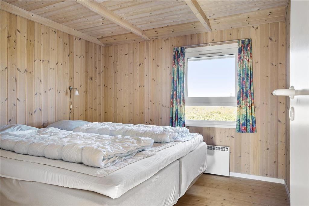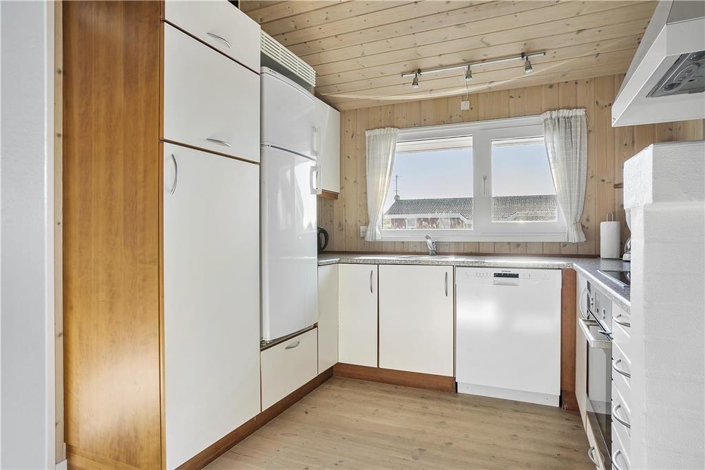 Sommerhusets køkken ligger i åben forbindelse til stuen. Stuen er velindrettet med pæne og komfortable møbler. Der er brændeovn, som giver en god varme og en hyggelig stemning. Fra stuen er der adgang til et af husets tre soverum. Husets to andre soverum ligger i den modsatte ende af huset. Her er også sommerhusets badeværelse med vaskemaskine og tørretumbler. Der er havkig fra både huset og grunden.