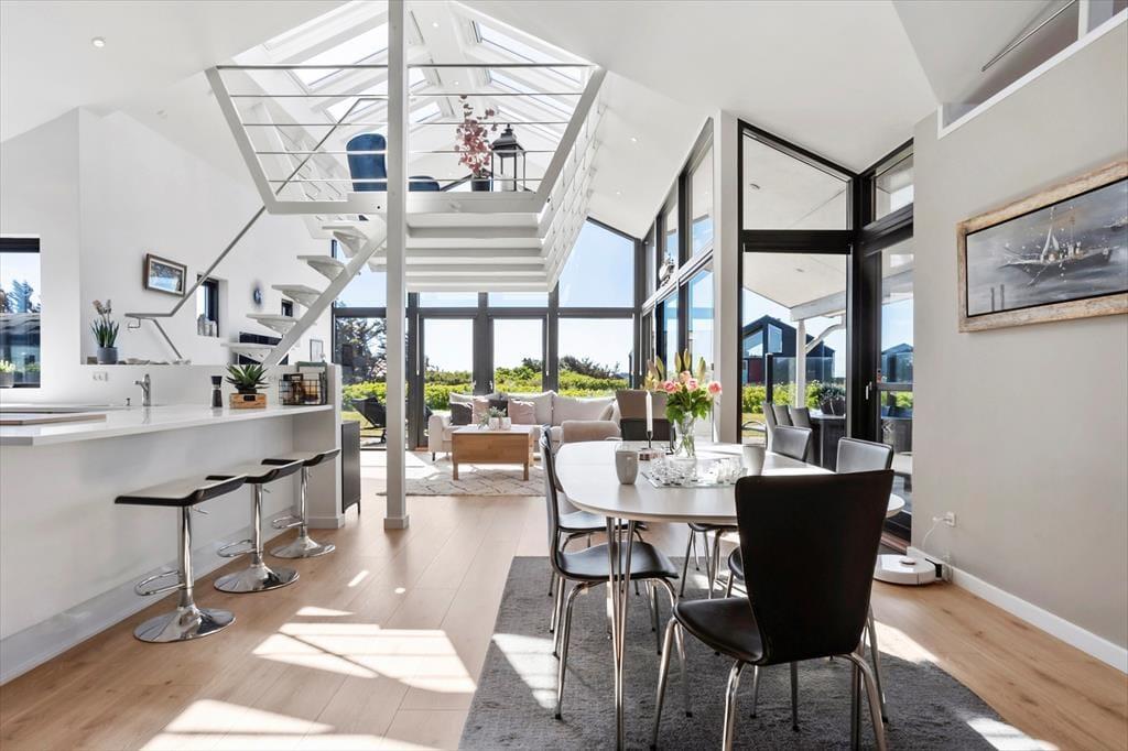 Det store, højloftede opholdsrum er et skønt sted at samles, når der er duftende gryder i køkkenafdelingen, film på fladskærmen og ild i pejseindsatsen. Hvis I vil nyde havudsigten, skal I tage trappen op til plateauet, der fungerer som en nærmest svævende udvidelse af stuen – heroppefra har I nemlig et fantastisk vue ud over det naturskønne sommerhusområde med Vesterhavet i baggrunden. En hems med madrasser er også en hyggelig tilføjelse til planløsningen.