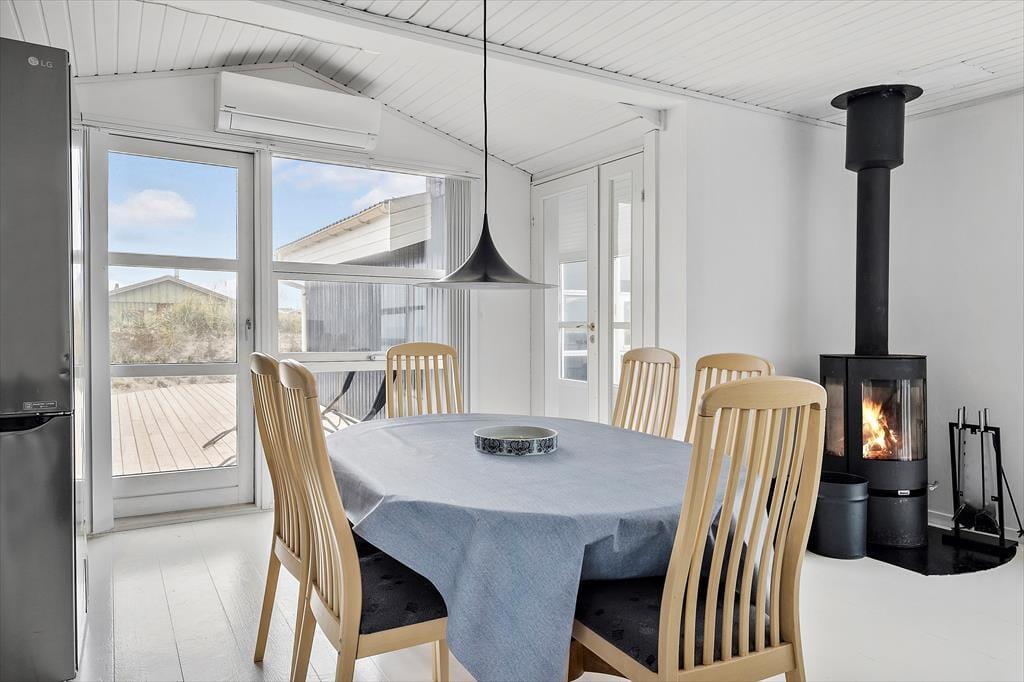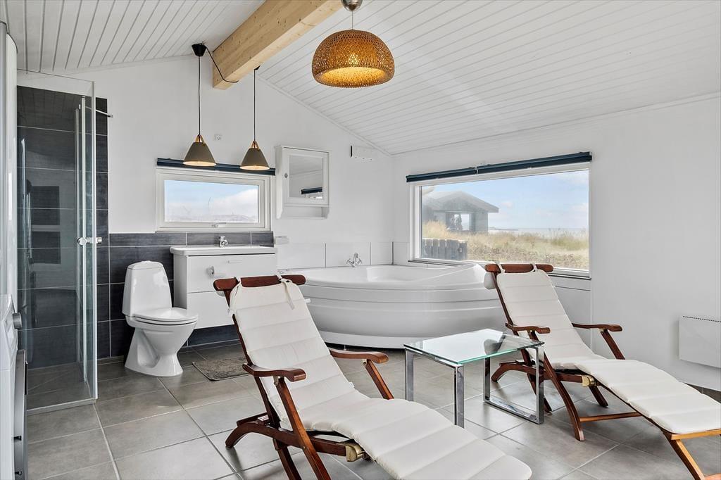 Beliggenheden er mildest talt i særklasse, og det har selvfølgelig stor indvirkning på ferielivet sådan at have stranden og havet lige udenfor. Med vinduerne på klem kan I stå op til frisk havluft og lyden af bølgebrus på de fire soveværelser, og også i stuen har I det smukkeste panoramavue som bagtæppe for ferielivet. I stuen er der for øvrigt brændeovn og stort fladskærms-tv, og et veludstyret køkken er integreret i rummet, mens der er badeværelse i begge ender af huset. I alt har I hele 120 m2 at brede jer på, og sommerhuset er senest renoveret i 2023, hvor blandt andet det store spabadeværelse er blevet moderniseret. Her i wellnessrummet er der for øvrigt også havudsigt, og glasdøren gør det nemt at smutte ud i solen.