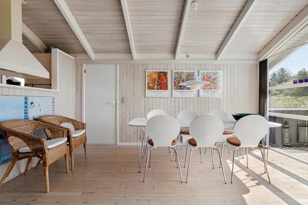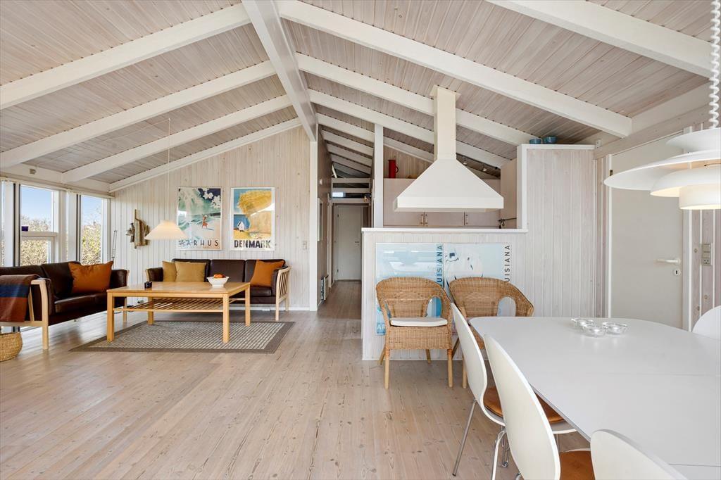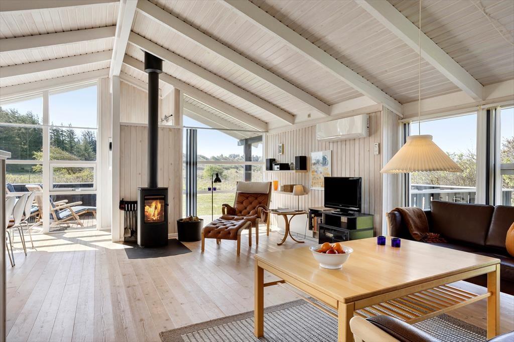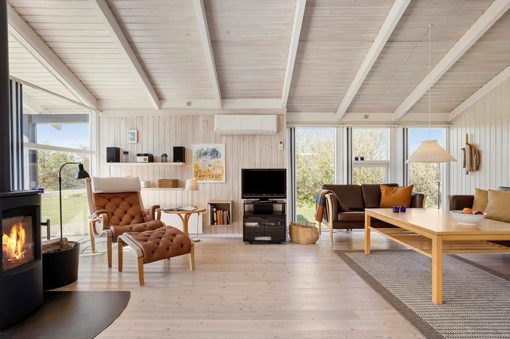 Med fire soveværelser, to badeværelser og et stort opholdsrum har det 95 m2 store sommerhus en gennemtænkt planløsning til otte personer. Der er imidlertid ikke kun taget højde for funktionaliteten, for atmosfæren er også i top i huset, der har loft til kip, pænt møblement, brændeovn og andre dejlige detaljer. De store vinduer er også værd at hæfte sig ved, for de lukker dagslyset ind og giver samtidig udsigt til Lien, som er en fredet indlandsskrænt, der strækker sig langs med sommerhusområdet. Ud over brændeovn er der for øvrigt varmepumpe i stuen, og er det køligt udenfor, er det intet mindre end fantastisk at bruge en time eller to på at gå i sauna og slappe af i spabadet.