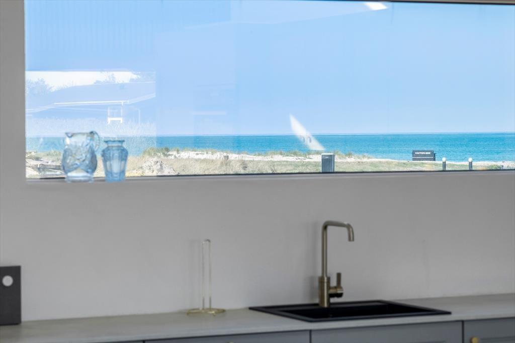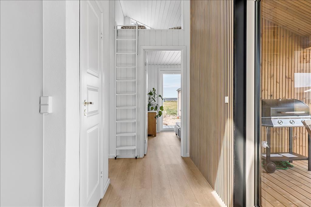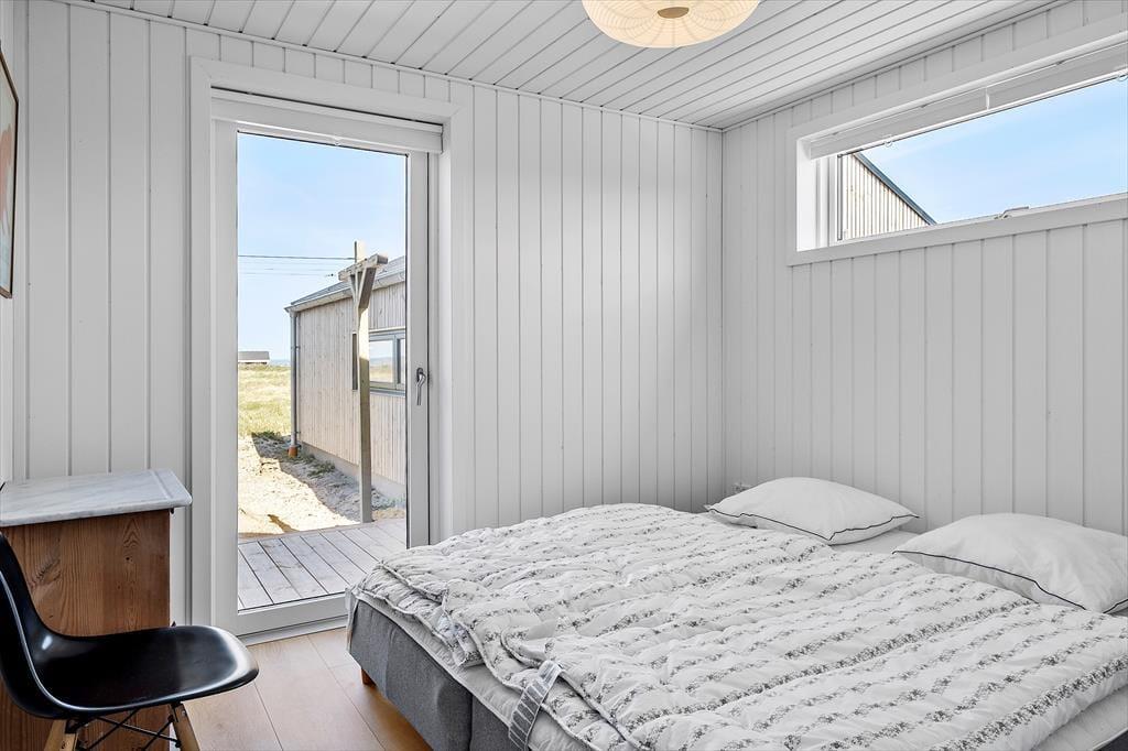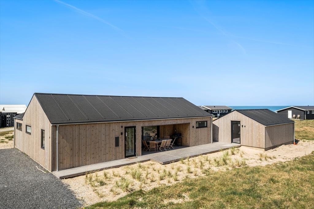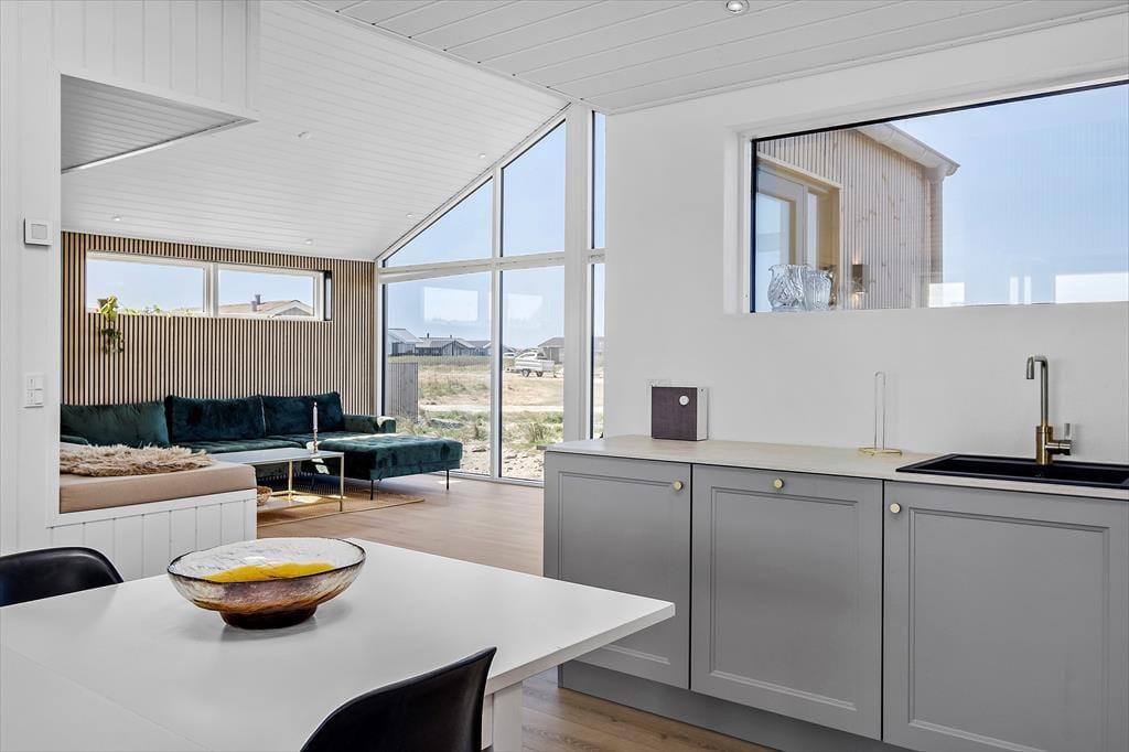 Huset ligger harmonisk placeret i det dejlige klitlandskab, og arkitekturen sætter beliggenheden flot i scene. Store vinduespartier mod vest og syd trækker masser af naturligt lys indenfor og giver panoramaudsigt til Vesterhavet, der blot ligger 100 meter væk. Sommerhusets stil er lys og nordisk, materialerne er lækre, og indretningen sætter suveræne rammer om ferieturens hyggelige samvær med venner og familie. I får blandt andet et stort, sammenhængende opholdsmiljø med flydende overgang mellem stue og køkken og udgang til terrasser på begge sider af huset – her smelter inde og ude naturligt sammen på de lune sommerdage. I kan blandt andet glæde jer over en fantastisk udsigt fra spisebordet, og i stuen er der en skøn alkove, hvor man også kan ligge og nyde udsigten. Herudover får I tre soveværelser og to badeværelser, som blandt andet er udstyret med lækre italienske klinker – og på det ene badeværelse er der endda spabad, der indbyder til tilbagelænet afslapning. En hems kan bruges til overnatning, og i annekset er der soveplads, toilet og aktivitetsrum med bordtennis.
