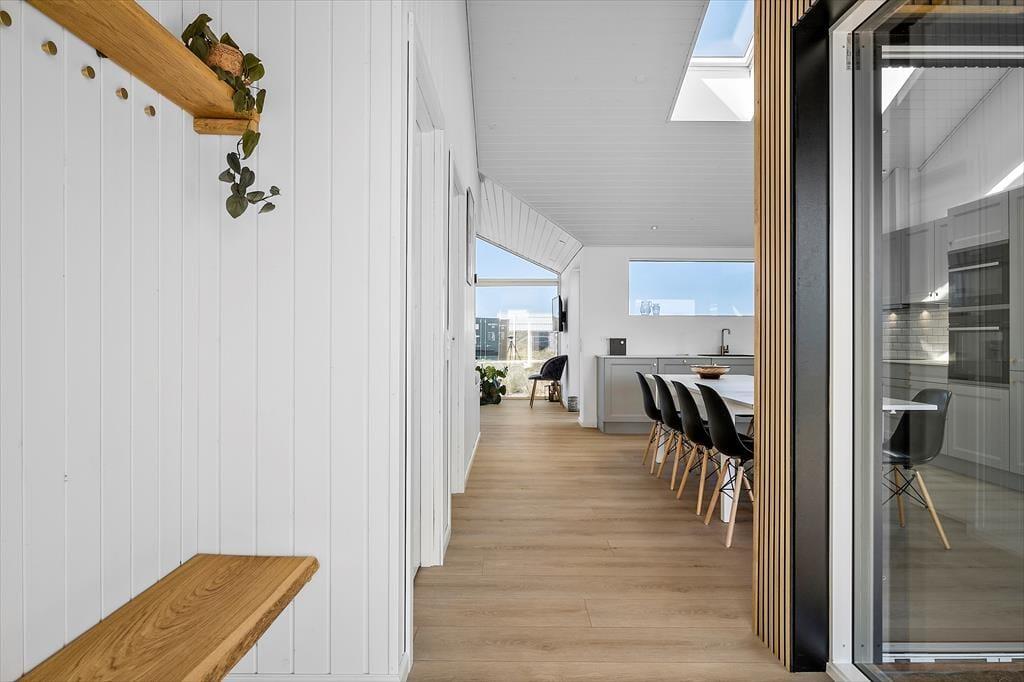 Få skridt fra Nørlev Strand ligger dette flotte, nybyggede sommerhus med plads til 9 personer. Her kan I nyde ferien i lyse og stilfulde rammer med masser af moderne komfort og en helt fantastisk udsigt til Vesterhavet fra både opholdsrum og terrasser