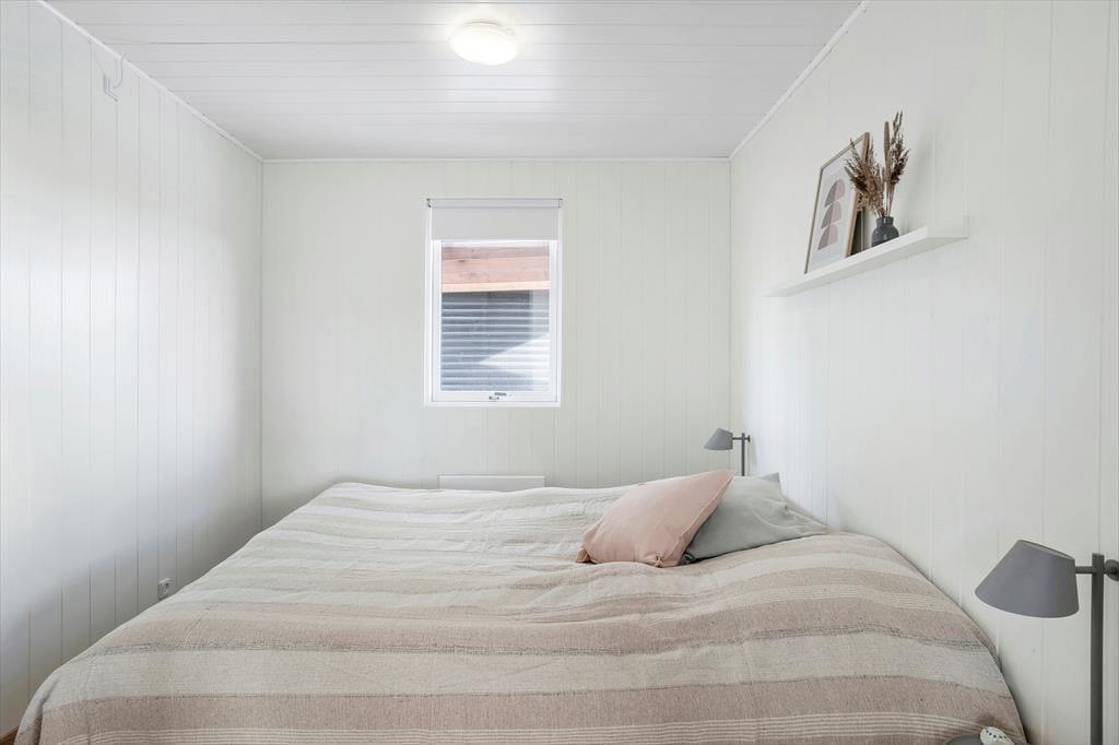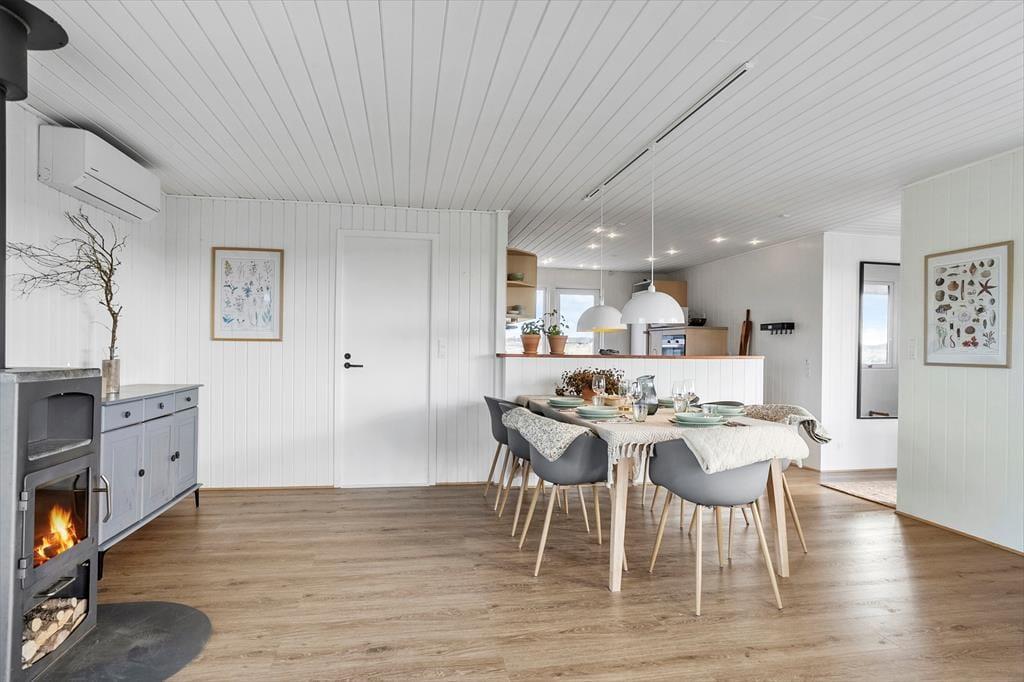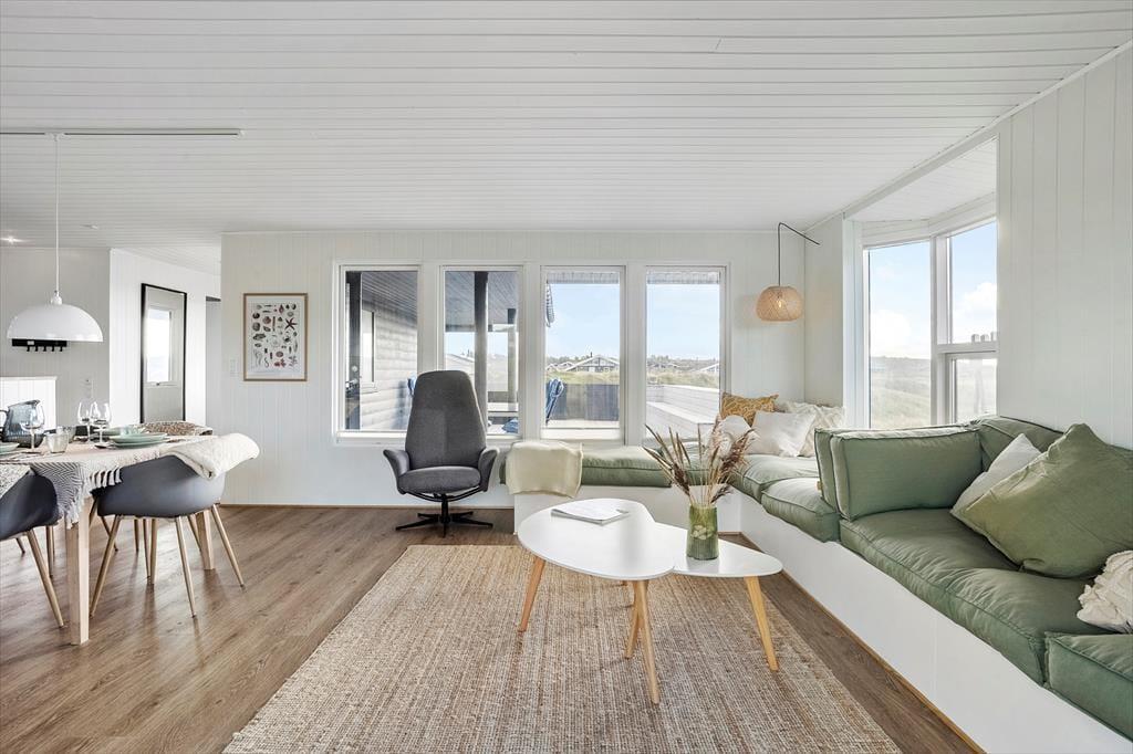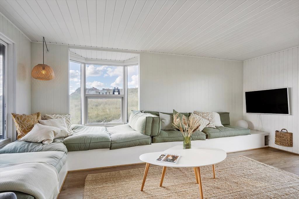Efter en vellykket renovering i 2022 har sommerhuset et lyst og indbydende indre. Vægge og lofter er malet hvide, og de store stuevinduer inviterer masser af dagslys indenfor og giver udsigt til de marehalmsklædte klitter. For eksempel er det skønt at slå sig ned med en god kop kaffe i den hyggelige sofakrog, der er etableret ved den vestvendte glaskarnap, og der er også mulighed for at rykke sig tættere på enten brændeovnen eller fladskærms-tv’et, hvis en af delene lokker. Fra stuen har I åben forbindelse til et stort og veludstyret køkken, og planløsningen byder derudover på tre gode soveværelser og et rummeligt badeværelse med badekar og vaskesøjle.