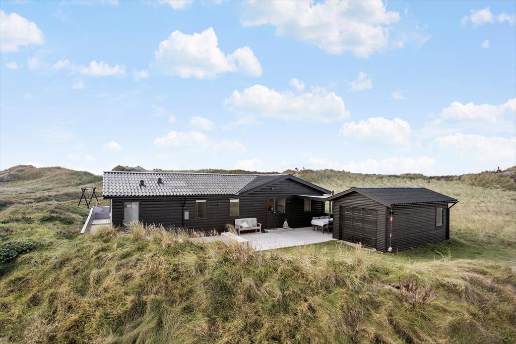 Den store naturgrund smelter på smukkeste vis sammen med det omkringliggende landskab, så I har virkelig fornemmelsen af at bo i klitterne. I forlængelse af terrassen er en mindre del af grunden skærmet af trådnet, hvilket hundeejerne måske især vil sætte pris på, mens børnefamilier kan glæde sig over gyngestativet. Den vestvendte og delvist overdækkede terrasse er helt lukket, og på den anden side af huset finder I endnu en skøn terrasse, der også har et åbent areal såvel som en overdækket lækrog.