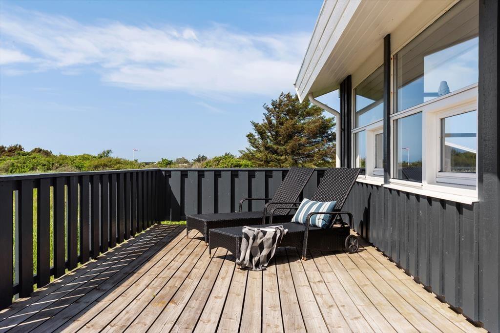 Du kan se frem til en herlig ferie, når den foregår i dette store og velindrettede sommerhus ved Nørlev Strand. I stuen kan du nyde den fine udsigt til de flotte indlandsklitter, og badeværelset indbyder til wellness takket være spabadet og saunaen – når du altså ikke hellere vil hygge dig med at spille bordtennis og dart eller lege på naturgrunden.