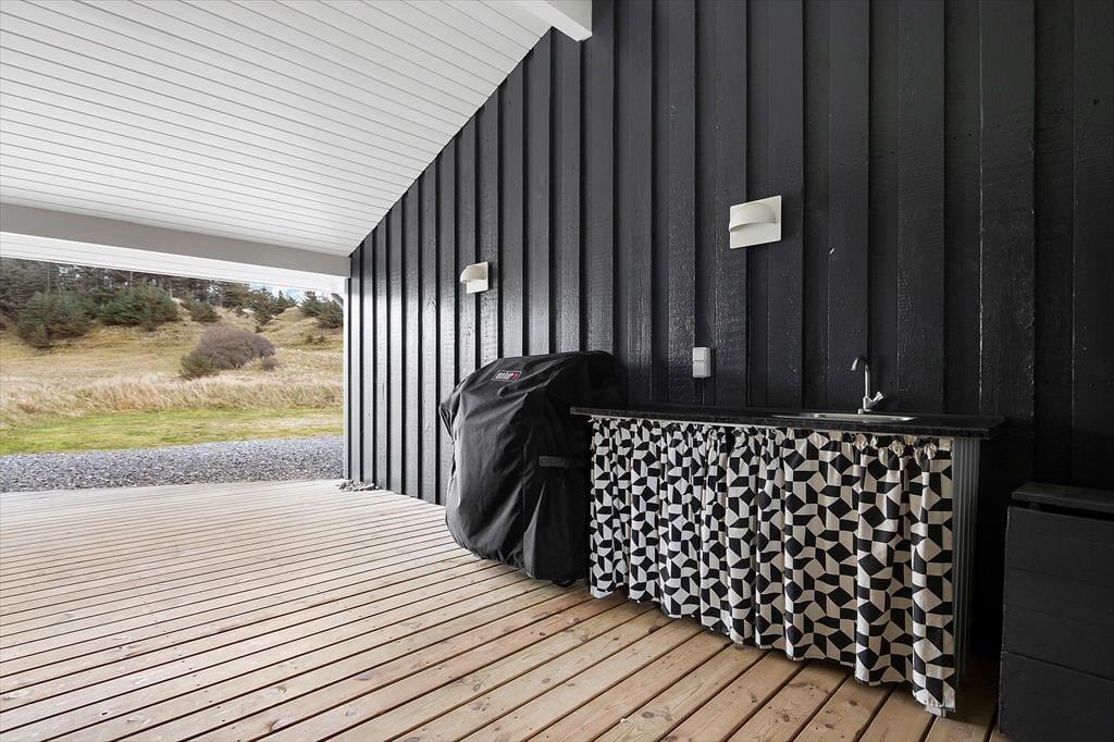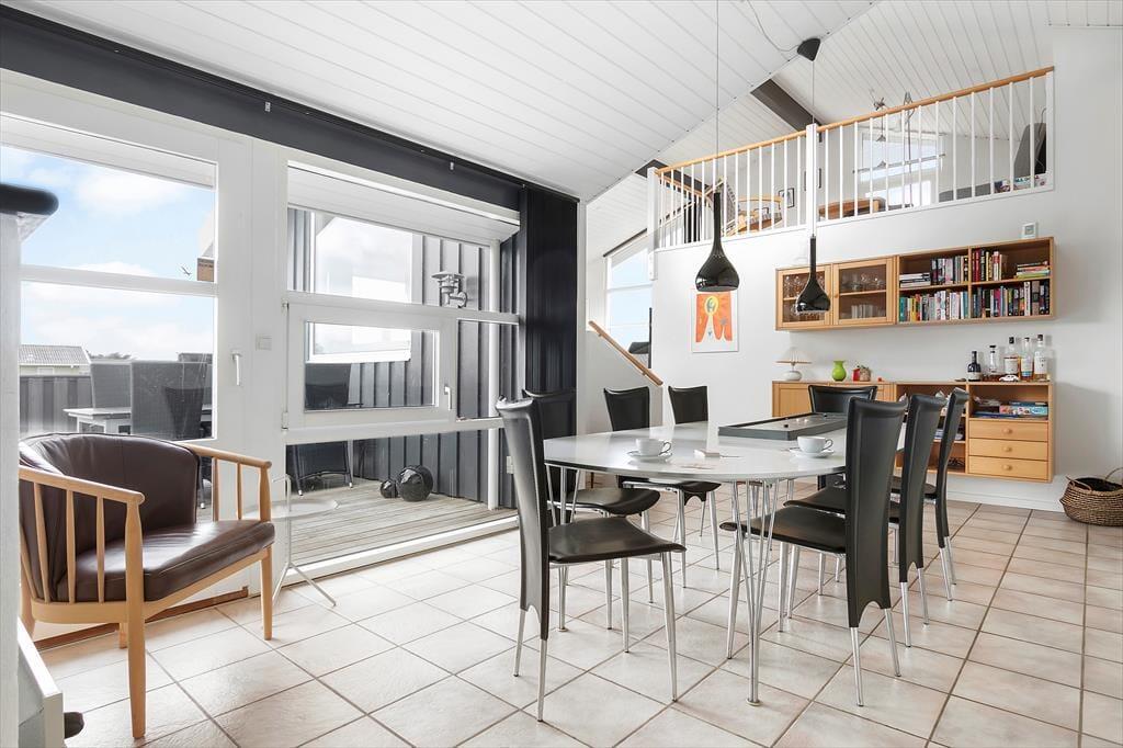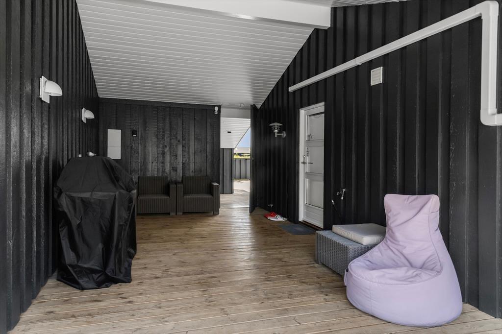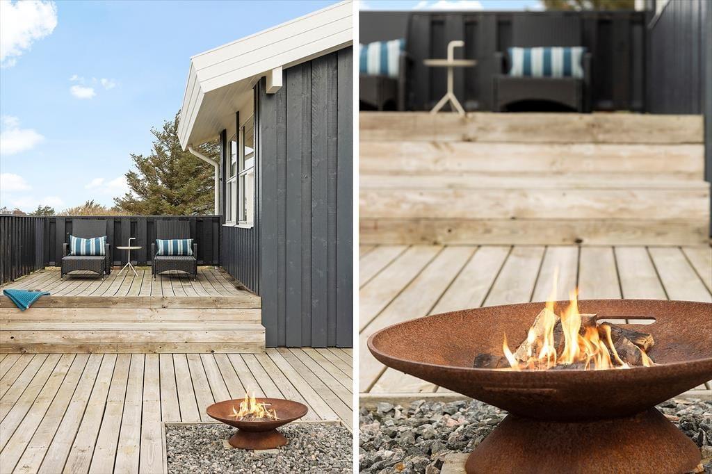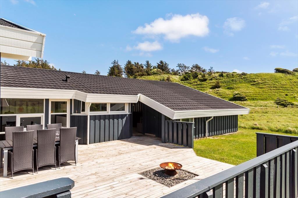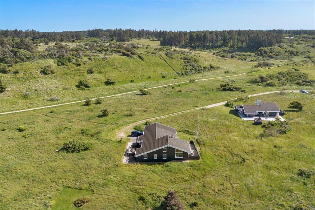Det smukke landskab med de høje indlandsklitter har du også frit udsyn til fra terrassemiljøet, der breder sig rundt om huset. Der er flere åbne og delvist afskærmede opholdspladser at vælge imellem, og mellem huset og garagen ligger en rigtig fin overdækket terrasse, hvis du er på udkig efter en krog med læ og skygge – eller ly om aftenen, når duggen falder. I garagen er der både bordtennisbord og dart, så her er der mulighed for, at du og familien kan hygge jer med langstrakte turneringer eller blot et hurtigt spil.
