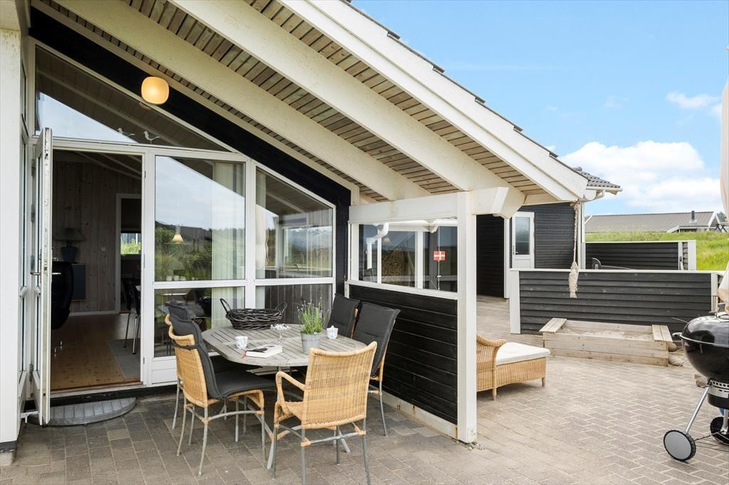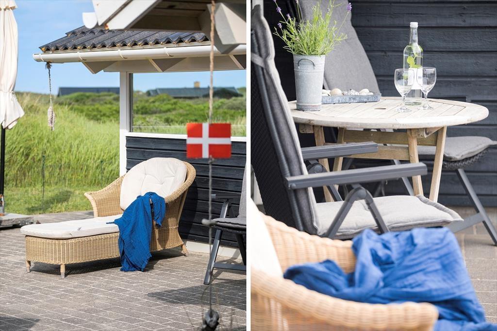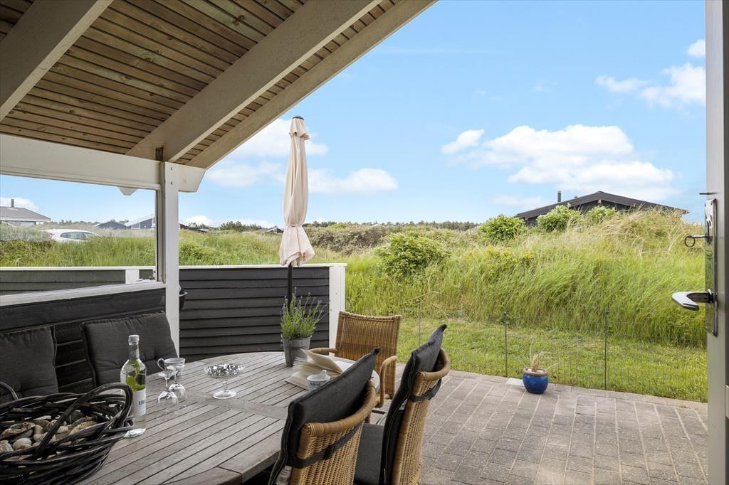 Udendørs strækker det store terrassemiljø sig mod syd og vest, omgivet af den rolige naturgrund. Her kan du nemt finde dit eget lille hjørne i solen eller søge ly i det overdækkede område, alt efter din præference. Havemøbler og liggestole står klar til at blive brugt, og med en grill til rådighed kan du nyde dine måltider udendørs, mens du suger til dig af de smukke og fredelige omgivelser.