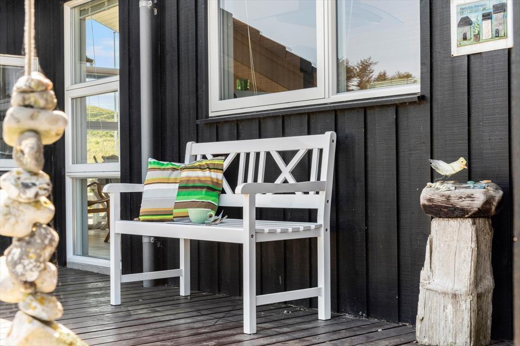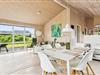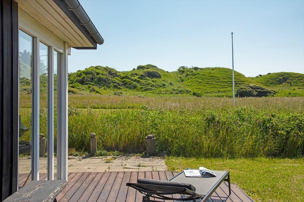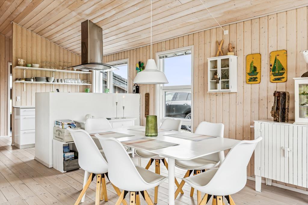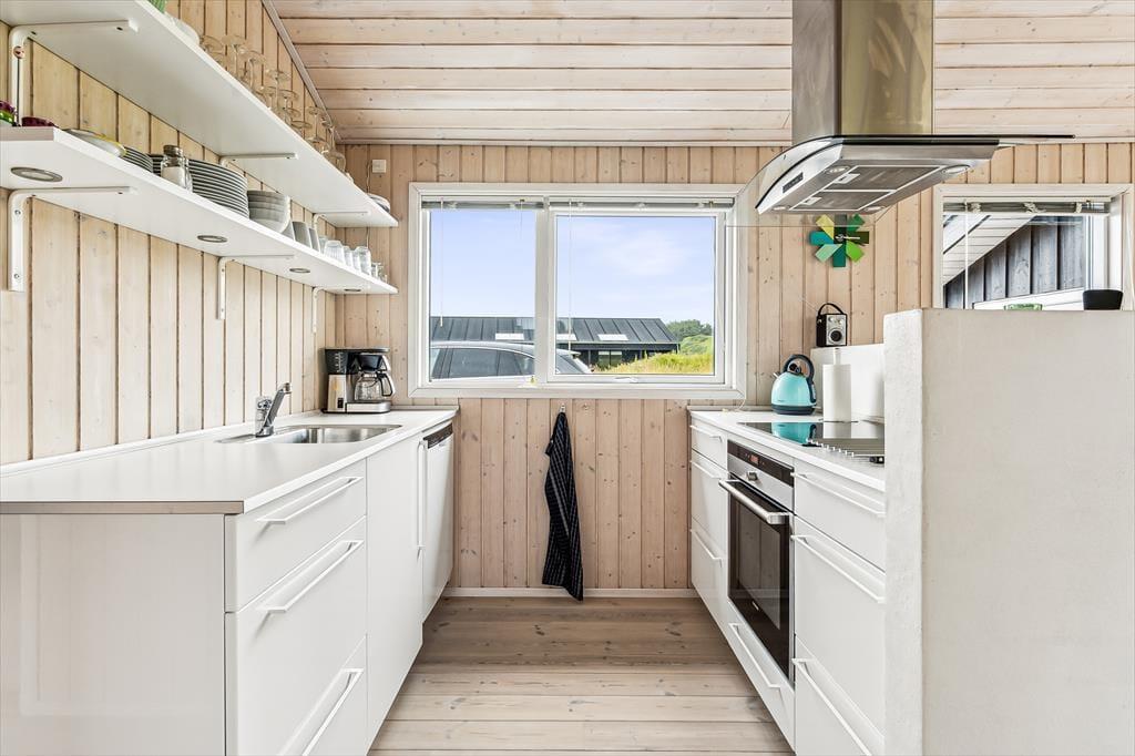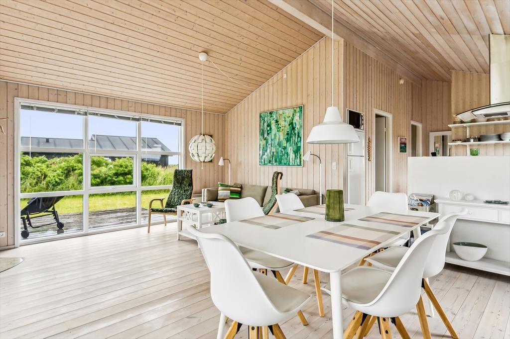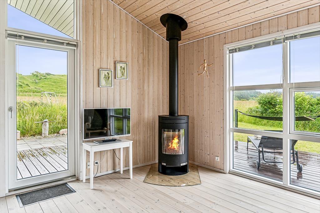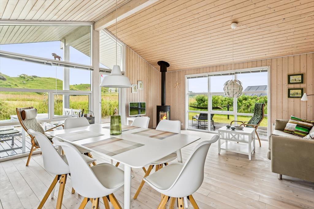 Når du træder ind i sommerhuset, mødes du af en lys og luftig indretning med loft til kip, som giver rummet en dejlig rummelighed. De store vinduer lukker naturen og lyset ind og giver en fantastisk udsigt til de omkringliggende indlandsklitter. Det åbne opholdsområde er perfekt til både afslapning og samvær, hvor du kan slappe af foran den hyggelige brændeovn eller nyde et måltid, mens du kigger ud på den smukke natur. Den enkle, lyse indretning giver en rolig og afslappet atmosfære, der indbyder til både hygge og fordybelse.