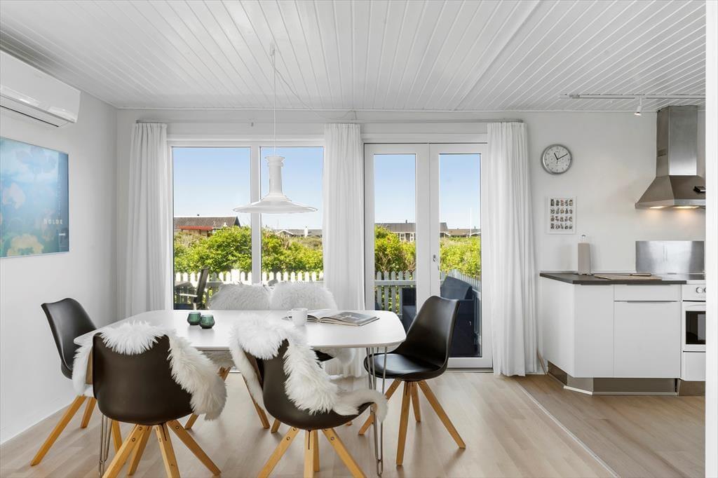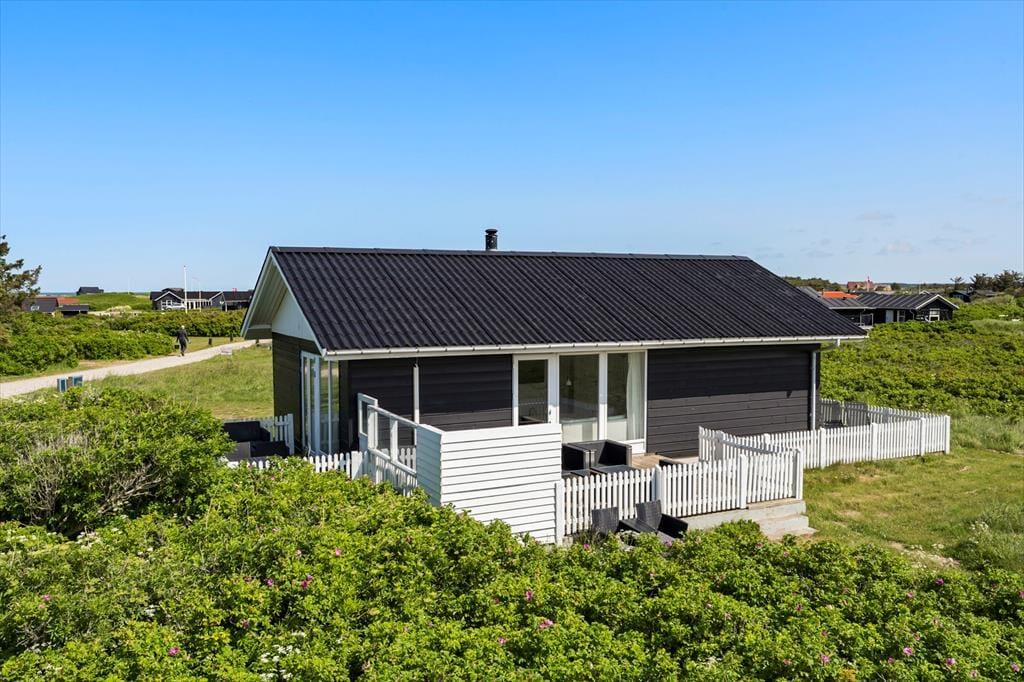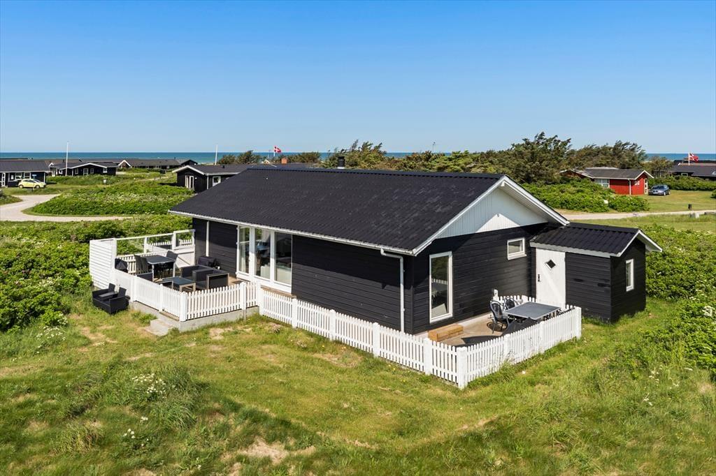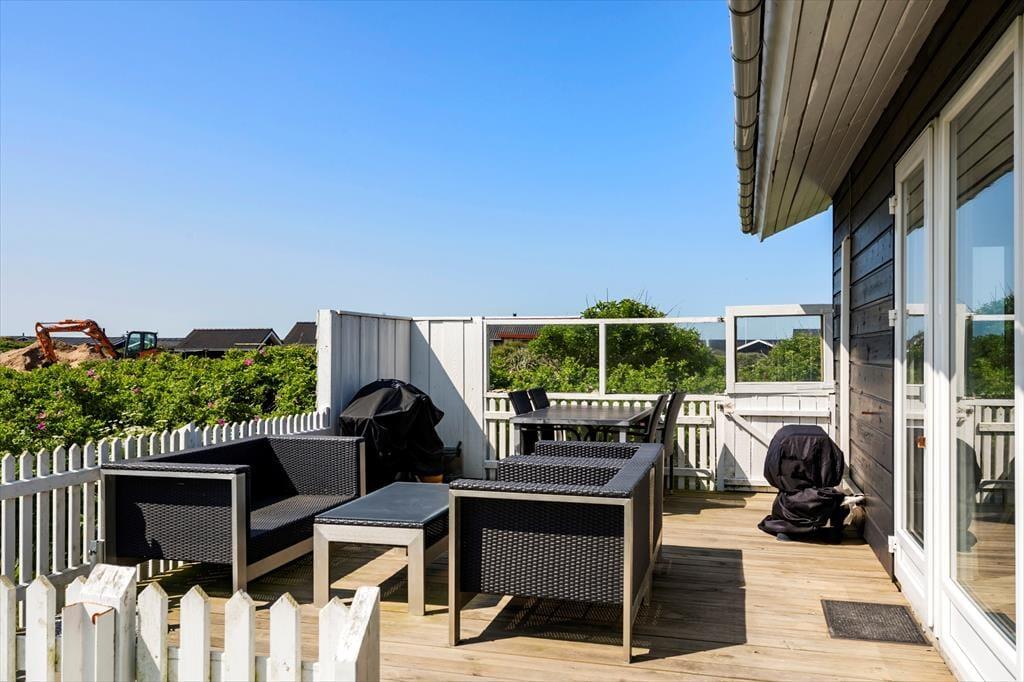 Udenfor venter en skøn stor træterrasse, som bliver et naturligt samlingspunkt i sommerhalvåret. Her kan du tage morgenkaffen med ud i solen og lade dagen begynde med udsigt til de bløde indlandsklitter, der bølger sig som et naturligt bagtæppe bag haven. Terrassen er udstyret med komfortable havemøbler, så du kan læne dig tilbage og lade roen sænke sig – hvad enten du nyder en god bog, en frokost i det fri eller en stille stund med lukkede øjne og lyden af naturen omkring dig. Når solen går ned, og duggen falder, kan du tænde op i grillen og forlænge dagen i det lune aftenlys. Uanset årstid er det let at forestille sig, hvordan det føles at finde ro her – i læ, med udsigt, i nær kontakt med naturen. Og det bedste af det hele? Du har kun få minutters gang til Vesterhavet, så du kan hurtigt smutte en tur ned til stranden, når trangen til vind i håret og sand under fødderne melder sig.