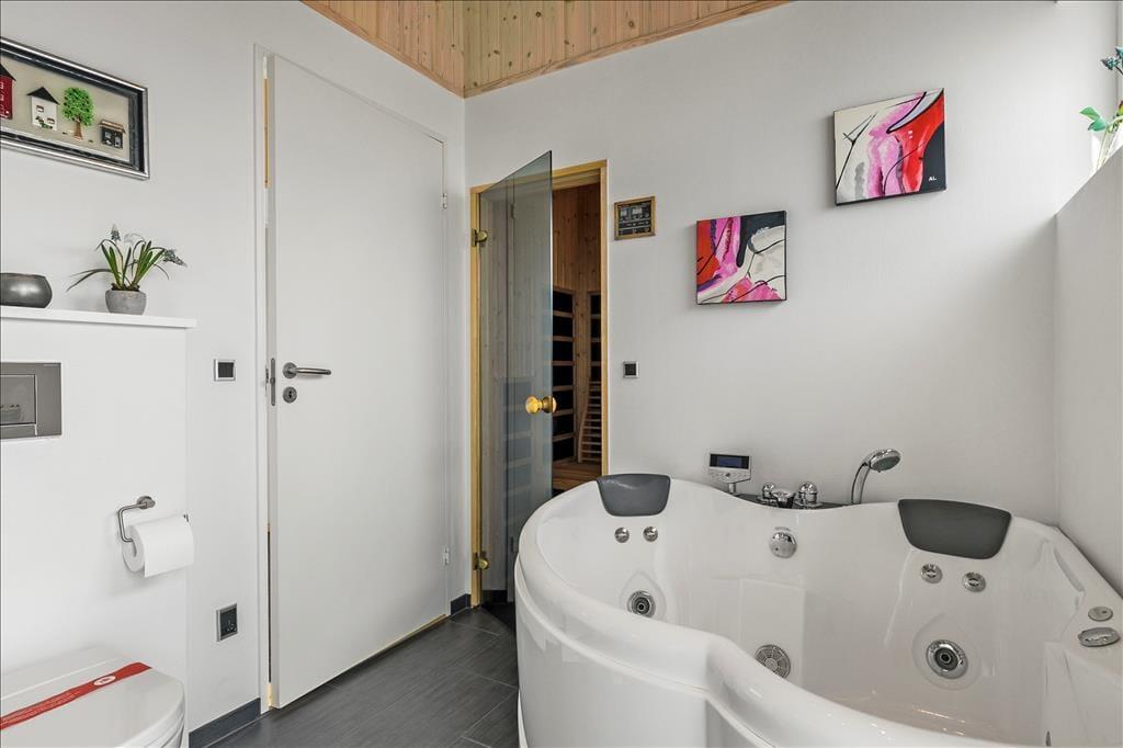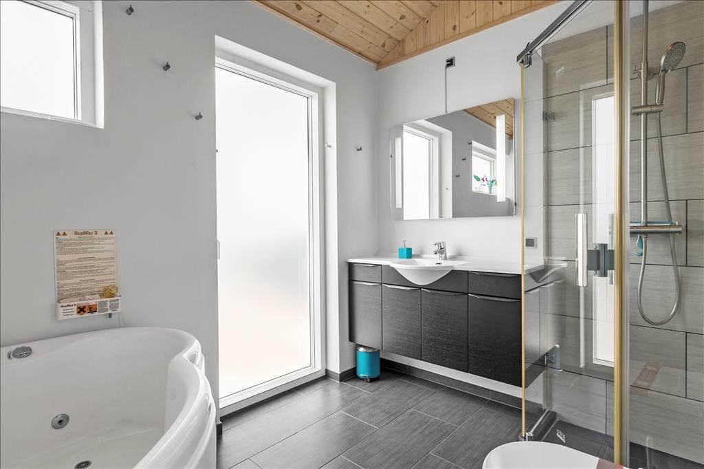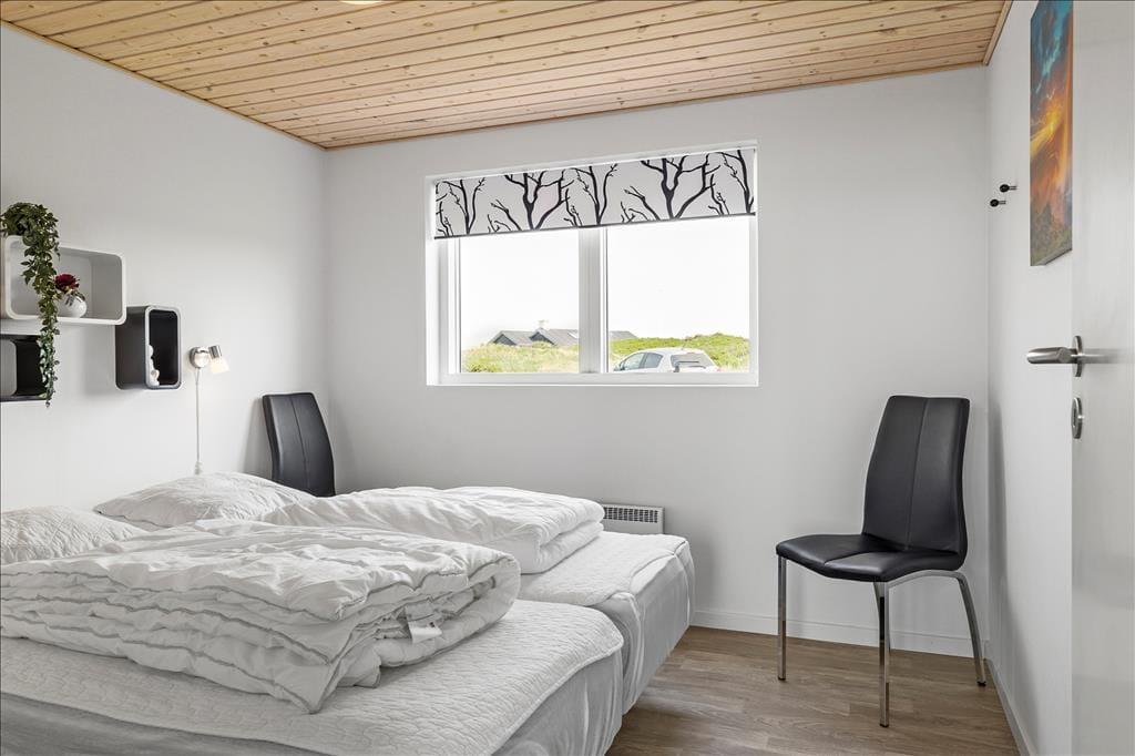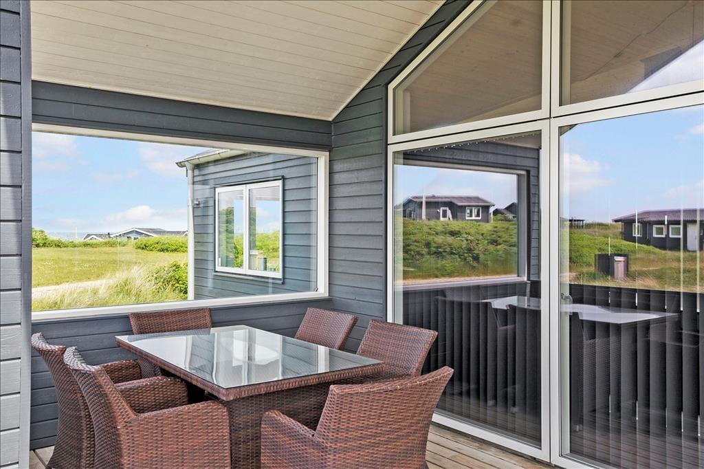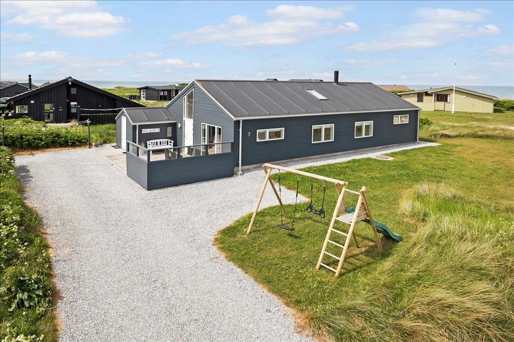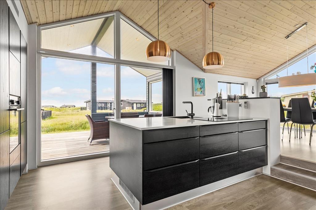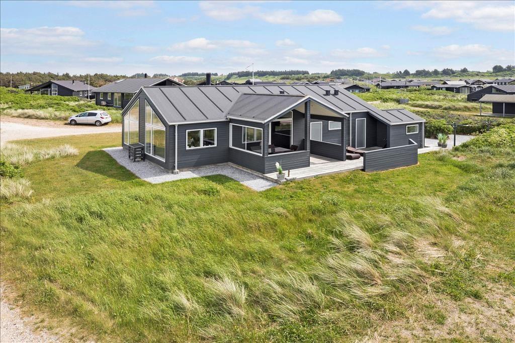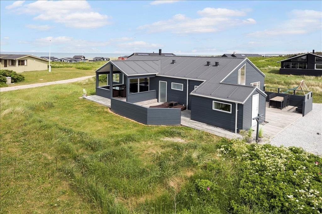 Sommerhuset er smagfuldt og praktisk indrettet med de bedste materialer. Især skal fremhæves det smukke Invita køkken, som indbyder til kulinarisk udfoldelse. Fra køkkenet giver en dobbelt havedør adgang til en overdækket terrasse, hvor man kan nyde sine måltider. Et par skridt op fra køkkenet ligger den smagfuldt indrettede stue med flotte og moderne møbler. Fra stuen har du en flot udsigt over Vesterhavet. Sommerhuset er godt isoleret, har gulvvarme og vand til luft varmepumpe, så energiomkostningerne er rimelige. Sommerhusets brændeovn giver god varme på kolde aftener, og bidrager til den hyggelige stemning. Der er store flotte panoramavinduer, som giver et flot lysindfald. Hemsen er indrettet med 2 madrasser og et par skønne ”Fatboys”, så man kan hygge sig, mens man samtidig kan kigge på stjerner gennem ovenlysvinduet. Der er 3 gode soveværelser alle med dobbeltværelser og god skabsplads. Sommerhuset har 2 badeværelser, hvor det ene byder på spa og infrarød sauna.
