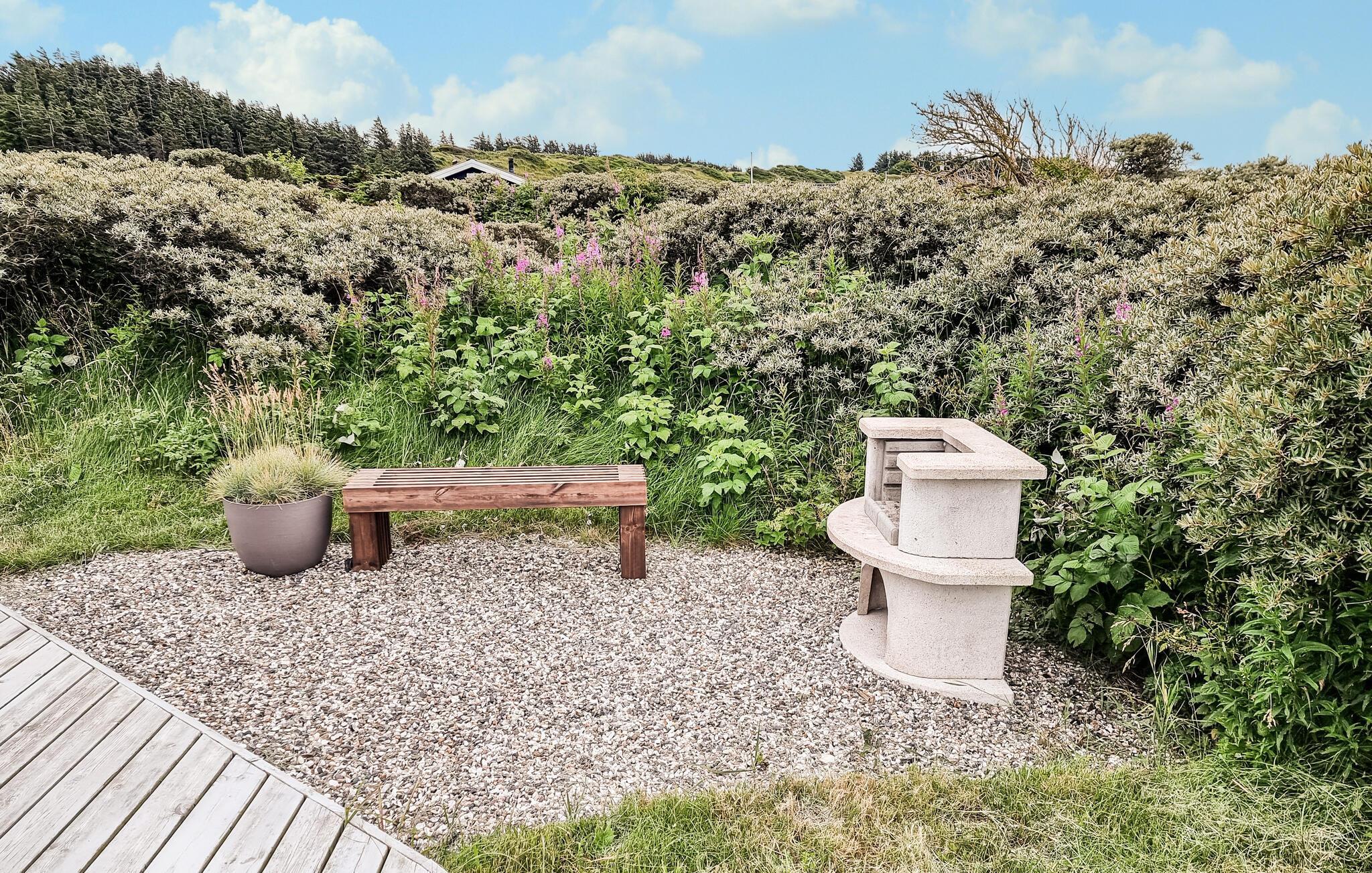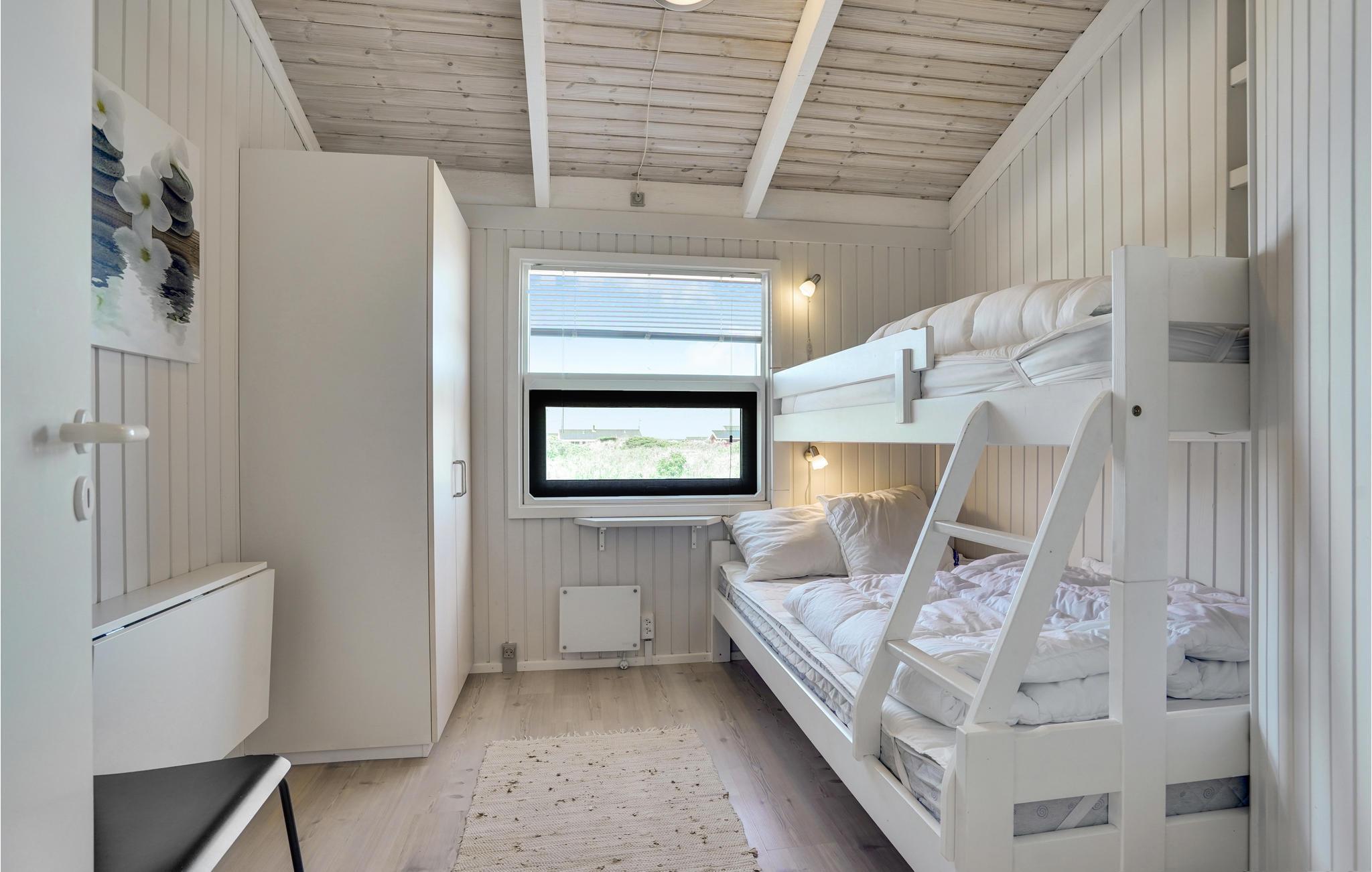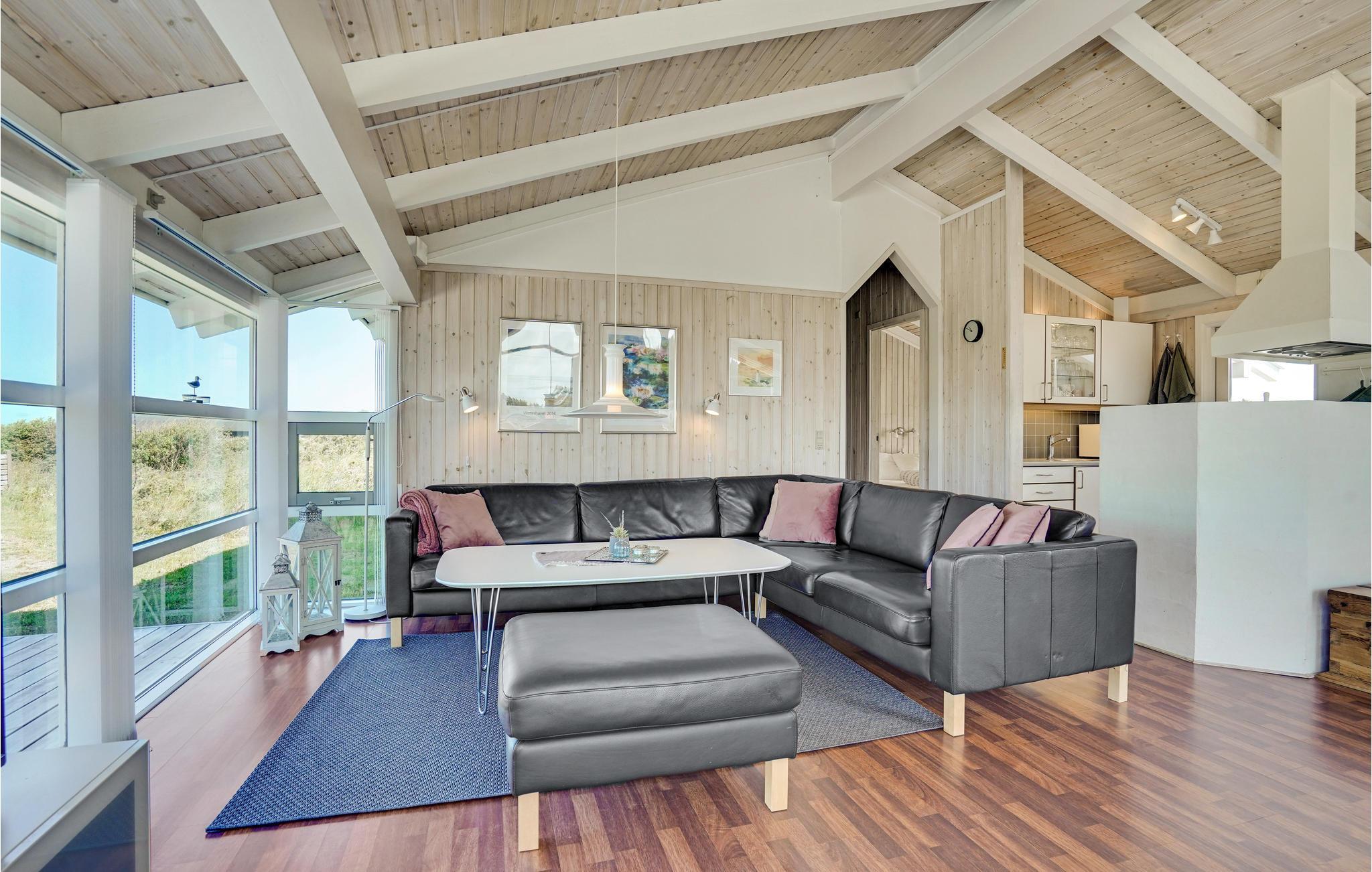 Dette herlige feriehus ligger på en kuperet klitgrund ved en af vestkystens fineste badestrande. Her er en bred, børnevenlig sandstrand og lune klitgryder at solbade i. Solnedgangene er her til alle årstider en helt fantastisk oplevelse. Der er kun få minutters kørsel til Lønstrup, hvor man som et af de få steder i Danmark stadig kan se fiskekutterne blive trukket op på stranden med deres fangst af frisk fisk. I Lønstrup hersker en egen, charmerende stemning med spændende butikker, gallerier, kunstværksteder og hyggelige spisesteder. Hvis man vil se hvad naturens barske kræfter kan udrette, hvis de uhindret får lov at rase, skal man tage til Mårup Kirke, som endnu står på den yderste kant af en klint i fare for at falde i havet, samt vandreklitten Råbjerg Mile, som flytter sig årligt flere meter mens den begraver alt under sig. Søger man sportslig udfoldelse, ligger Skallerup Klit feriecenter med et tropisk badeland, minigolf, squash, bordtennis, badminton- og tennisbaner samt et aktivitetscenter 5 minutters kørsel fra huset. Mere end 50 spændende forlystelser for alle uanset alder og vovemod byder også FÅRUP SOMMERLAND på, kun en halv times kørsel fra feriehuset. Her finder man f.eks. Aquaparken, som er Nordens største udendørs vandland. Er man villig til at køre en lille times tid, er Nordjyllands hovedstad Aalborg med de prægtige gamle huse i bykernen, det smukke kunstmuseum, Tivoliland, Zoologisk Have samt flere gode museer et godt udflugtsmål. Dagen kan afsluttes med en bid mad i den maleriske Jomfru Ane Gade eller på toppen af det 105 m høje Aalborg-tårn, mens man nyder udsigten over by og fjord.