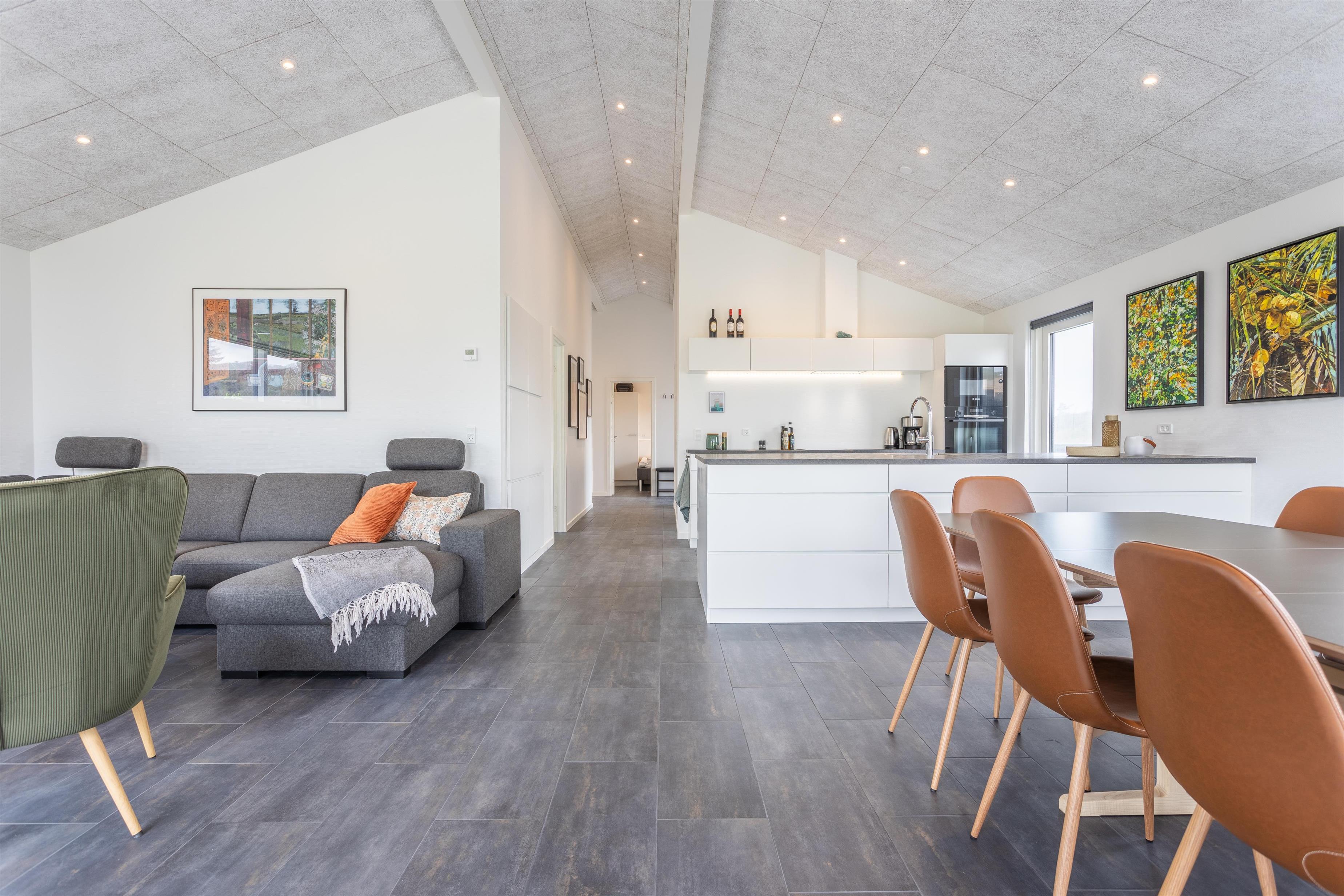 Det dejlige store opholdsrum indbyder til samvær og hyggestunder. Fra stuen er der adgang til en stor overdækket samt åben terrasse – hvorfra I har adgang til wellness-området og udsigten til det ugenerede bakkelandskab. Huset er indrettet med et stort og a°bent opholdsmiljø, hvor køkken og stue er samlet. Der er hele to køleskabe og to frysere til rådighed. Huset har desuden 5 gode og rummelige soveværelser med 12 sovepladser. Derudover er der to flotte badeværelser, hvoraf det ene er med to brusere.