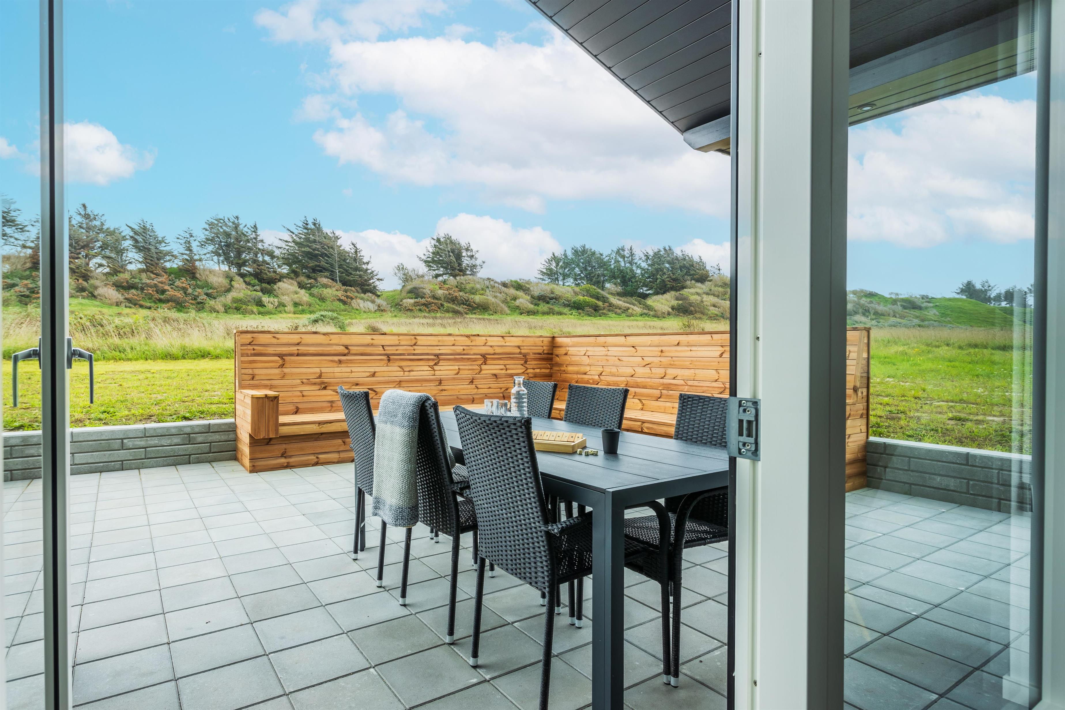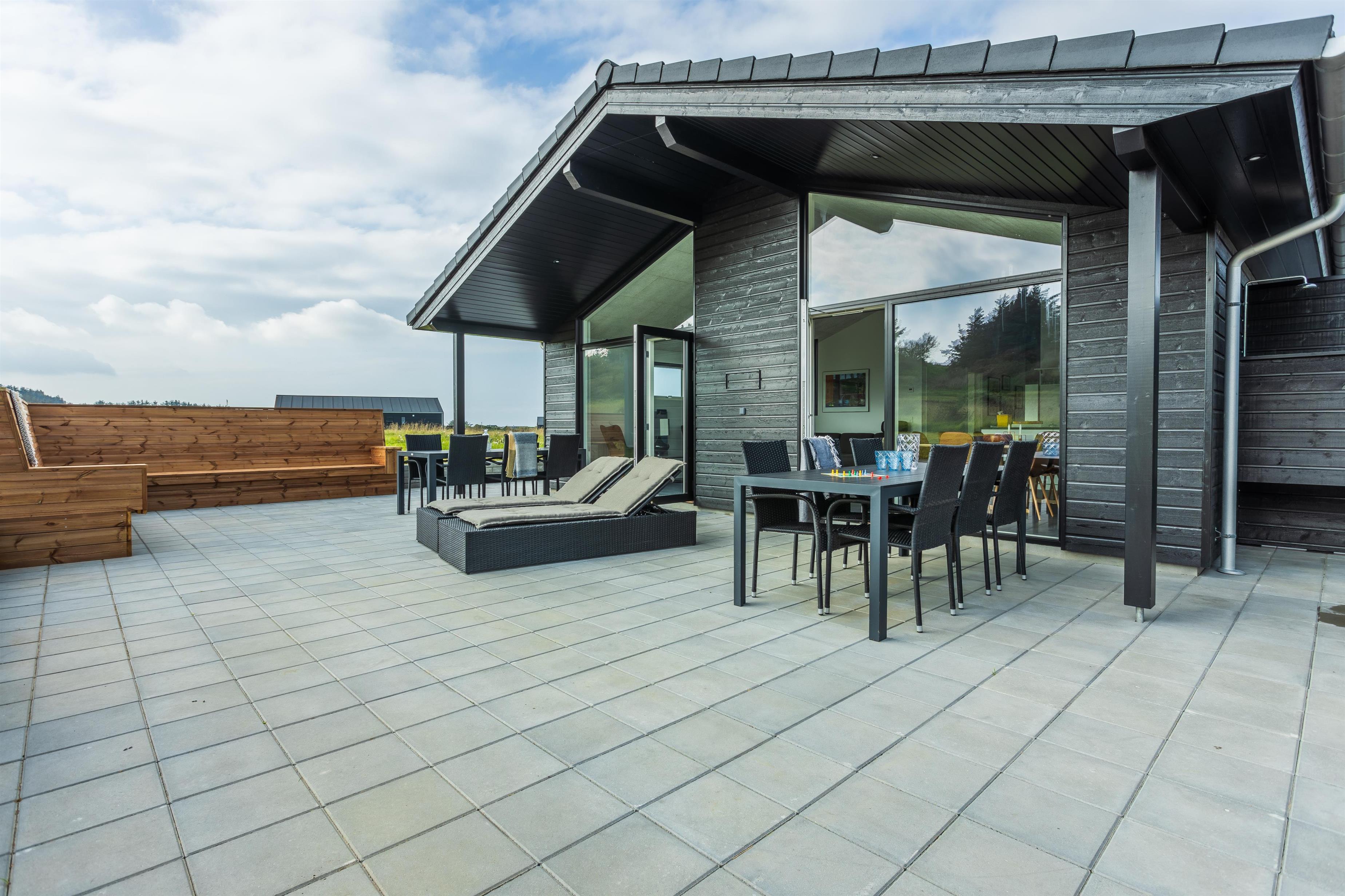 Huset er indrettet med en stor og rummelig terrasse samt et wellness-område med både udebruser (med varmt og koldt vand), spa og sauna. Terrassen ligger ugeneret bag ved huset og grænser op til et fredet område og med det bakkede landskab i baggrunden. Der er et delvist overdækket terrassemiljø samt et stort åbent uderum, og på plænen er der mulighed for at boltre sig eller dyste i diverse havespil.