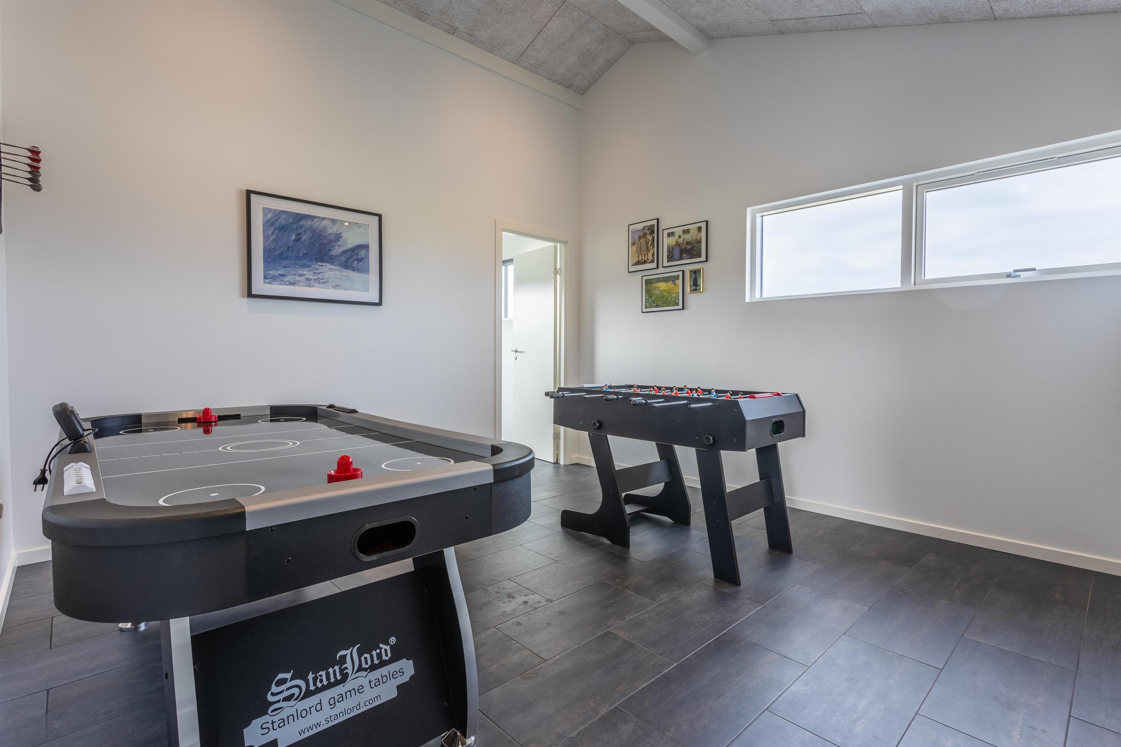 Går man ud af hoveddøren og drejer mod venstre, går man ind i aktivitetsrummet. Dette hænger sammen med huset og byder på både dart, bordfodbold og airhockey. Det er også her, I finder vaskemaskine og tørretumbler. Fra aktivitetsrummet har I direkte adgang til husets 5. soverum, som er indrettet med 2 køjesenge og et stort tv.