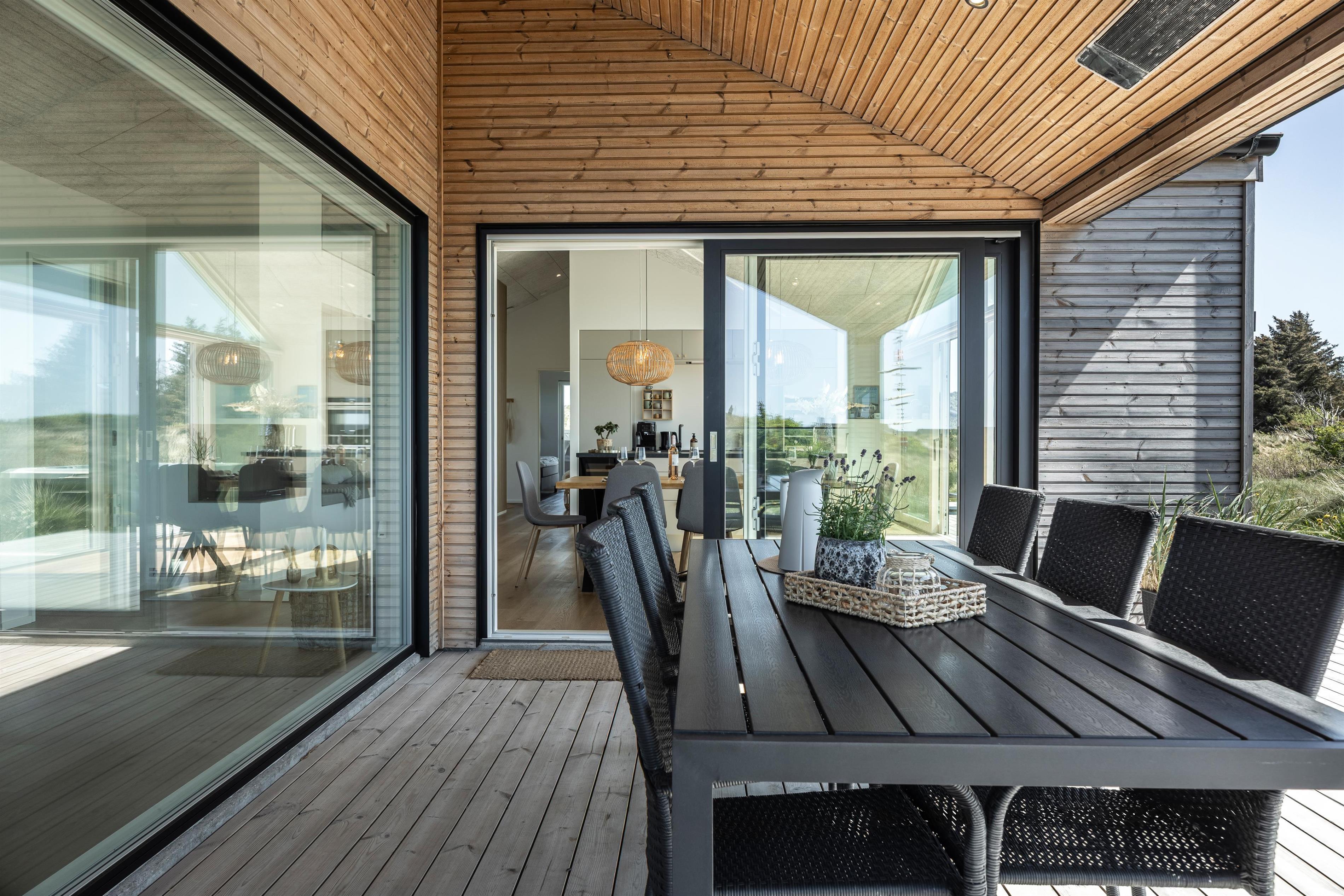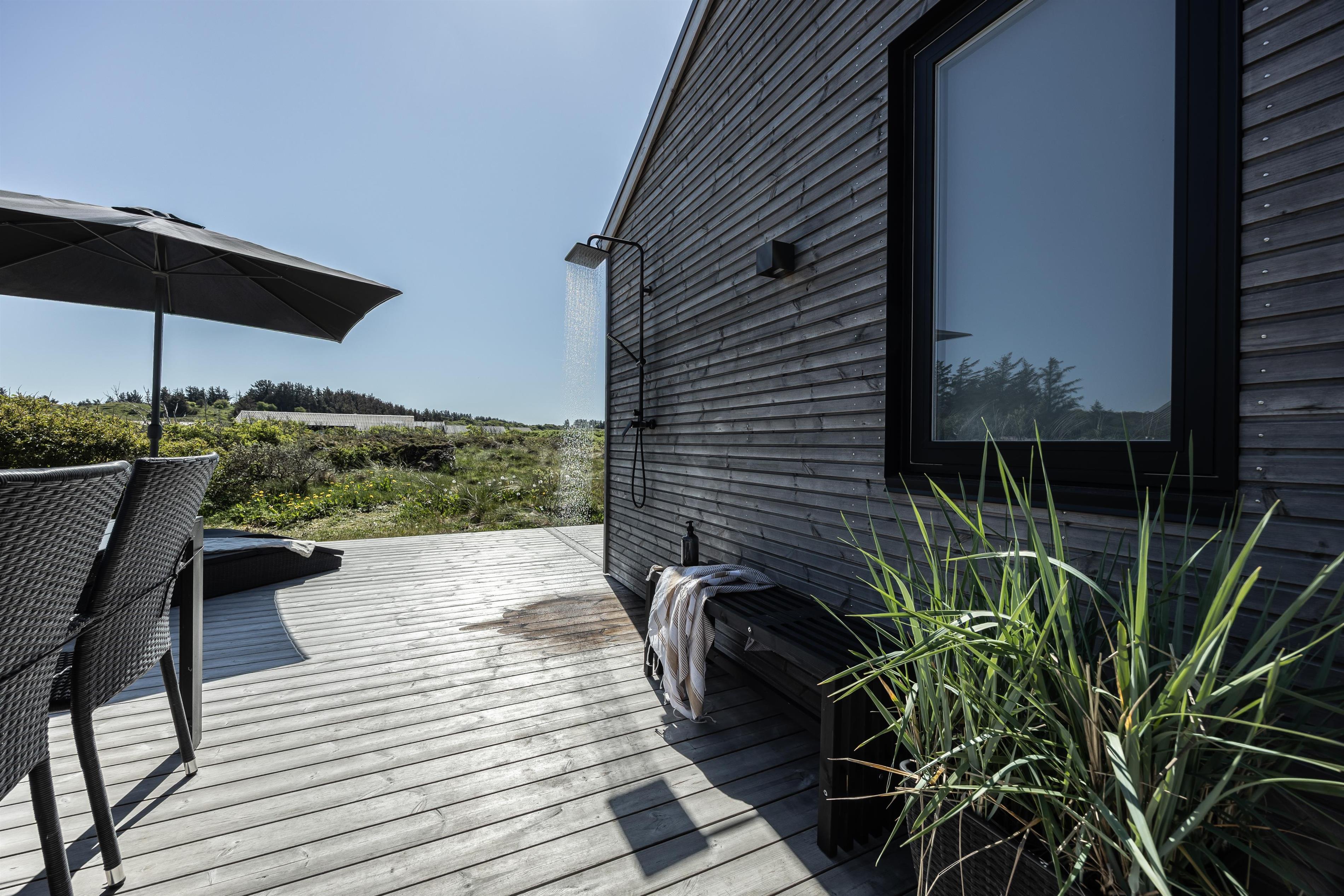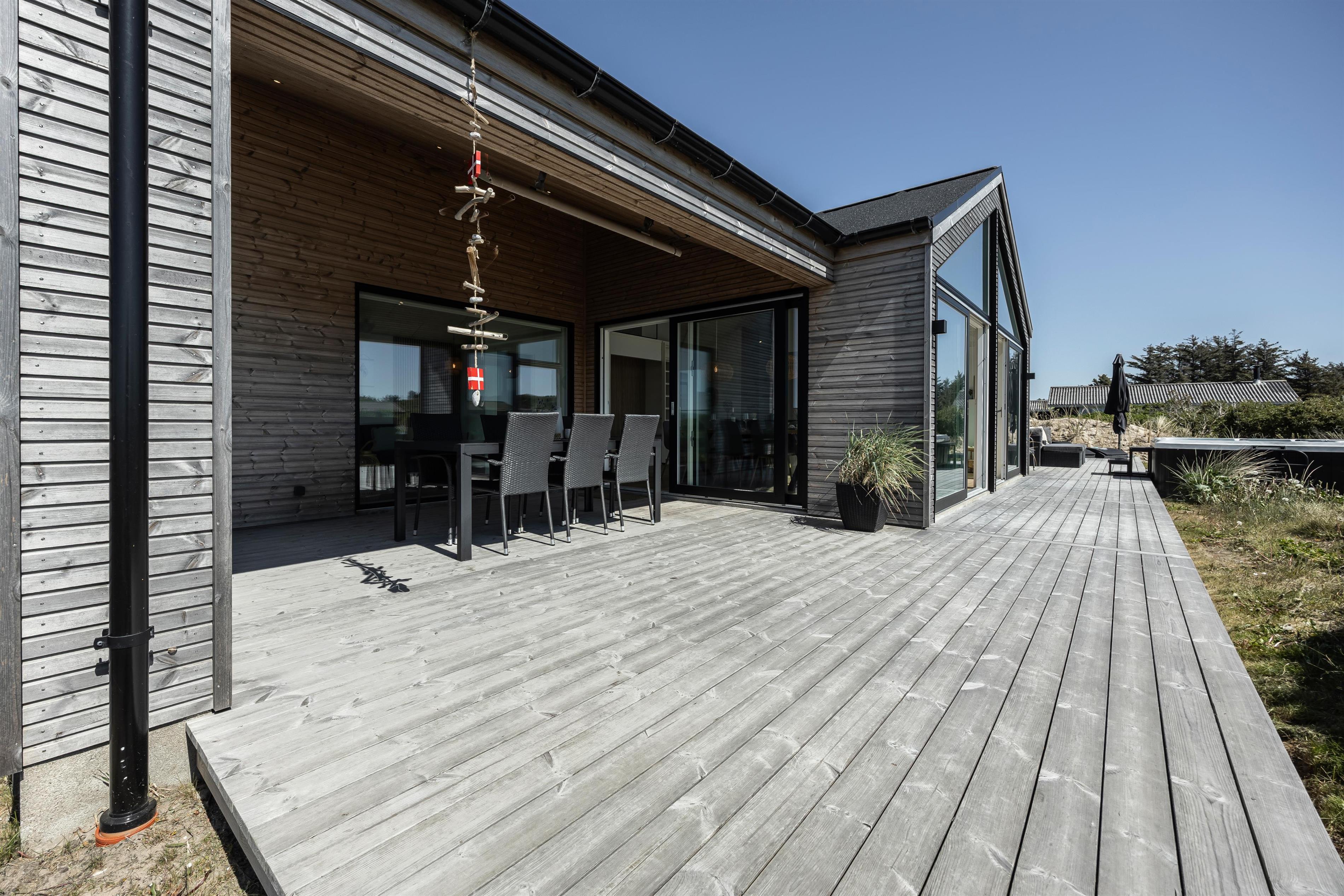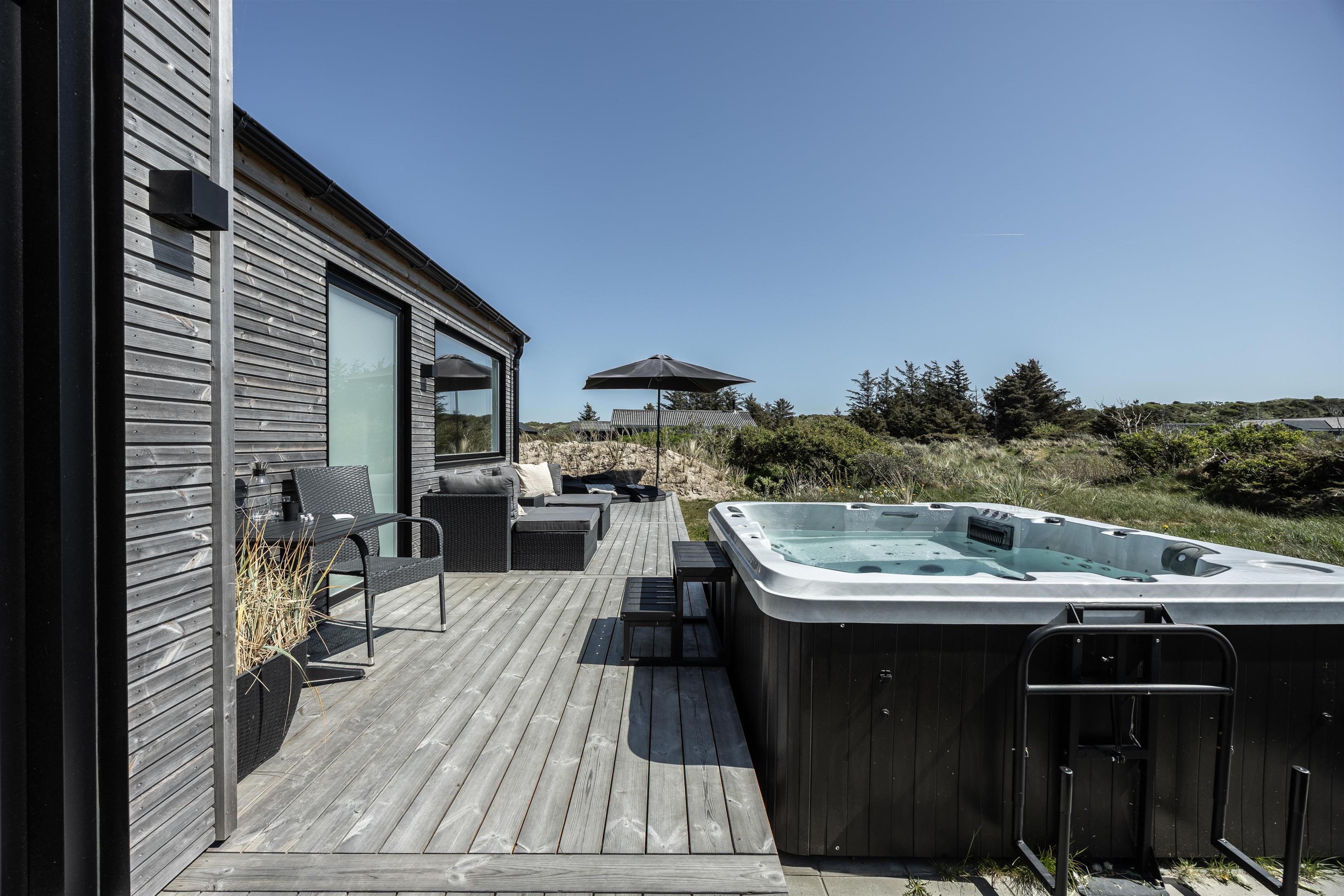 Huset er indrettet med en stor og rummelig træterrasse, der omkranser det meste af huset. Desuden har man også mulighed for at nyde de dejlige sommeraftener under den overdækkede terrasse. Huset ligger meget ugeneret, og I kan i ro og mag nyde et glas vin i loungesættet eller nyde roen i liggestolene, der er til rådighed ved huset. Både sommer og vinter har I muligheden for at hoppe i den udendørs spa ved huset - slå vandmassagen til og nyd roen og naturen i det dejlig varme vand.
