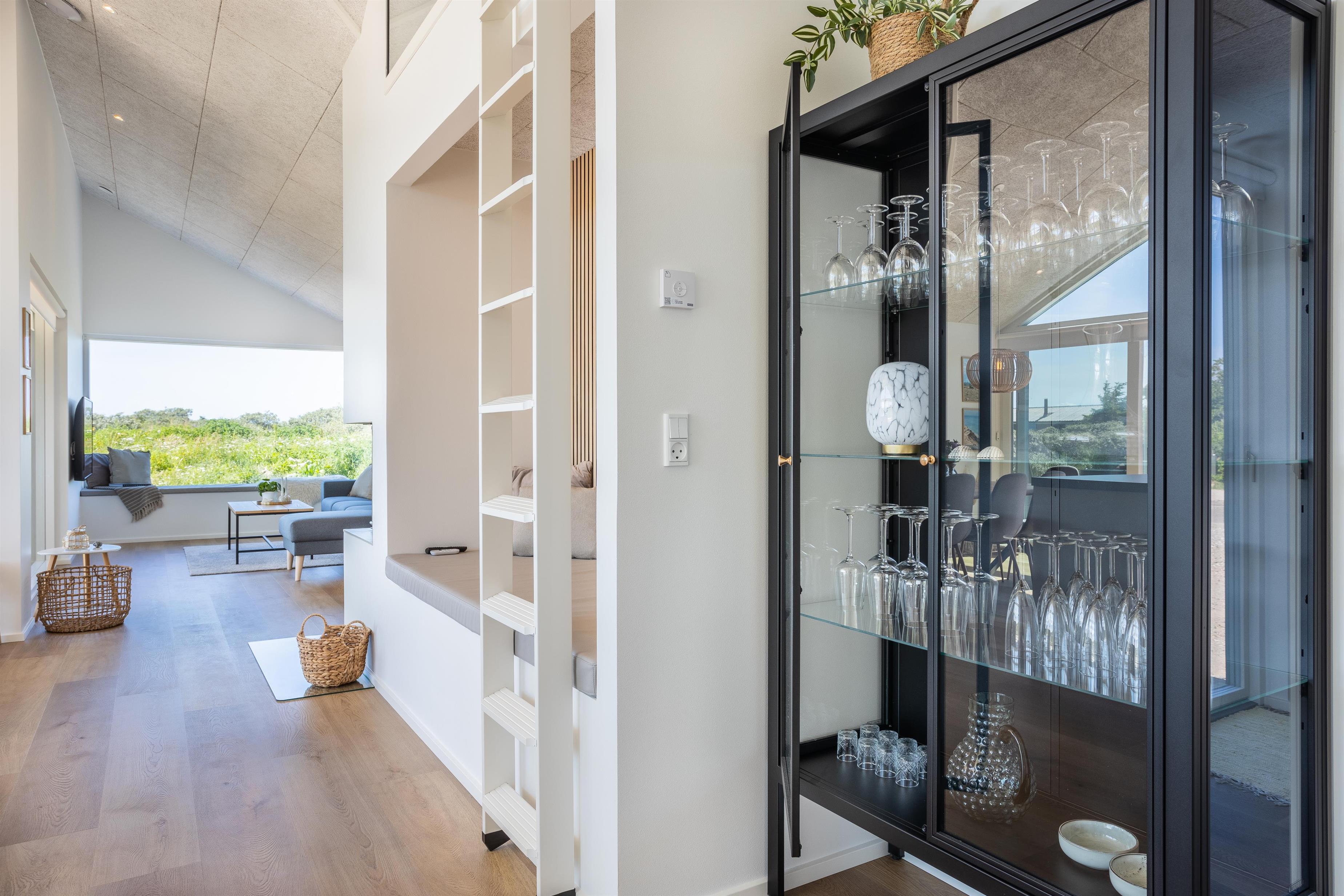 Nyd dette skønne sommerhus, som hører til i kategorien af huse i topkvalitet. I dette feriehus er alt opført i de bedste materialer. Med loft-til-kip og store gulv-til-loft vinduer inviteres sollyset og naturen indenfor. Den hyggelige stue indbyder til samvær, hyggestunder og fordybelse. Fra alrummet er der adgang til en stor overdækket terrasse, hvorfra man kan sidde og nyde udsigten. Huset er indrettet med et a°bent opholdsmiljø, hvor spisepladsen binder stue og køkken sammen og fungerer fint som husets centrale sted. Sommerhuset råder over 8 gode sovepladser i alt fordelt på 3 gode og rummelige soveværelser, en hems samt en sovesofa. Derudover er der to flotte badeværelser, hvoraf det ene er med spa og sauna. Saunaen er udstyret med et stort vindue, hvor udsigten til den smukke, rå natur kan nydes inde fra varmen. I husets aktivitetsrum kan I få mange timers sjov rundt om fodboldbordet, tage et spil dart eller blot sætte en god film på tv'et.