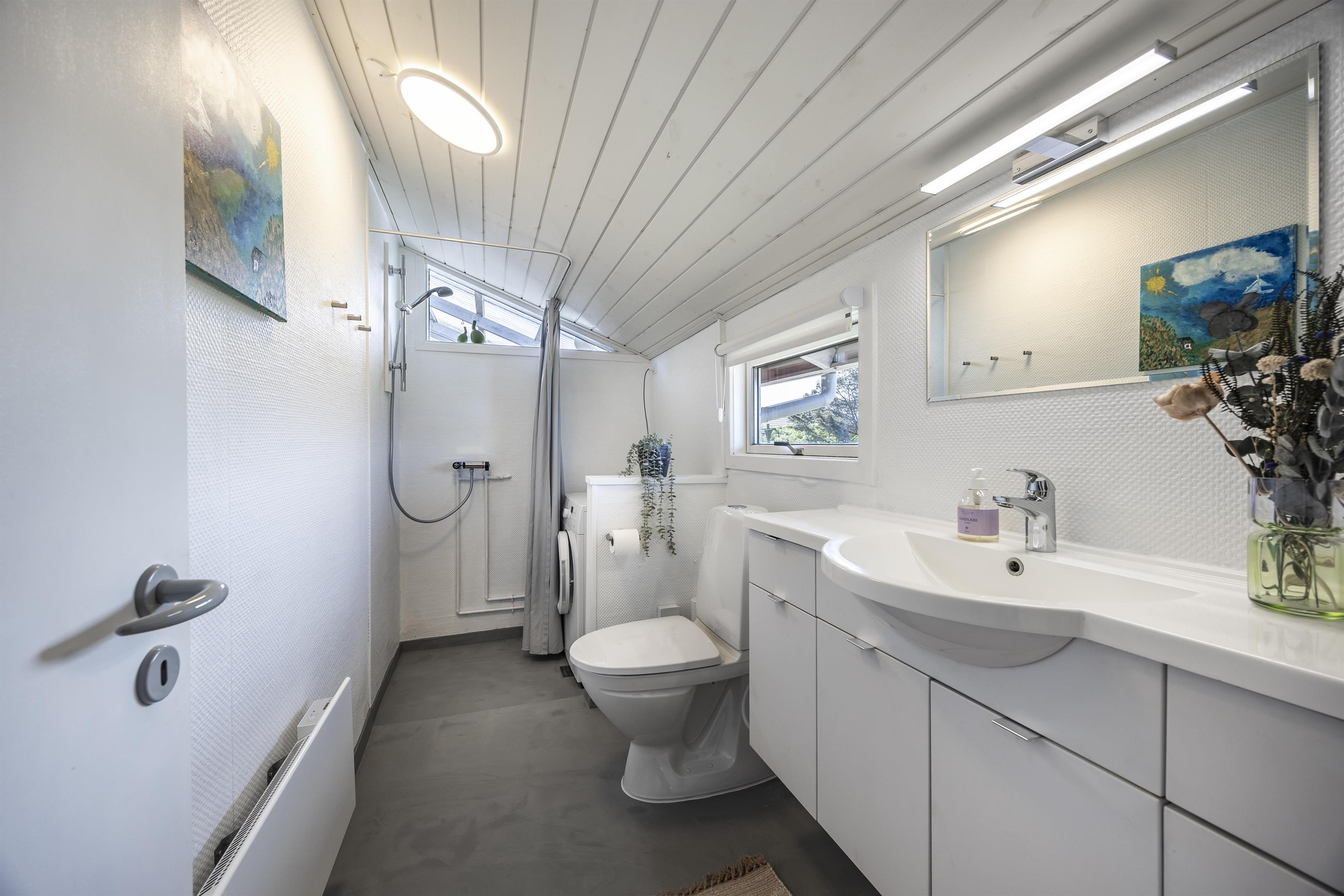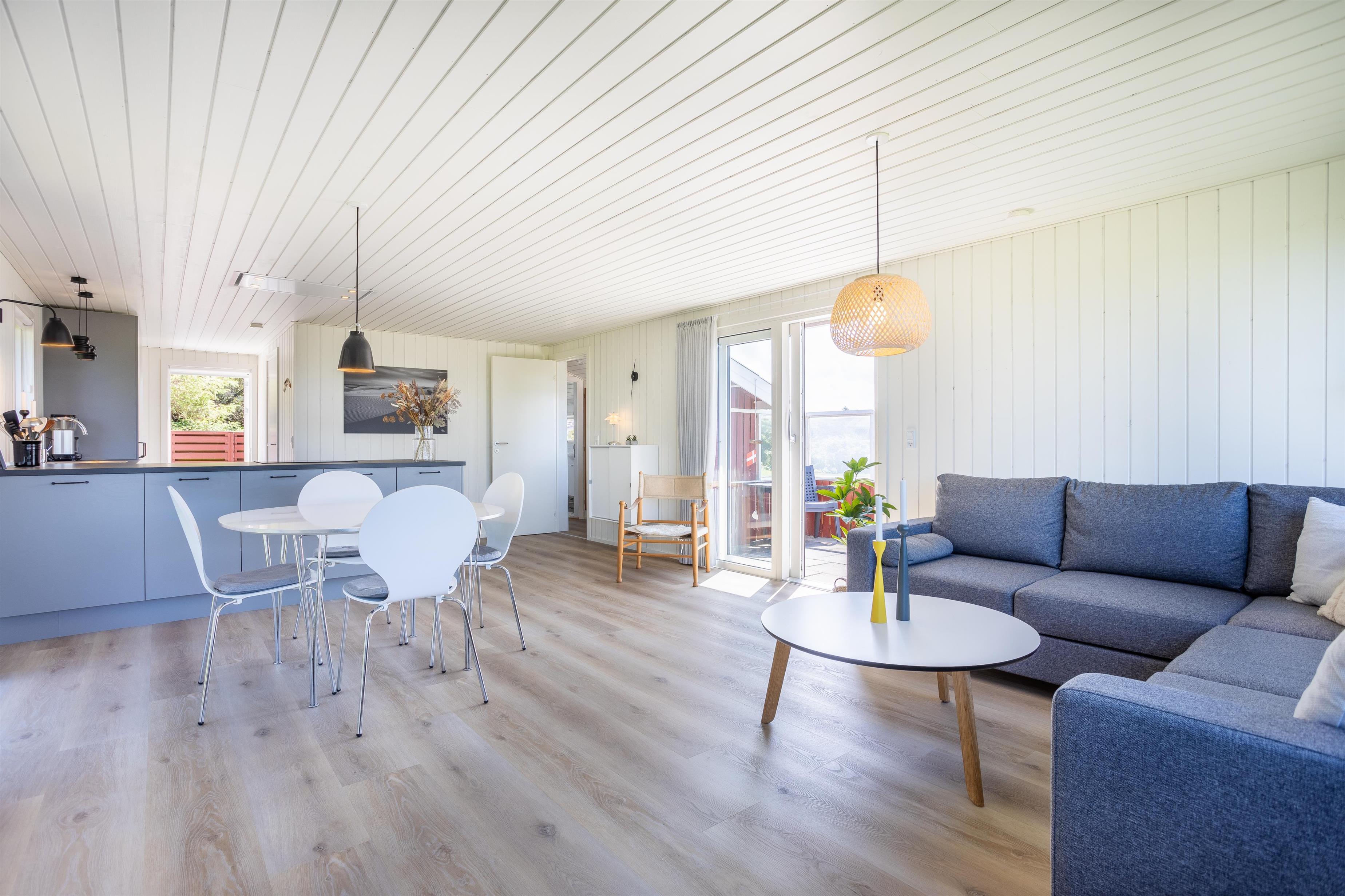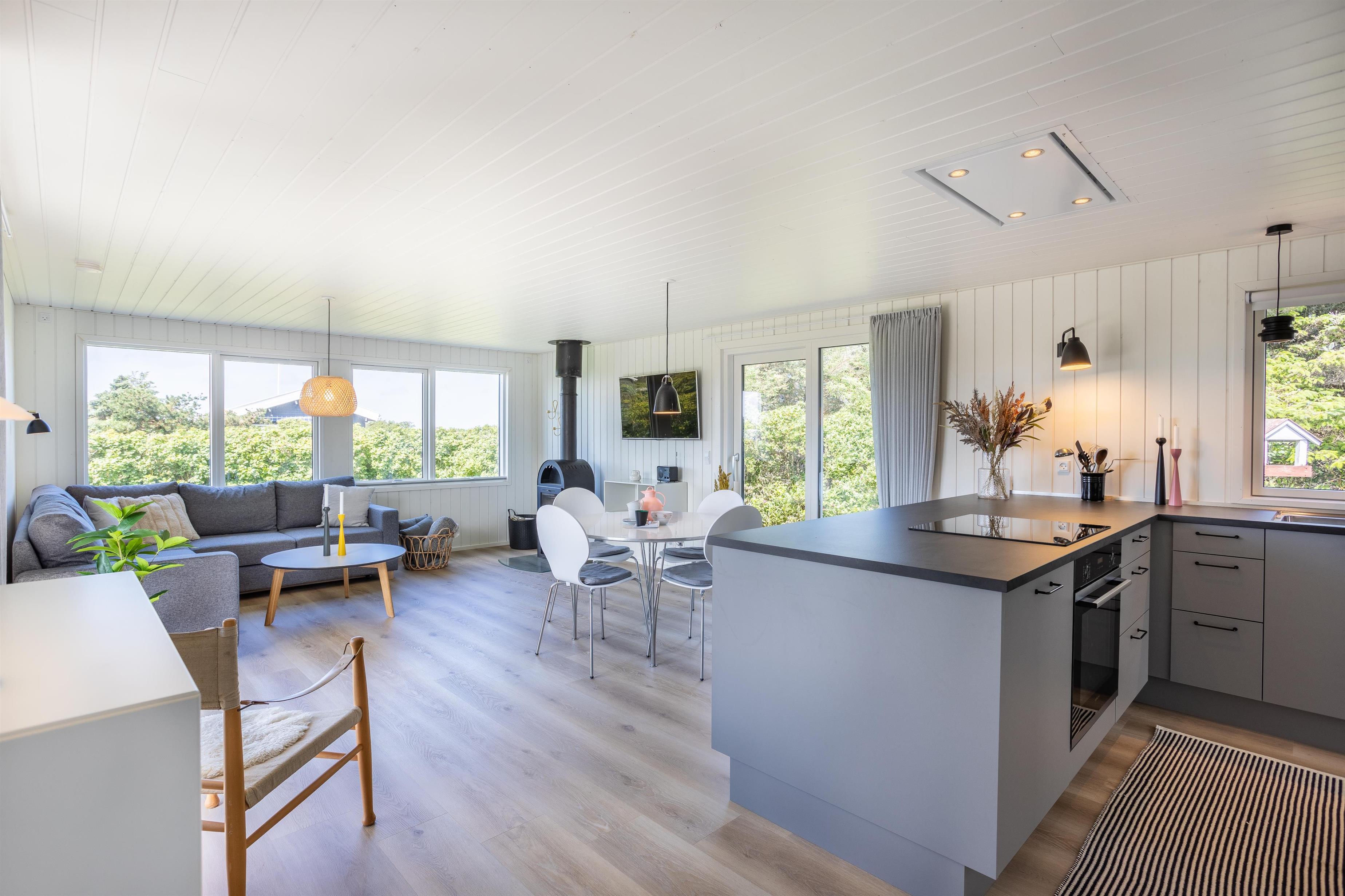 Det lyst indrettede og indbydende feriehus består af et funktionelt køkken-alrum, som fungerer som husets hjerte og samlingspunkt. Her er der plads til fælles madlavning, hyggelige måltider og lange samtaler. Fra stuen er der direkte udgang til en af terrasserne, hvor I kan nyde solen og den friske luft. I vinterhalvåret kan I tilbringe tiden indenfor og nyde lyden af den knitrende ild i brændeovnen, mens kroppen bliver varmet igennem fx efter en god, lang gåtur på stranden. Sommerhuset byder også på to gode soveværelser og et badeværelse med bruseniche. Fra gangen er der udgang til endnu en terrasse.