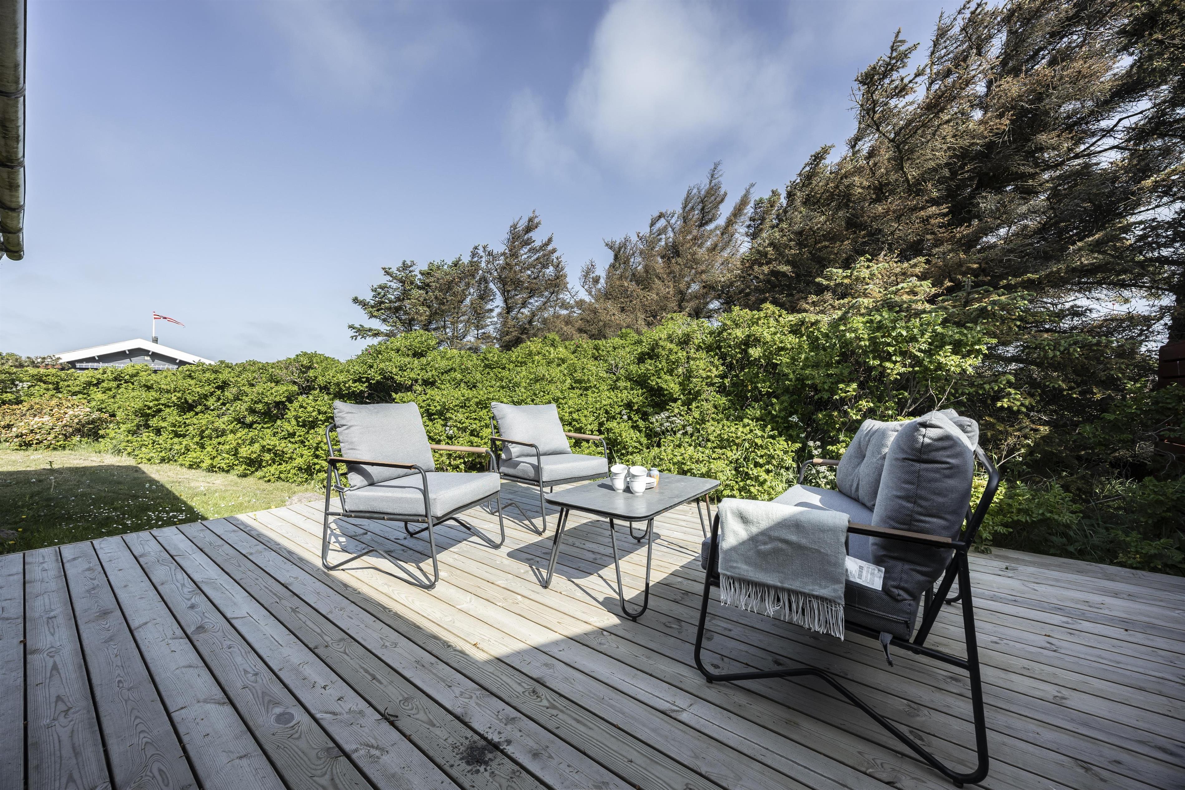 Haven er omkranset af buske og træer, så der er rig mulighed for at nyde ferien uforstyrret udendørs på en af de gode terrasser. Når duggen falder, kan I med fordel rykke ind på den overdækkede terrasse. Haven og terrasserne omkring huset indbyder til afslapning og hyggelige stunder, og har I børn med, er haven oplagt til spil og leg.