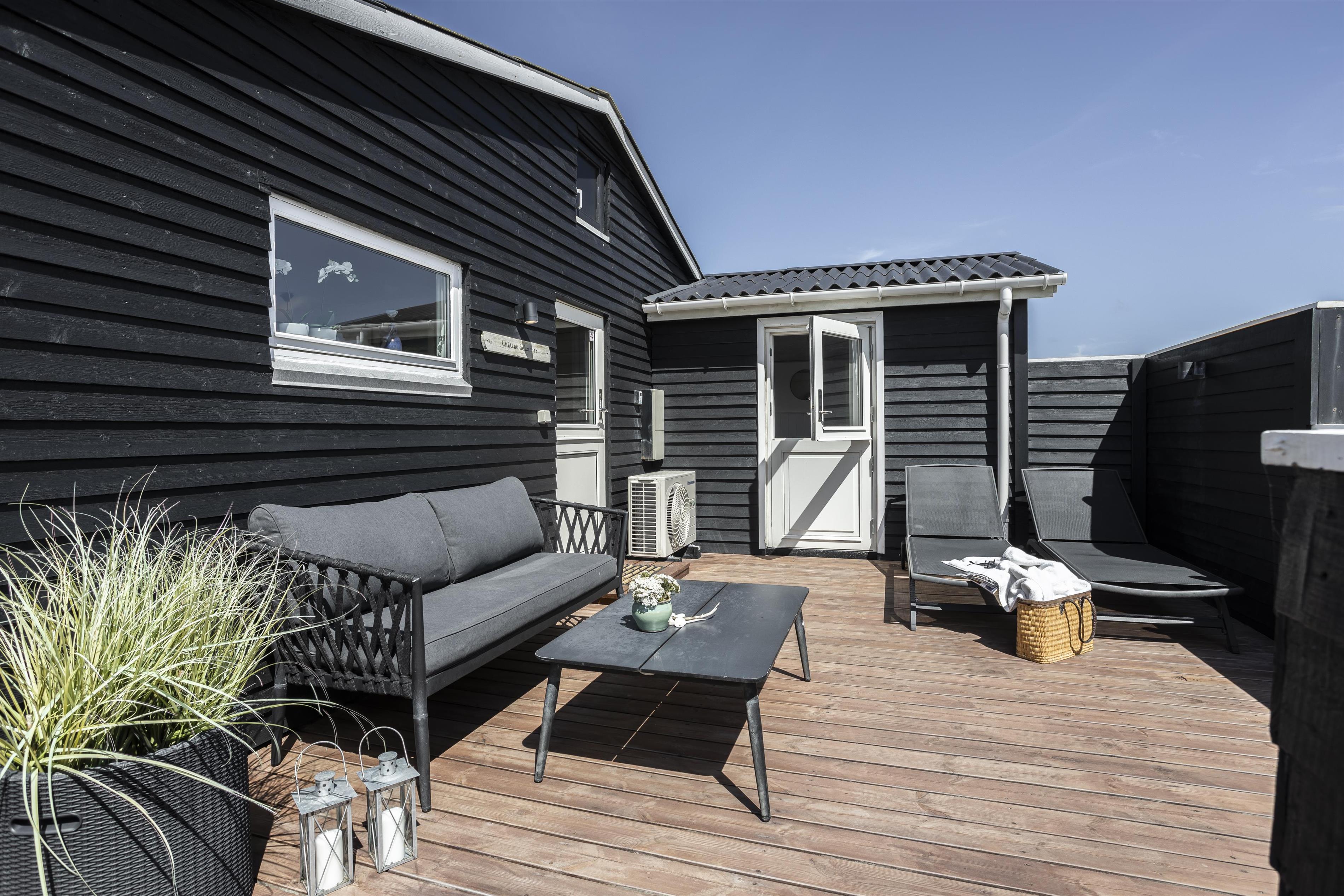 Sommerhuset ligger på en stor naturgrund og byder på flere skønne terrasser. Den ene er overdækket, og er derfor oplagt, når duggen falder, eller hvis vejret viser sig fra en drilsk side. Efter en afslappende feriedag kan I glæde jer til, at dagen går på hæld og himlen farves i den mest utrolige farvepalette - ikke to solnedgange er ens, men hver og en er fantastisk.