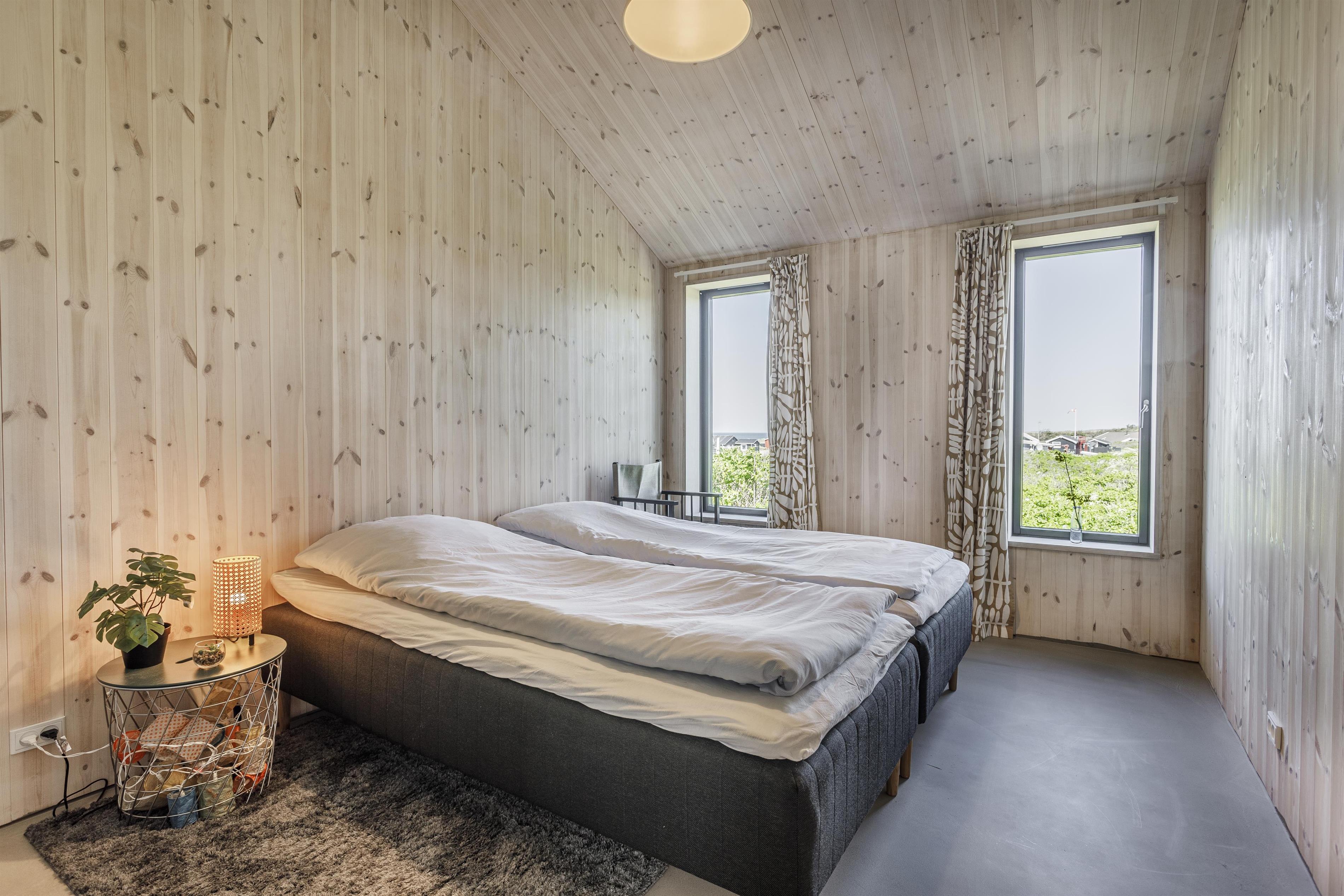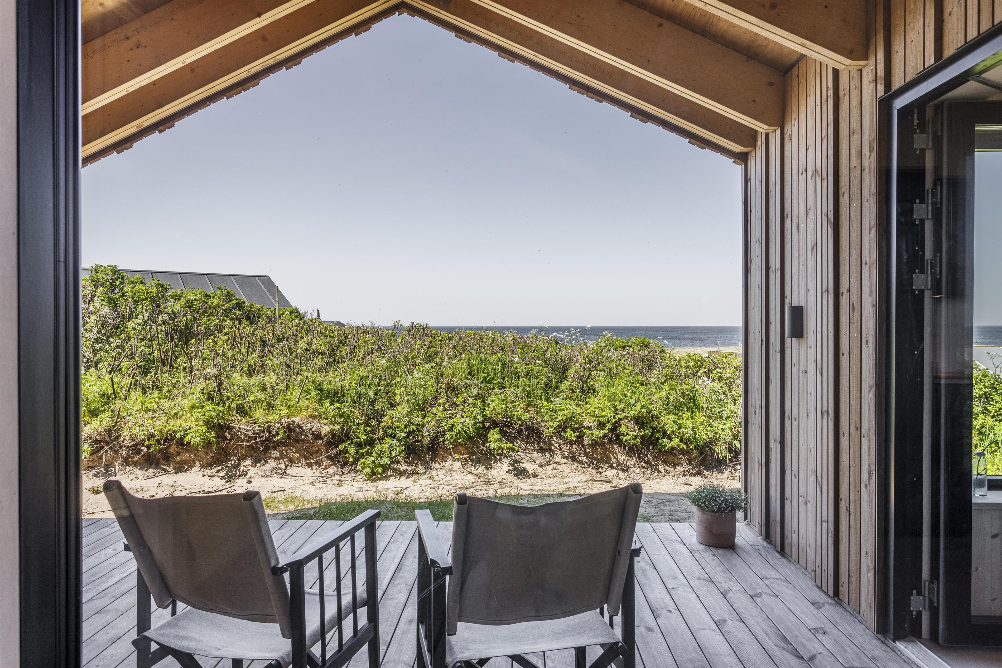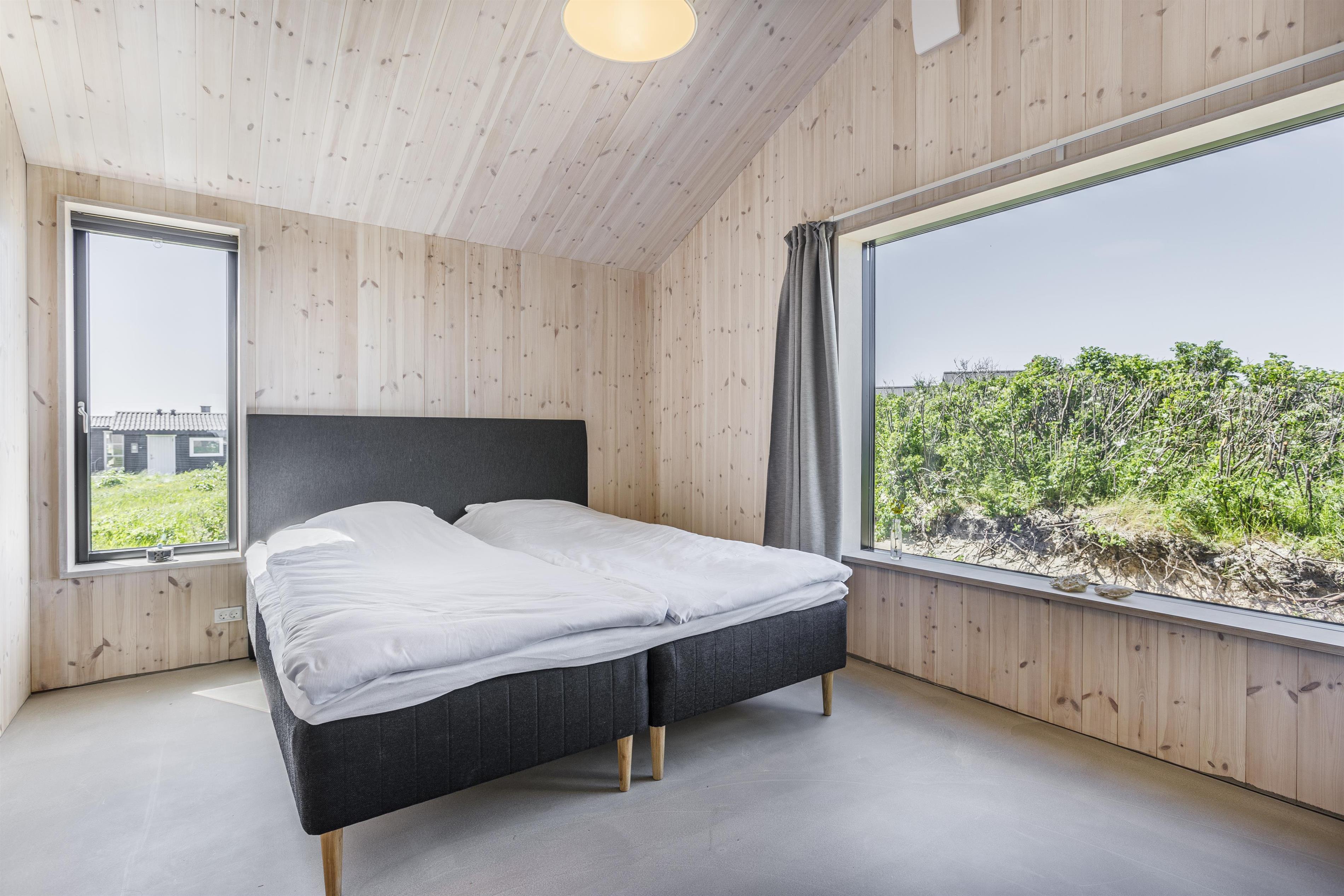 Huset er velindrettet med en dejlig rummelig entré, stor opholdsstue og køkkenalrum, samt 3 store soveværelser, alle med dobbeltsenge og havkig. Husets to badeværelser er placeret i forbindelse med soveværelserne. Fra masterbedroom er der direkte adgang til badeværelse. Husets samspil med den omgivende natur har haft højste prioritet i den rumlige disponering af huset. Alle rum er meget rummelige og med loft til kip. De store panorama vinduer i masterbedroom, opholdsstue og køkkenalrum, forstærker samspillet mellem rummene og naturen. Vinduerne er som store malerier i de skønne rum, hvor vejrliget bevirker, at ikke to dage er ens, hvad udsigten angår. Fra opholdsrummene er der adgang til to dejlige terrasser, en overdækket vestvendt terrasse og en sydvendt åben terrasse. Her kan I flytte rundt, alt efter sol og vind.