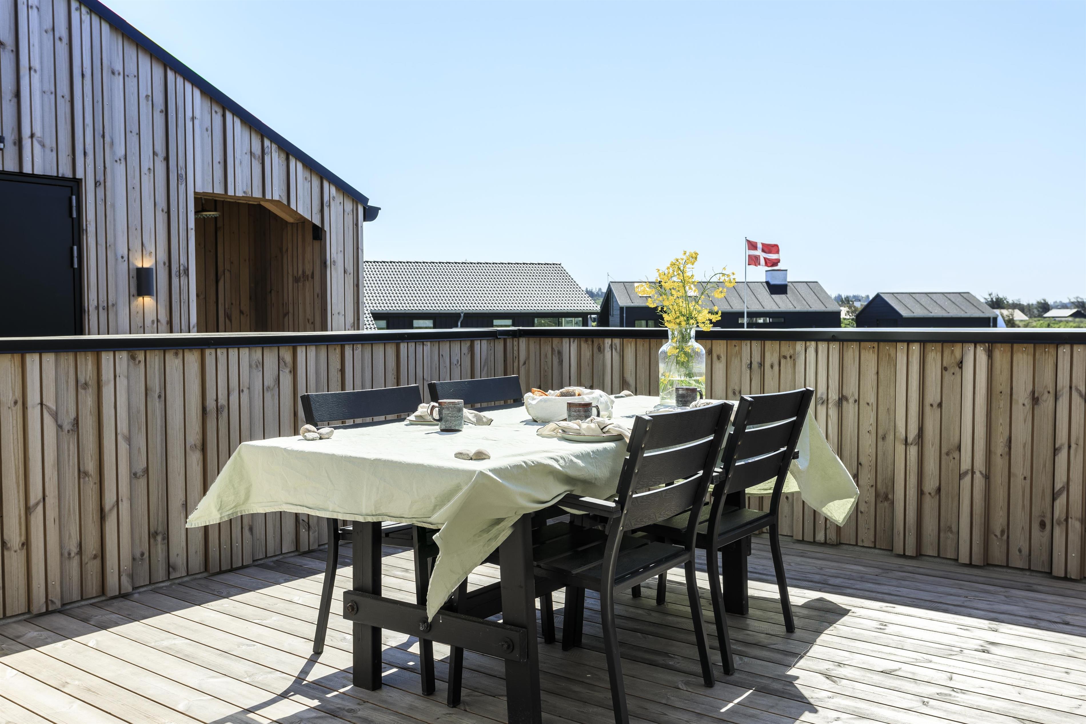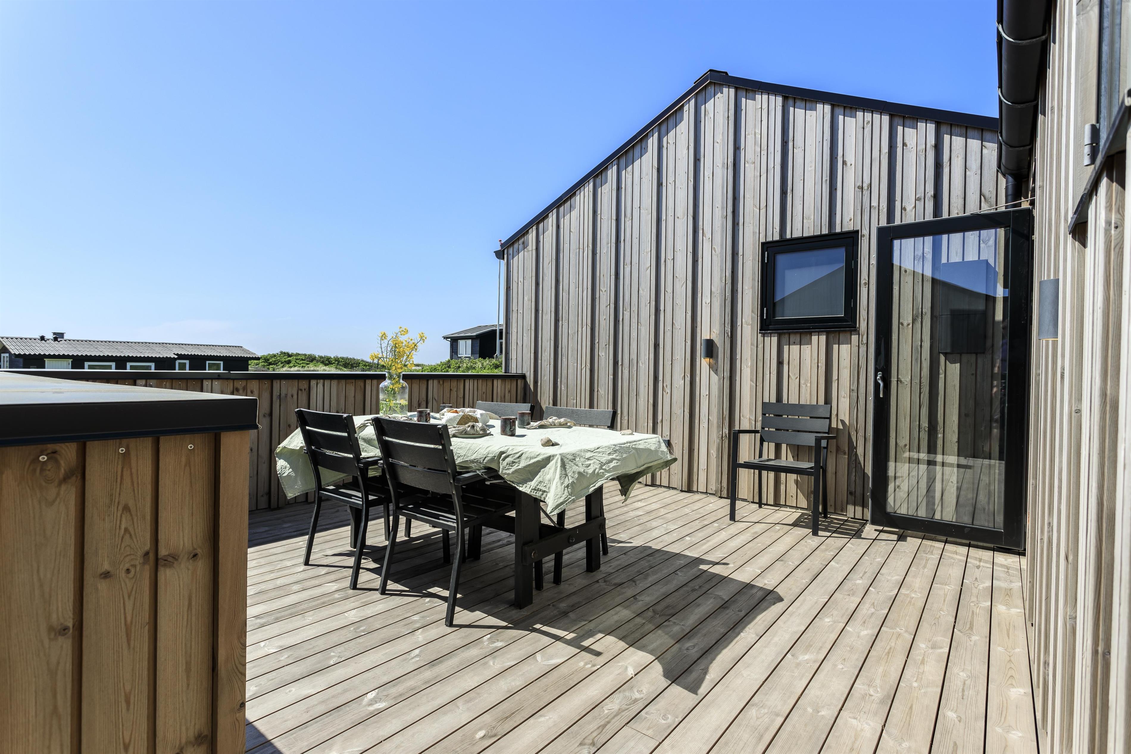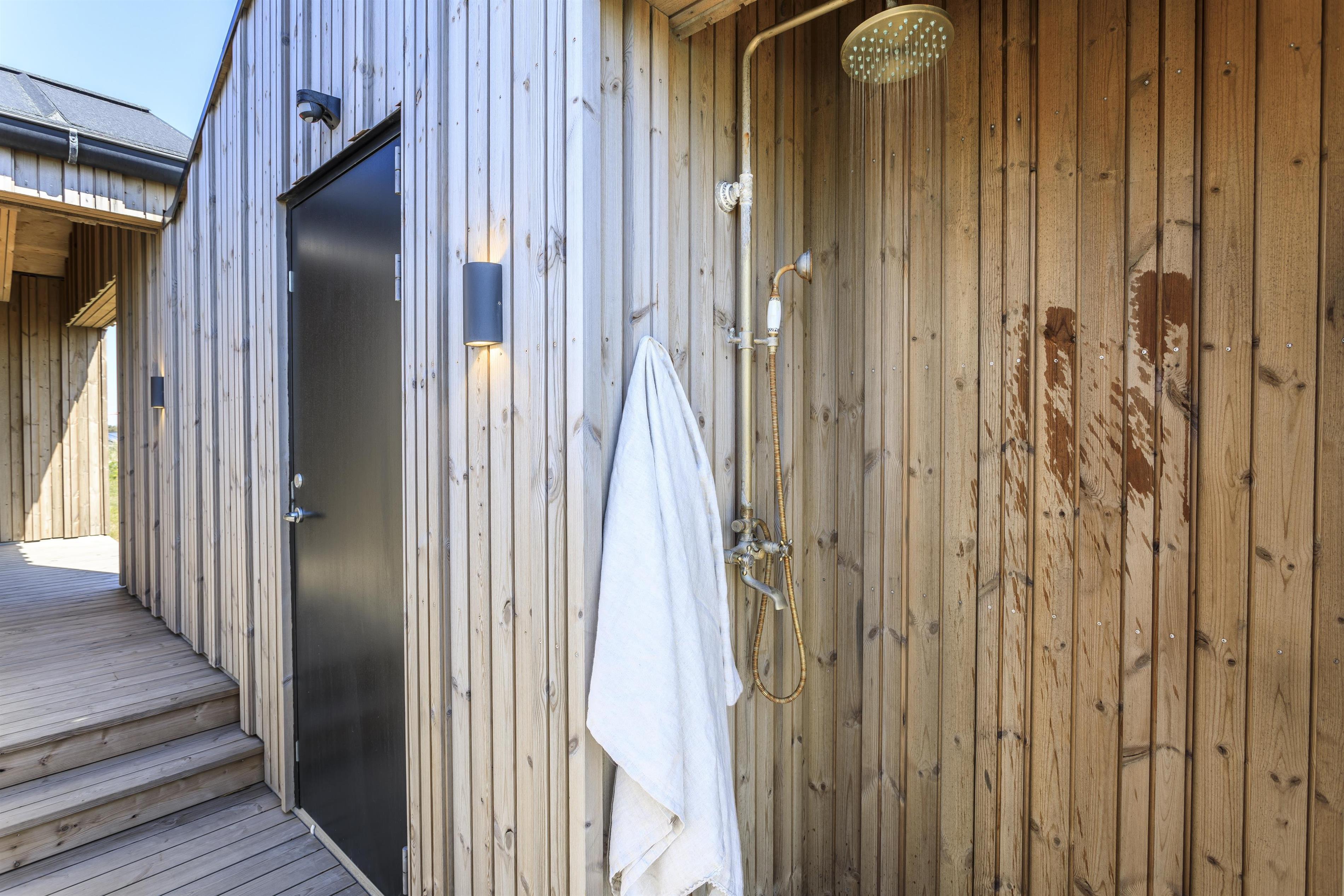 Huset byder på to dejlige terrasser, hvor den ene er omkranset af en lav væg, så I kan solbade eller nyde et dejligt måltid i læ og ganske ugeneret. Den anden terrasse er vest-vendt og overdækket, så her vil det være oplagt at trække ud til aften og nyde en lækker grillaften til synet af den mest betagende solnedgang i horisonten. I finder også en udendørs bruser ved huset, så når I har været en tur på stranden, kan I skylle sand og saltvand af kroppen. Langs grundens nordskel, finder I en lille sti, som fører direkte ned til stranden.