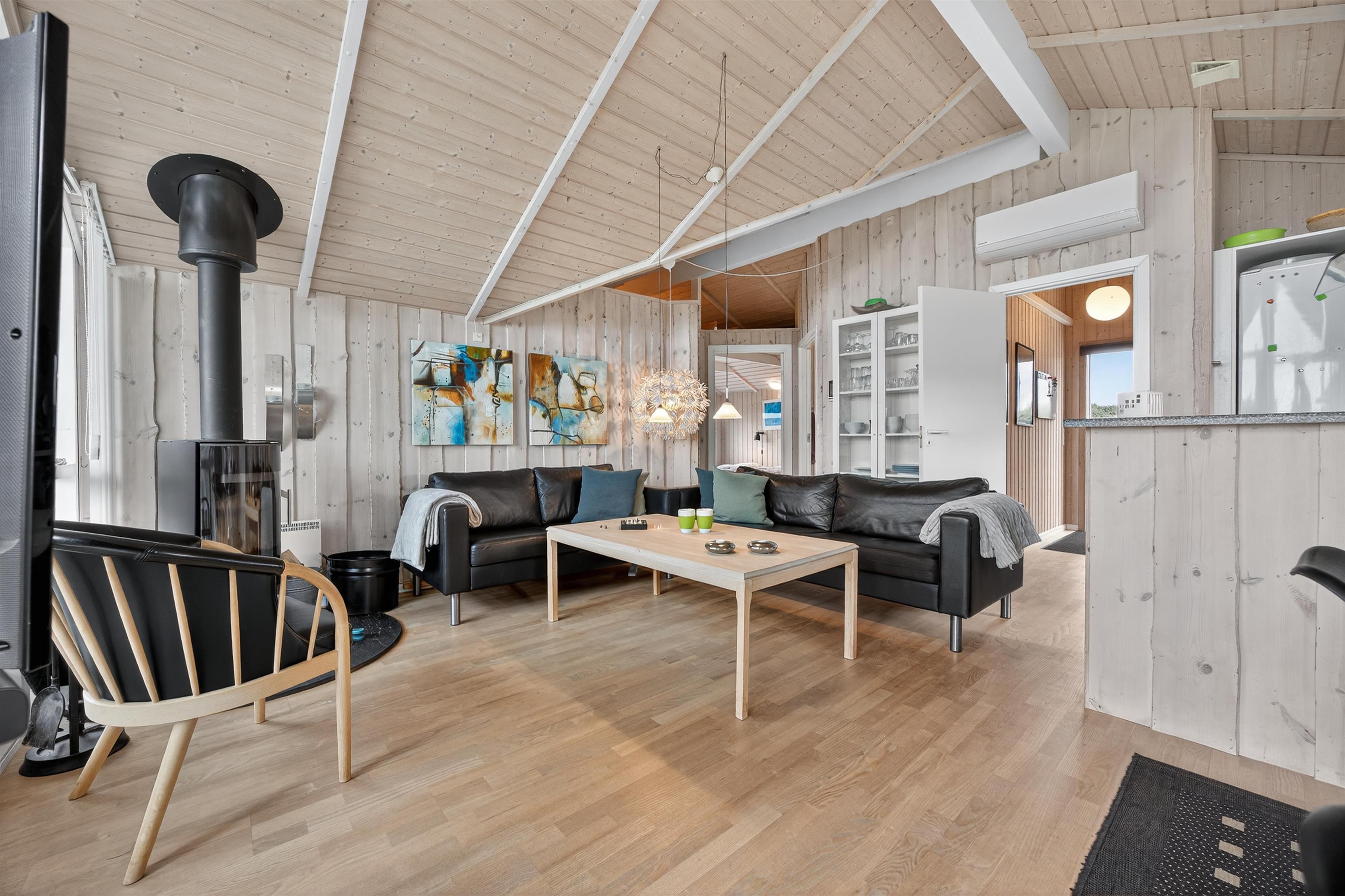 Der er to dejlige soveværelser med dobbeltsenge og et rummeligt, lyst badeværelse. I det store opholdsrum er køkken og spiseafdeling smukt forenet – her samles hele familien omkring madlavning, spil eller en god film foran den knitrende brændeovn.