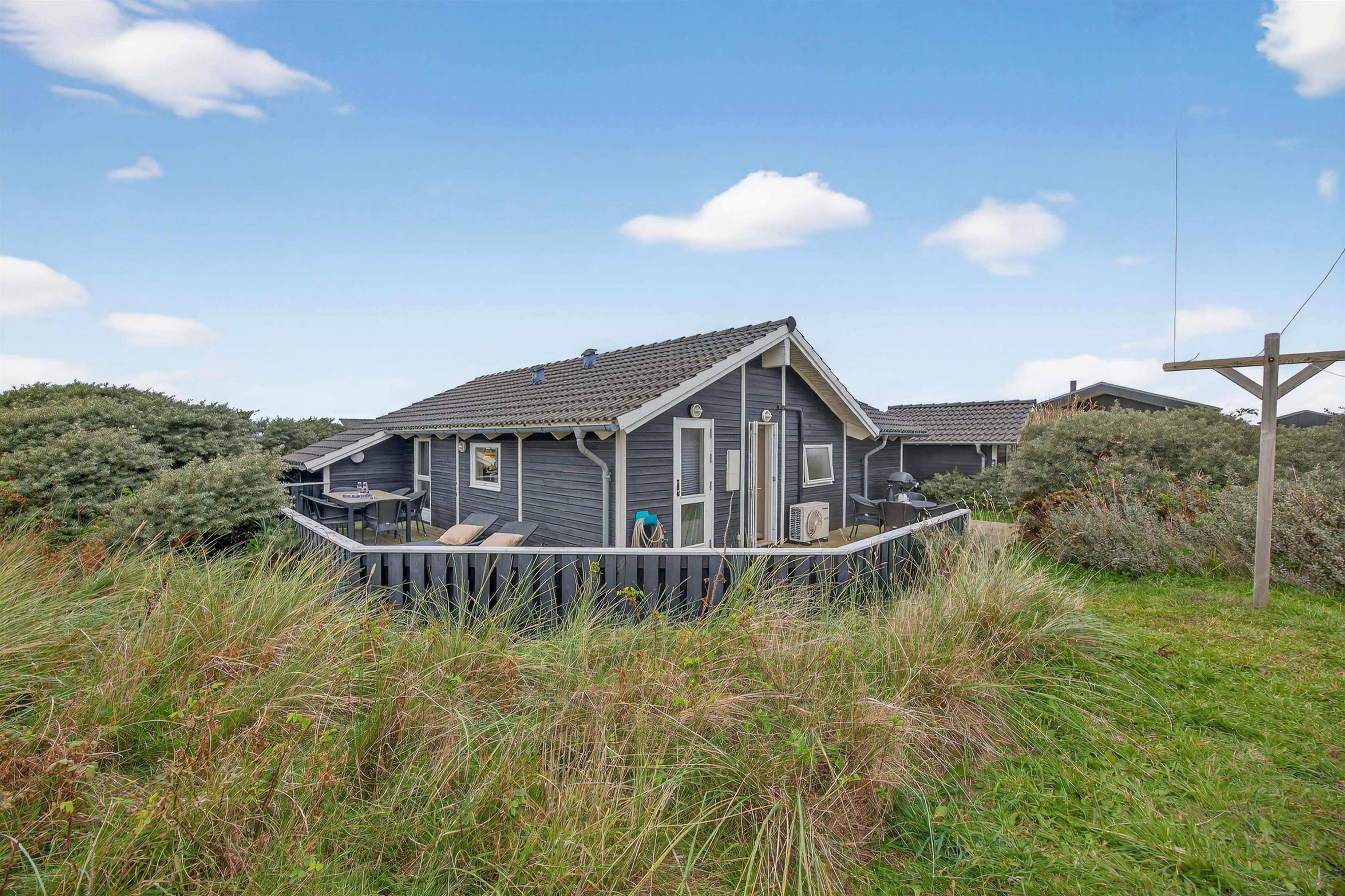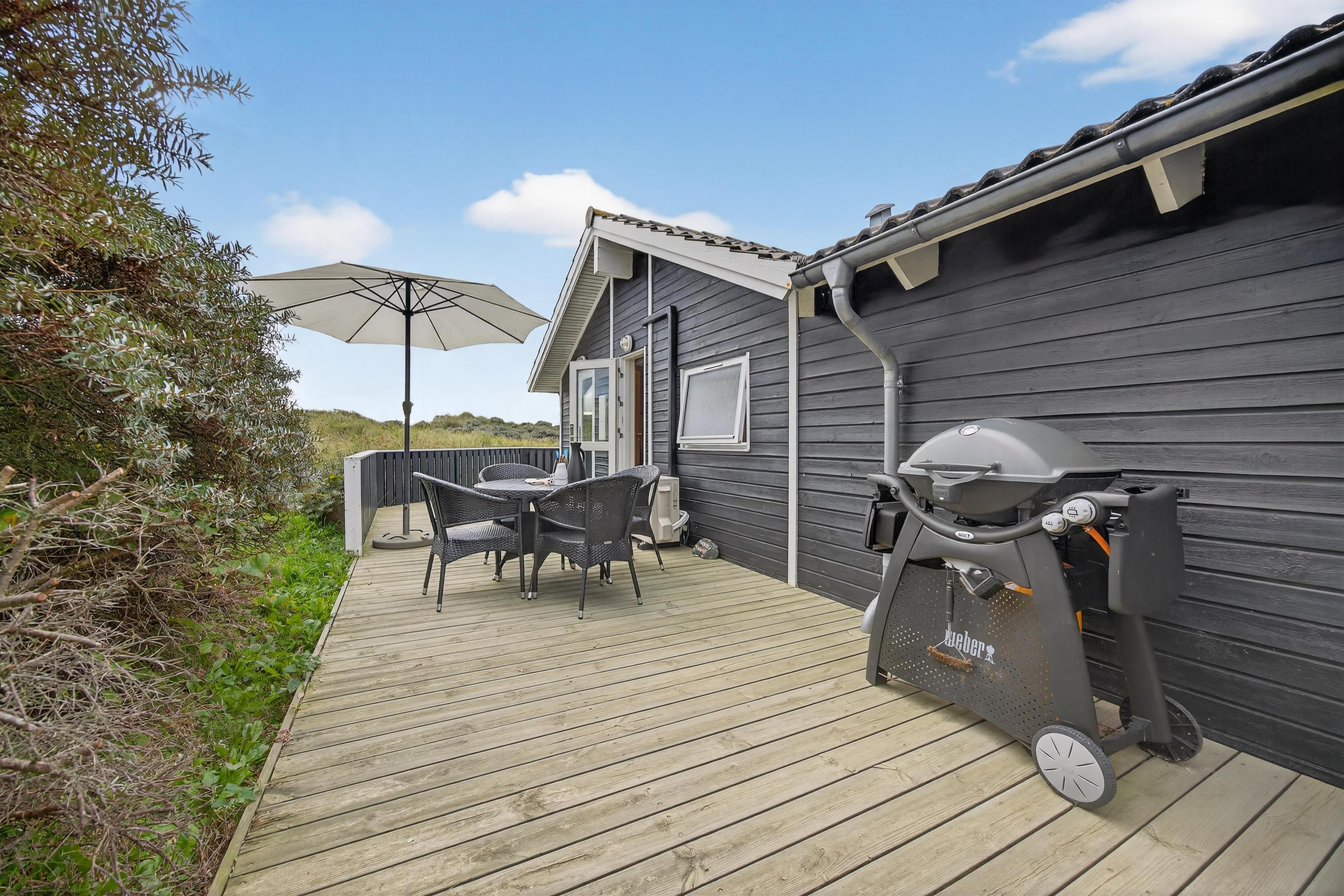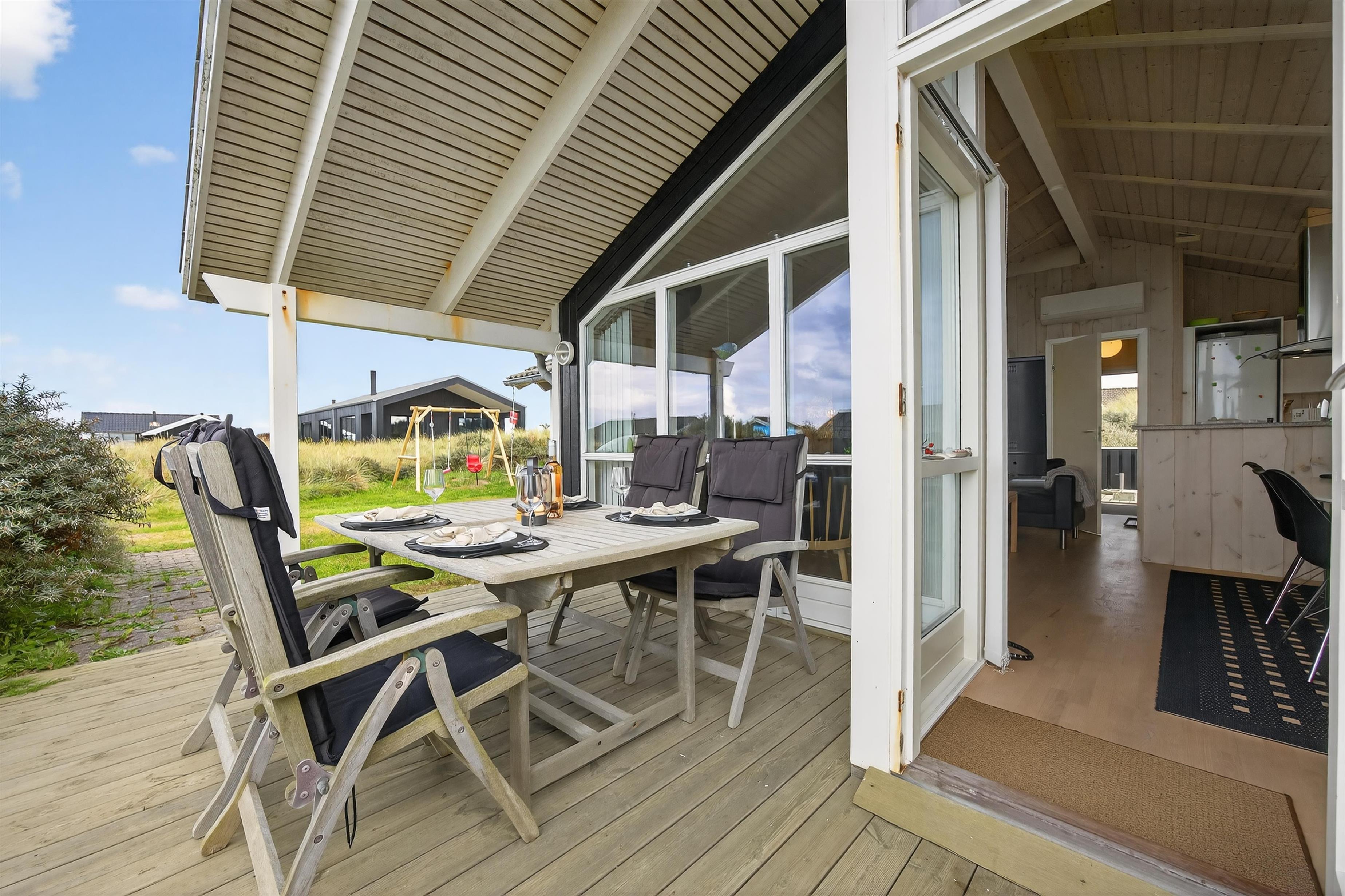 Feriehuset ligger på en ugeneret og uspoleret naturgrund, hvor man virkelig kan mærke naturens nærvær. Fra det lyse opholdsrum er der direkte adgang til en hyggelig, overdækket terrasse, hvor du kan nyde sommeraftener med solnedgangen i baggrunden, omgivet af marehalm og havtorn.