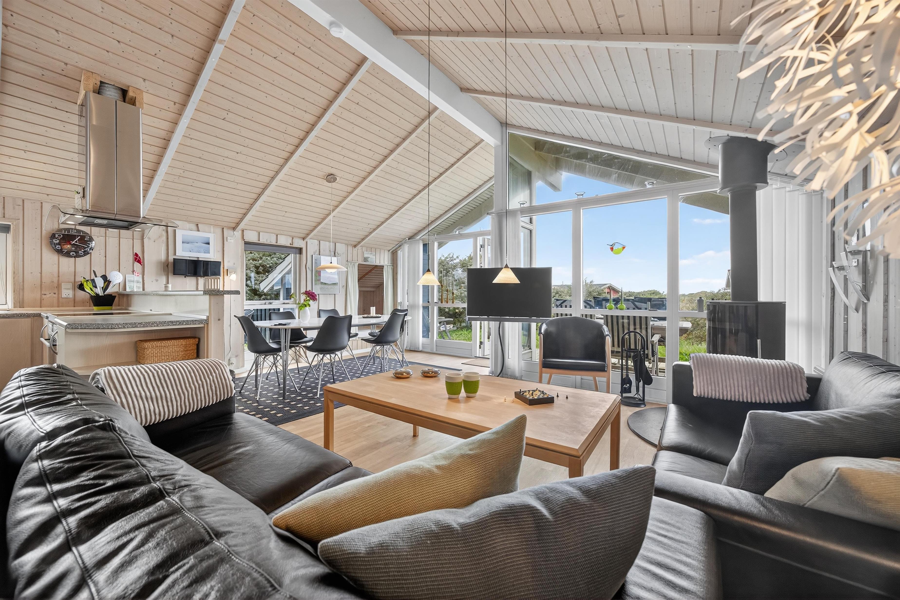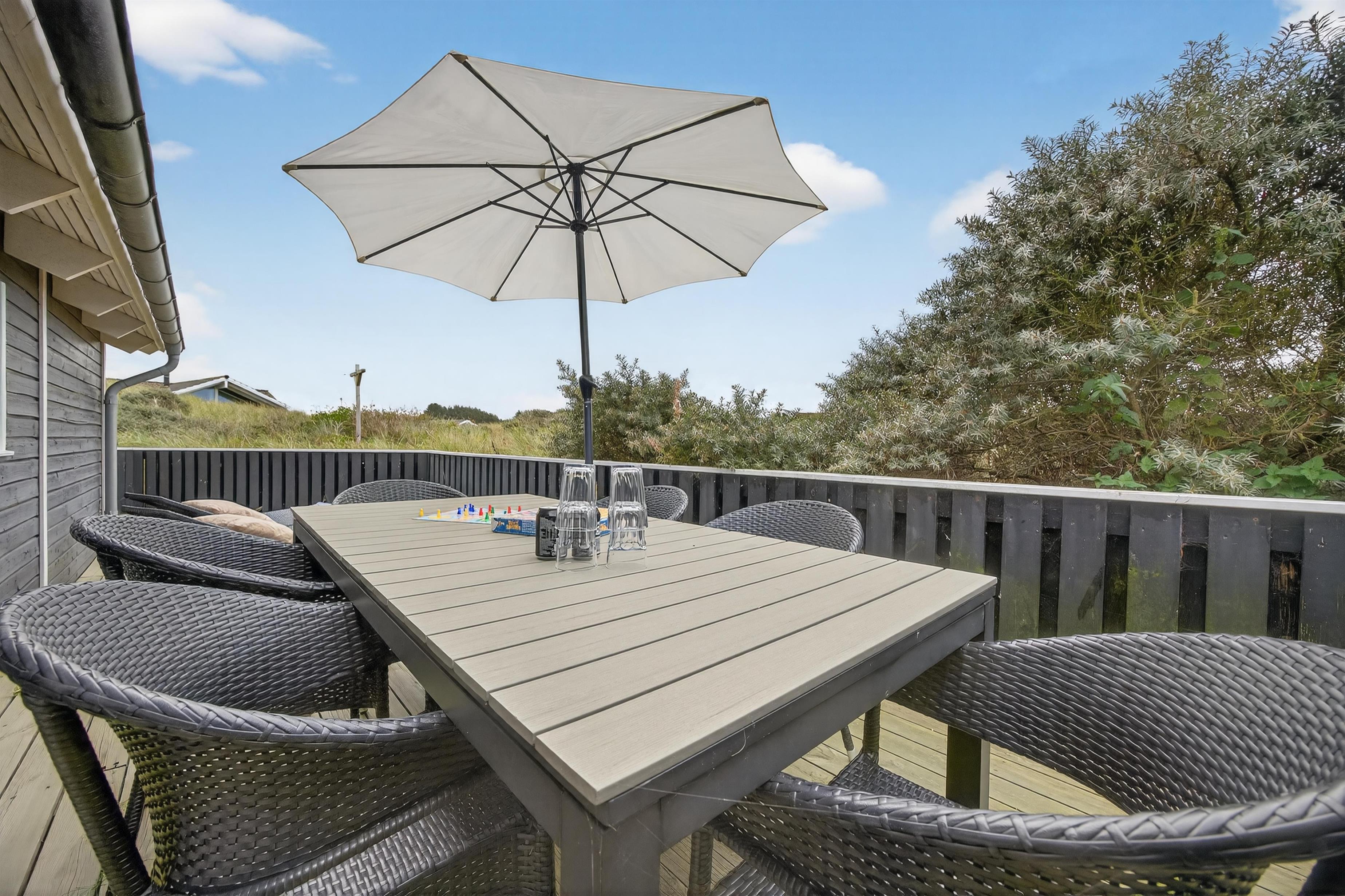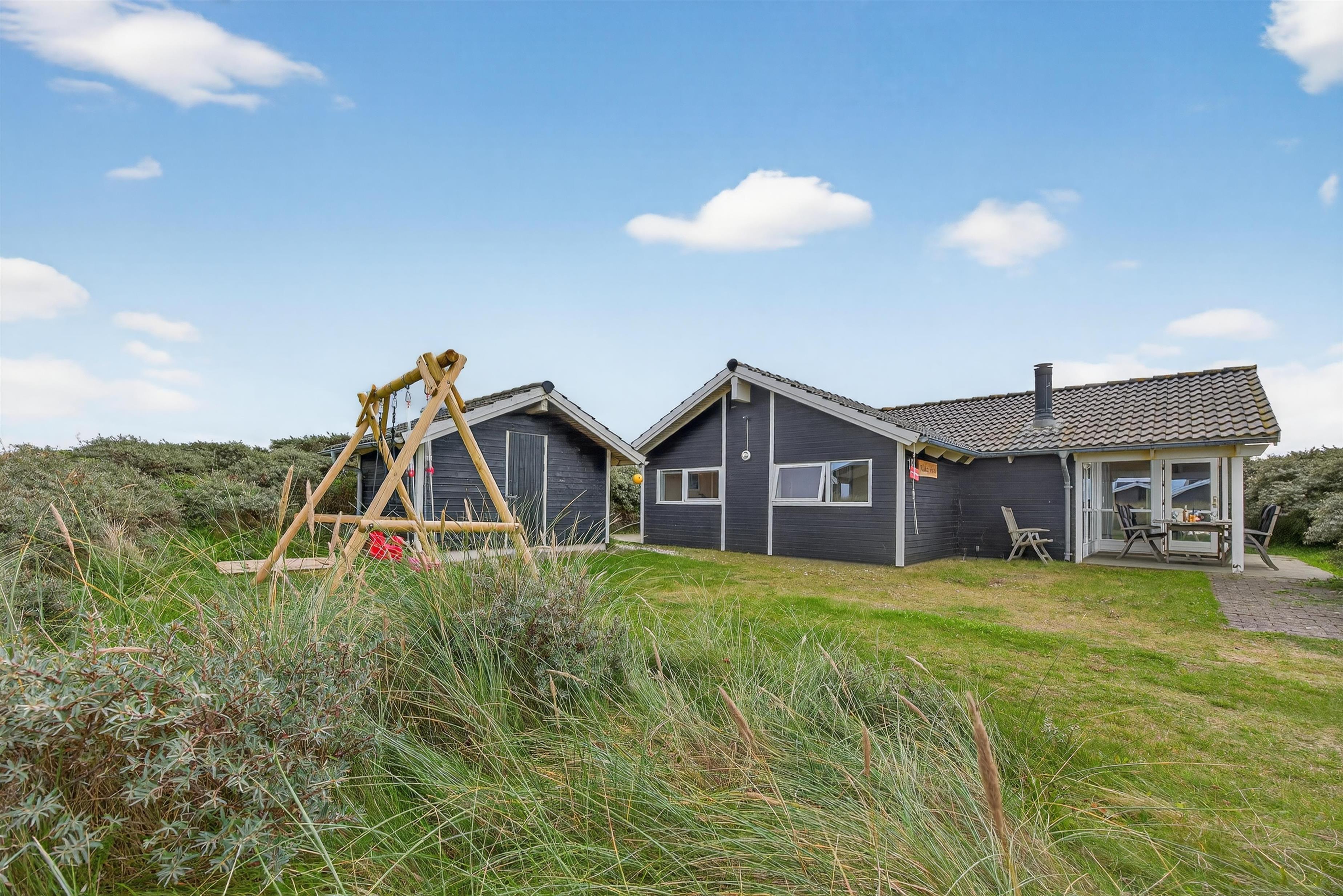 Feriehuset ligger på en ugeneret og uspoleret naturgrund, hvor man virkelig kan mærke naturens nærvær. Fra det lyse opholdsrum er der direkte adgang til en hyggelig, overdækket terrasse, hvor du kan nyde sommeraftener med solnedgangen i baggrunden, omgivet af marehalm og havtorn.