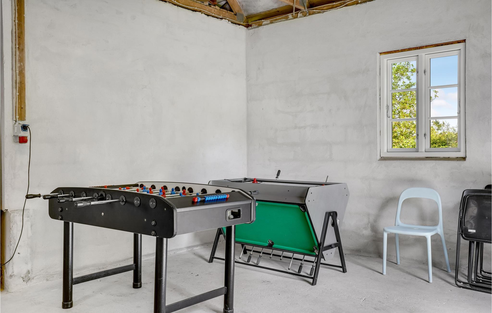 På den fynske nordkyst byder dette tidligere husmandssted jer velkommen med masser af plads og indbydende rum. Med sine bjælker og med loft til kip udstråler dette hus midt i det grønne landskab en særlig charme. Her kommer I ikke til at kede jer. Brug det store aktivitetsrum til spil, sjov og underholdning. Bordtennis, bordfodbold, billard og mange andre spil står til jeres rådighed. Men også stuen og de andre værelser, som er fordelt på to niveauer, indbyder til hyggelige stunder og masser af sjov. Husets to længer danner den perfekte ramme om den store terrasse, der tilbyder det ideelle sted til solskinsmorgener og grillaftener. En anden terrasse er let forhøjet og imponerer med en smuk udsigt over landskabet og vandet. Dans en sommerdans i haven og forsøg at slå vejrmøller.