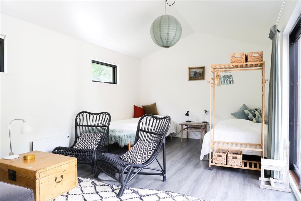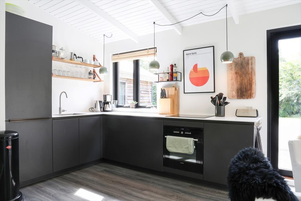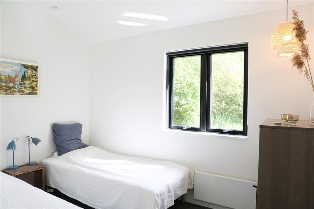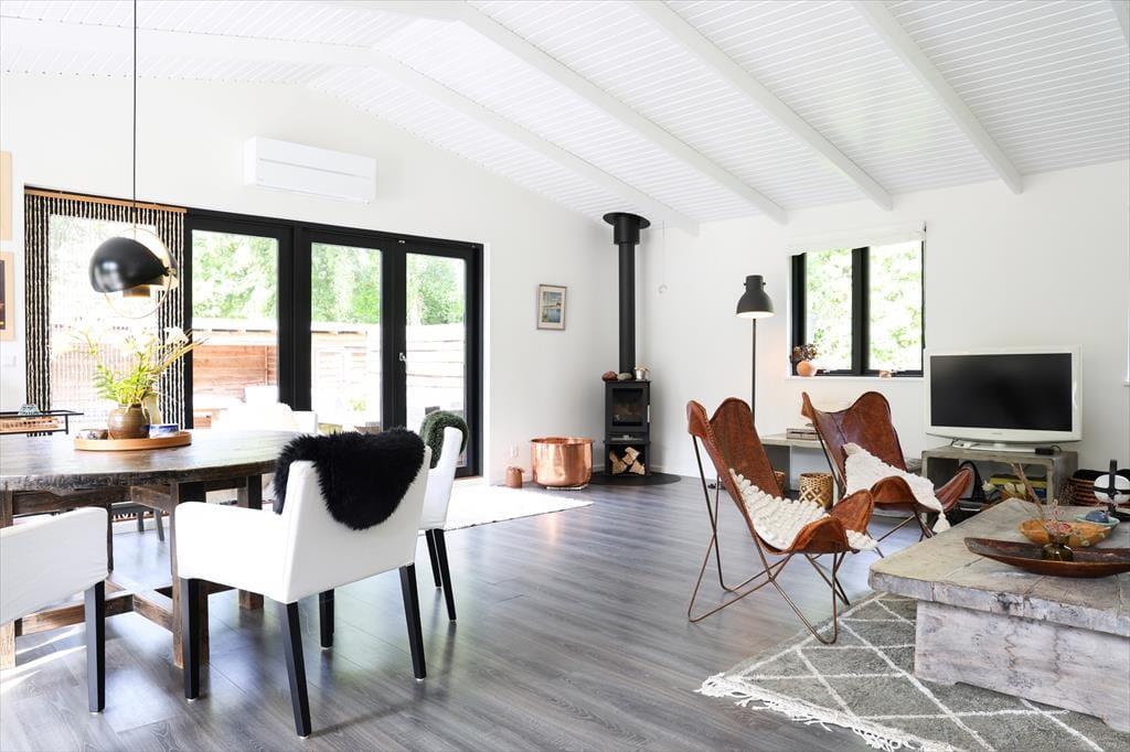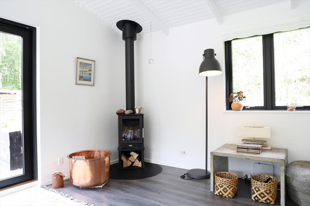 Huset indeholder stor entré og dejligt badeværelse med brus og spabad. Tankerne henledes straks til sommerhus idyl og når I træder ind, vil jeres skuldre snart sænke sig. Med den flotte indretning og det gode lysindfald, emmer her af ro og det er ikke svært at forestille sig en feriemorgen, hvor kaffen brygges i det smukke åbne køkken, mens familiens medlemmer indfinder sig omkring spisebordet for at planlægge dagen. Huset indeholder stor entré og dejligt badeværelse med brus og karbad. Soveværelserne er rummelige og smagfuldt indrettede med store behagelige senge samt opbevaringsplads. I den store stue er der varmepumpe, Apple TV og brændeovn, samt store panoramavinduer med fantastisk udsyn til den smukke terrasse og store have, hvor rådyrene krydser jævnligt. Køkkenet er åbent og moderne og indeholder opvaskemaskine. Terrassen har flere gode kroge, som gør, at solen kan nydes dagen igennem og om aftenen kan den hyggelige overdækkede terrasse give max hygge på de lange sommeraftener.